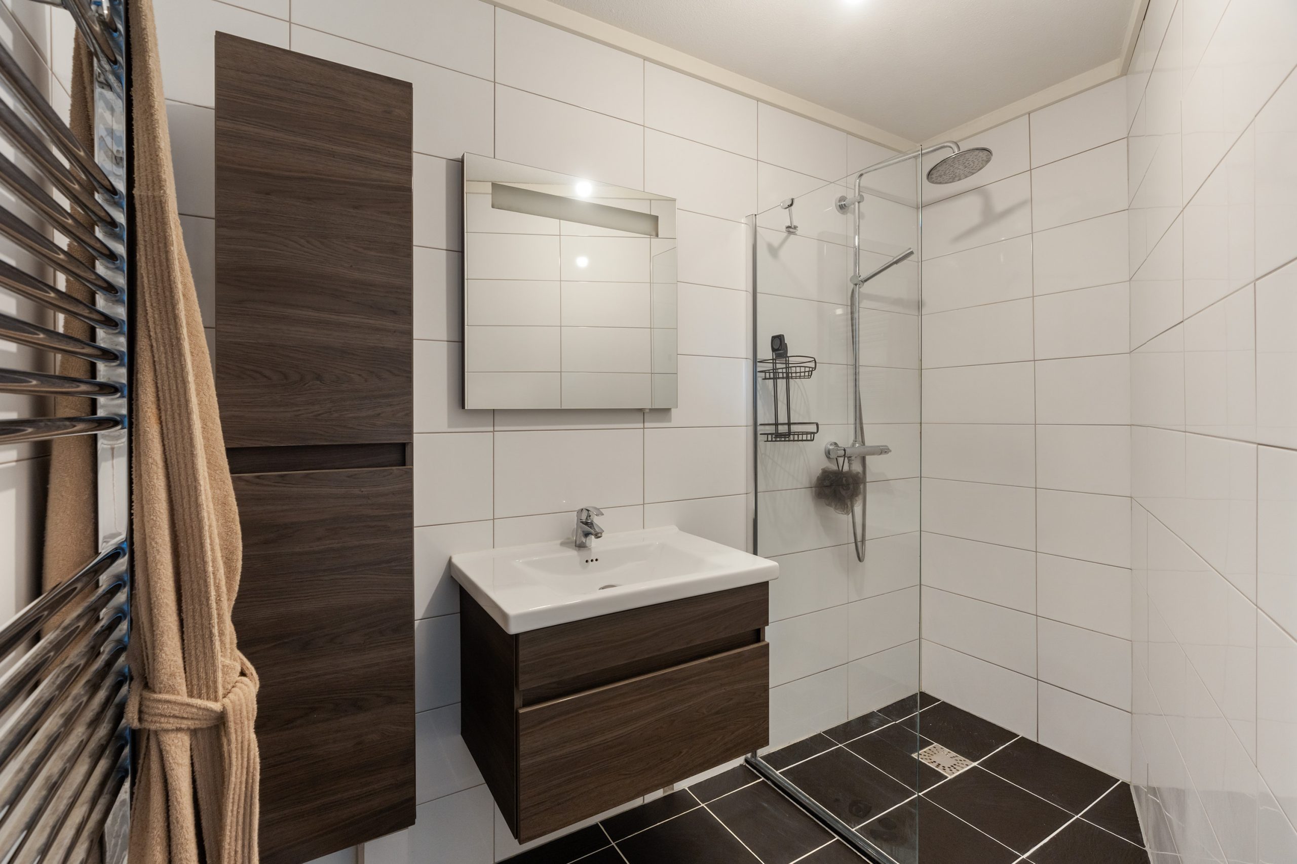 Aan de achterzijde van de woning bevinden zich twee goed bemeten slaapkamers. Beide ruim genoeg om volledig naar wens in te richten, of het nu gaat om een master bedroom, een werkkamer of een logeerkamer. De volledig betegelde badkamer is keurig afgewerkt en voorzien van een modern wastafelmeubel, een opbergkast, een spiegel met verlichting en een inloopdouche met rainshower. Een aangename plek om de dag fris te starten of ontspannen af te sluiten.