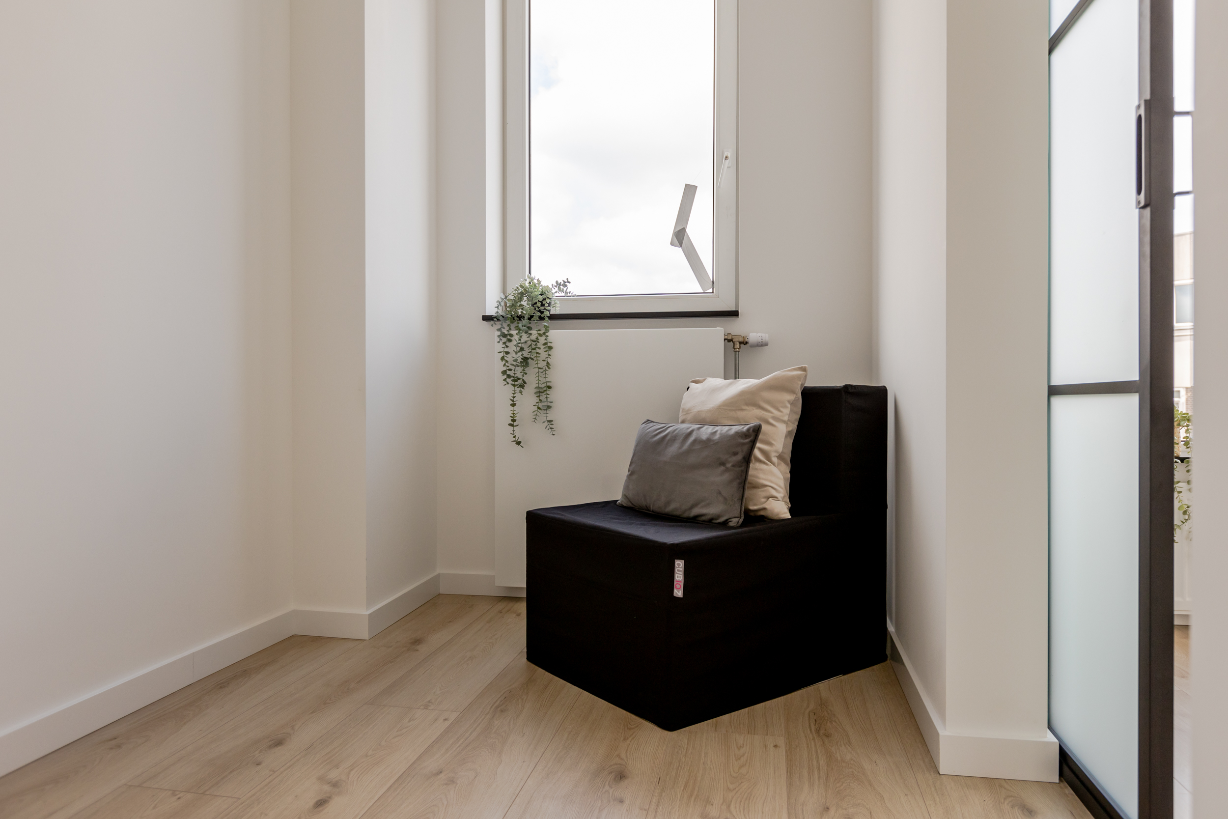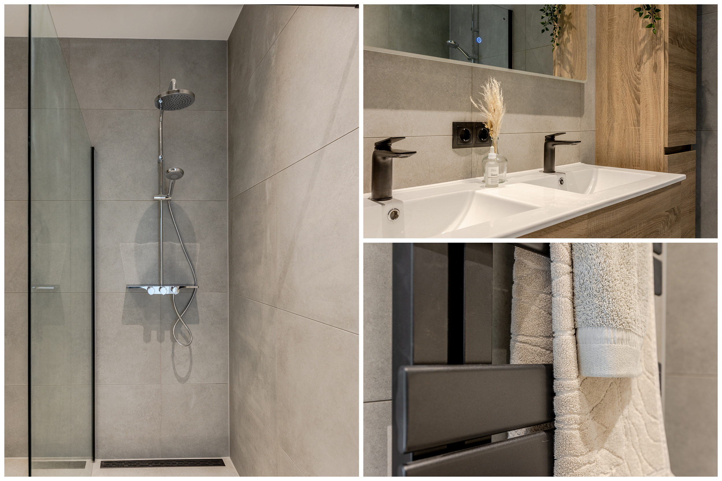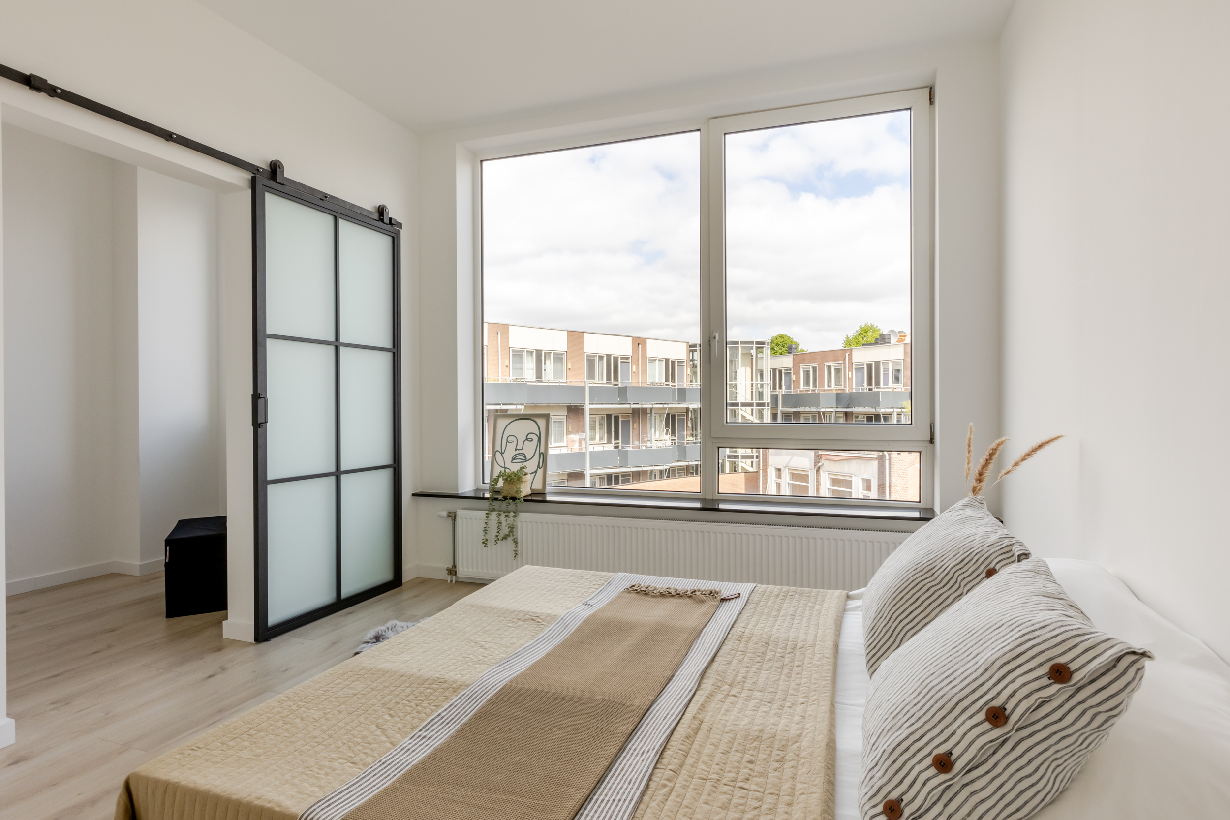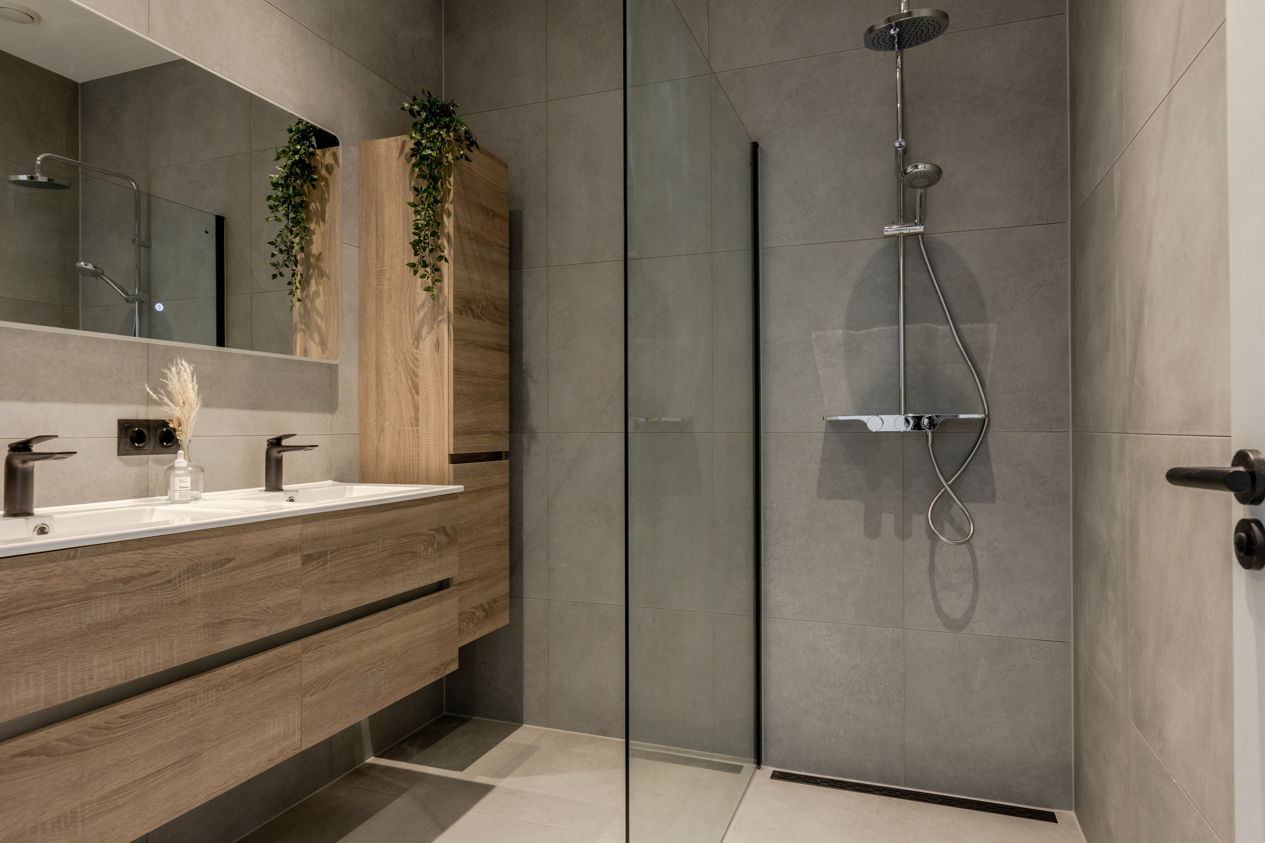 Aan de andere zijde bevinden twee slaapkamers op het noorden, van elkaar gescheiden door een stoere industriële glazen schuifdeur. Hoe gaaf is dat! Perfect om de hoofdslaapkamer te combineren met een inloopkast of een rustige werkplek. De indeling kun je helemaal aanpassen aan jouw woonwensen. De badkamer straalt rust en luxe uit, dankzij de grote, stijlvolle tegels. Daarnaast is de ruimte uitgerust met een inloopdouche, een dubbel wastafelmeubel en een handdoekradiator. Terug in de hal is het separate toilet met fonteintje en een vaste kast te vinden.