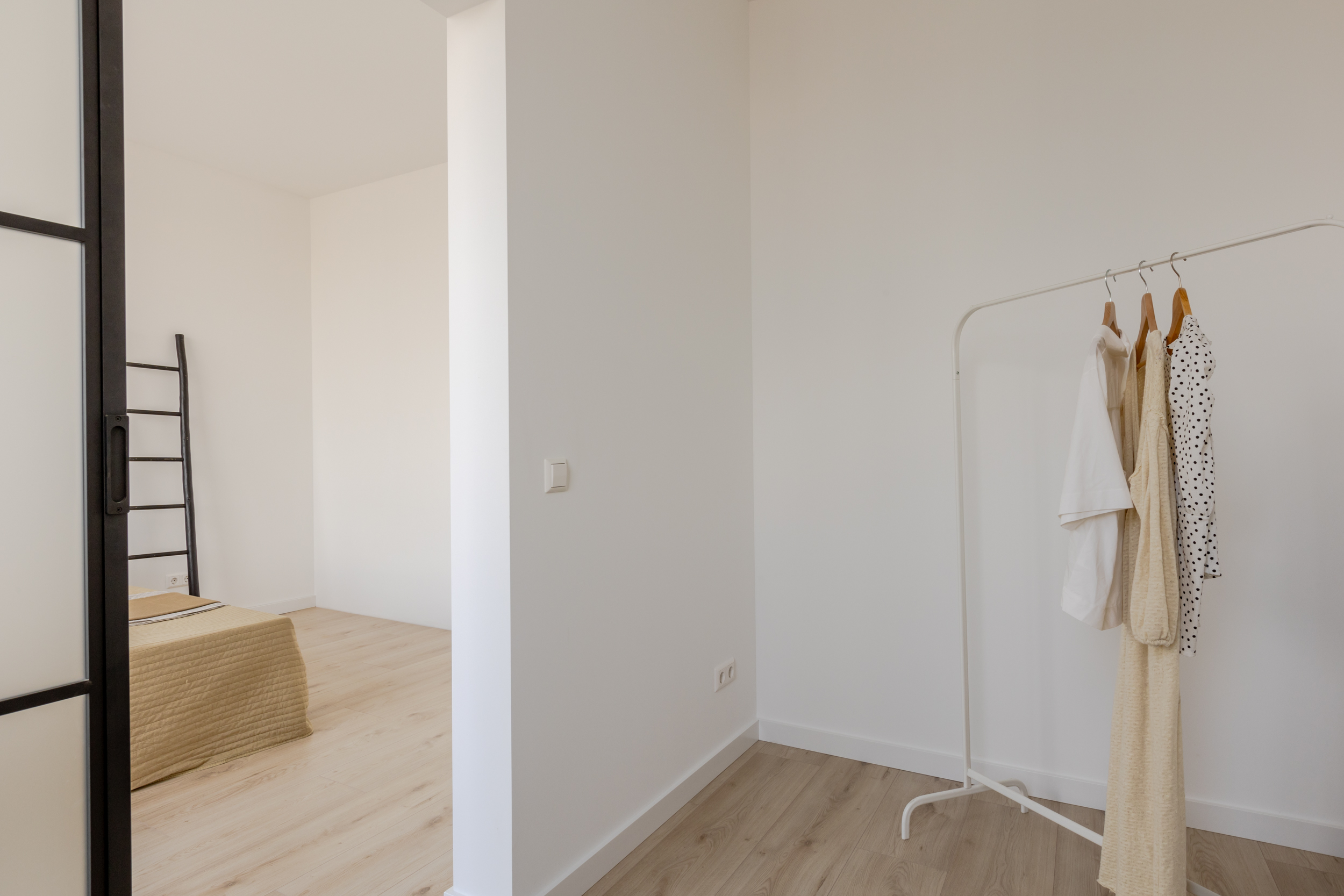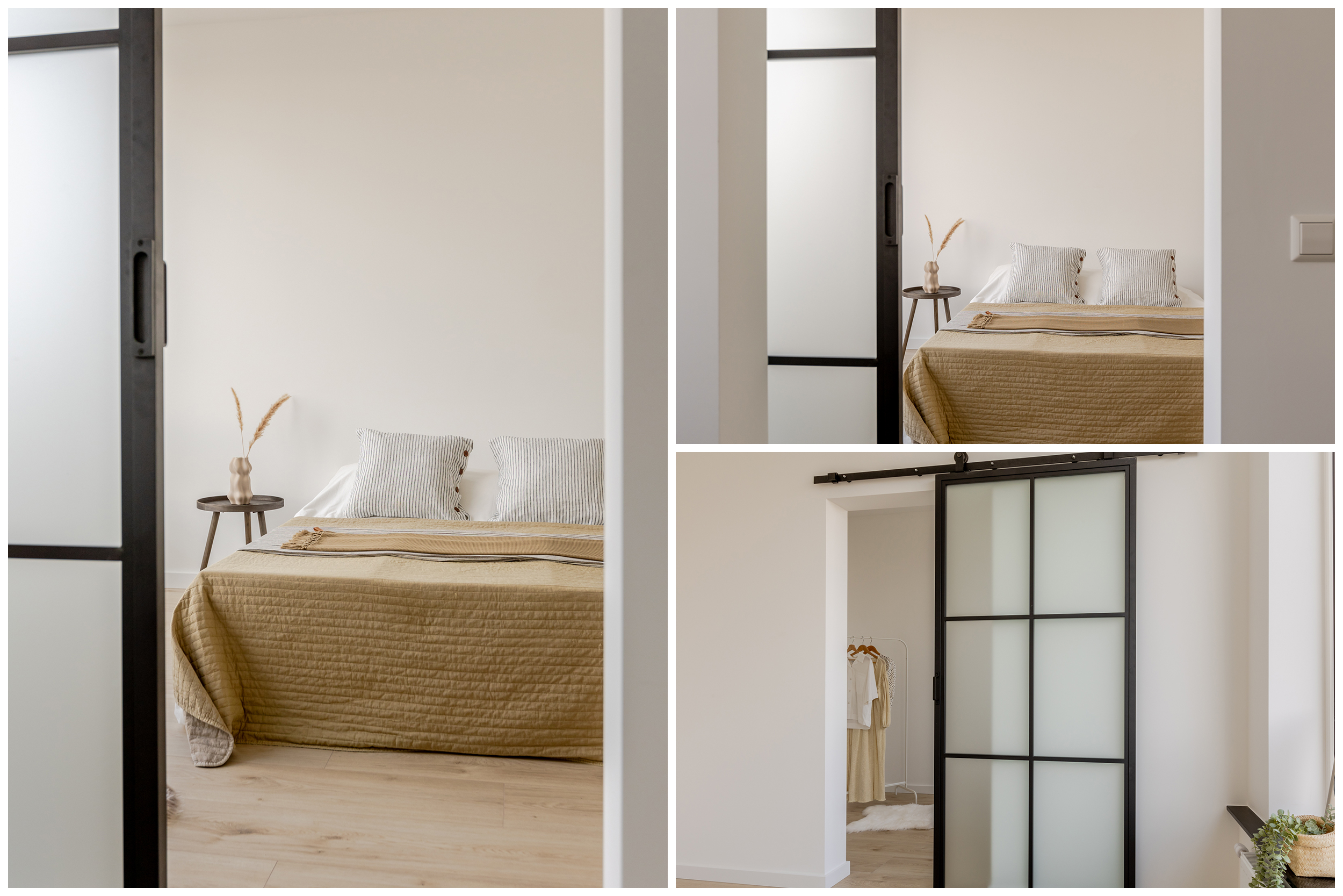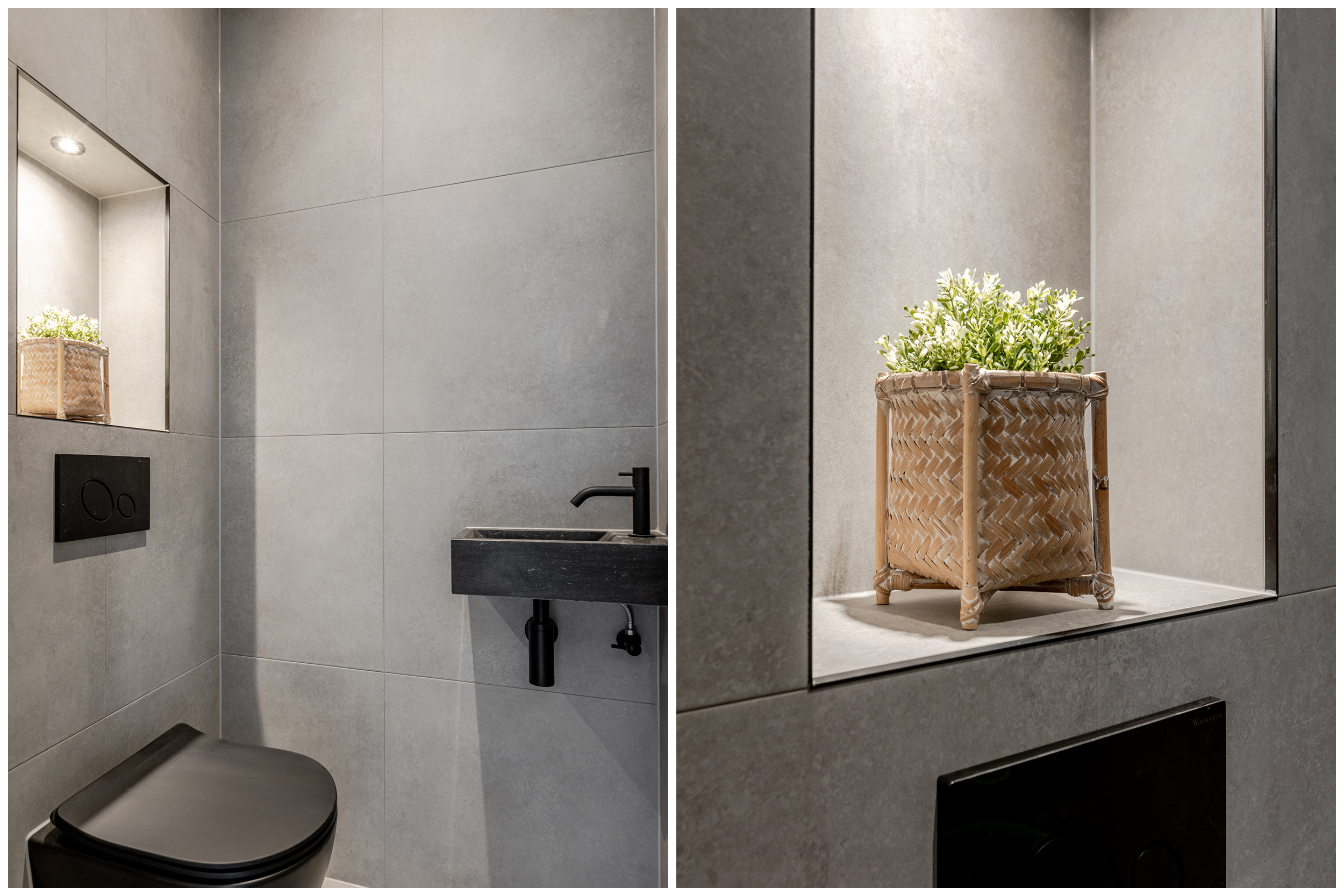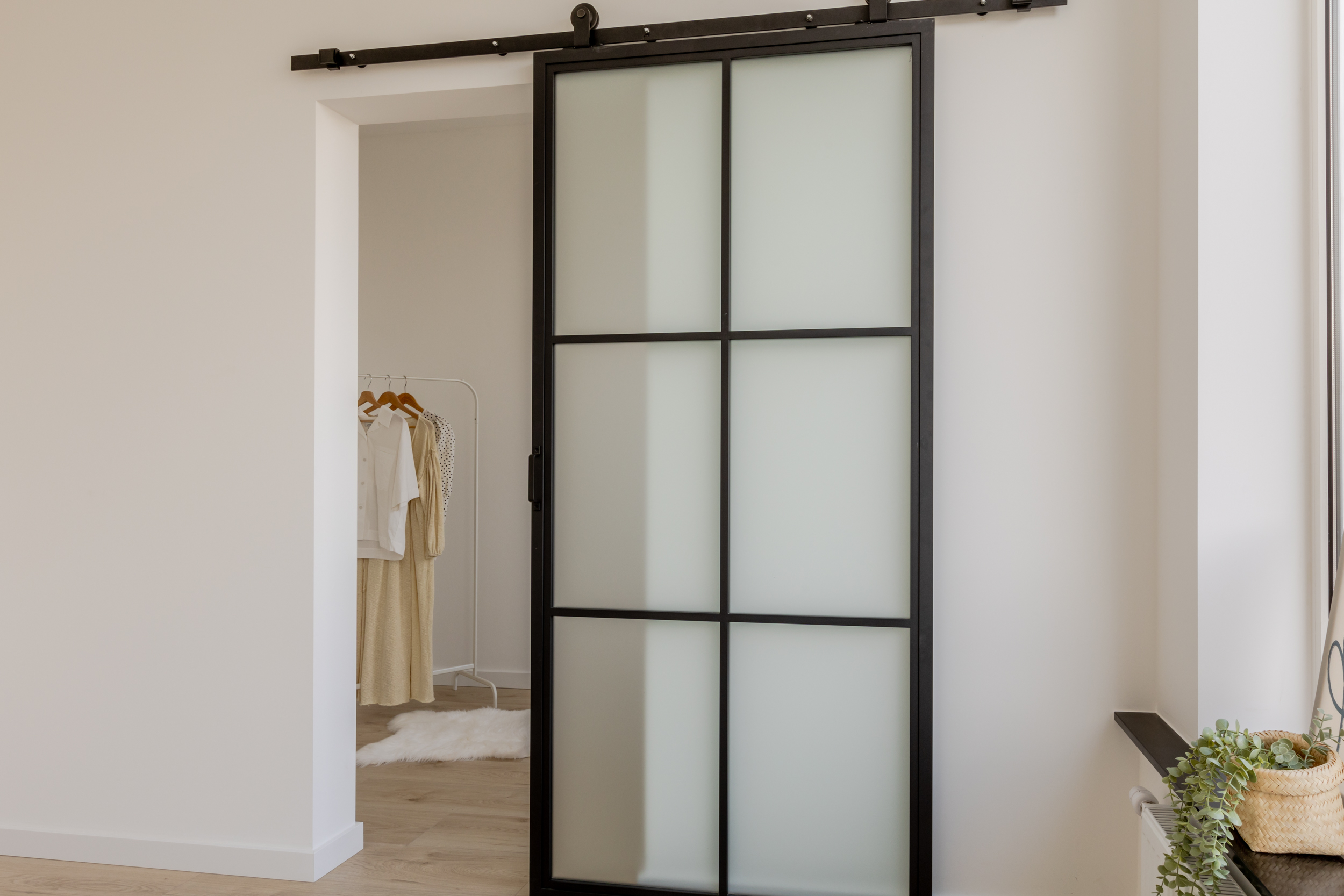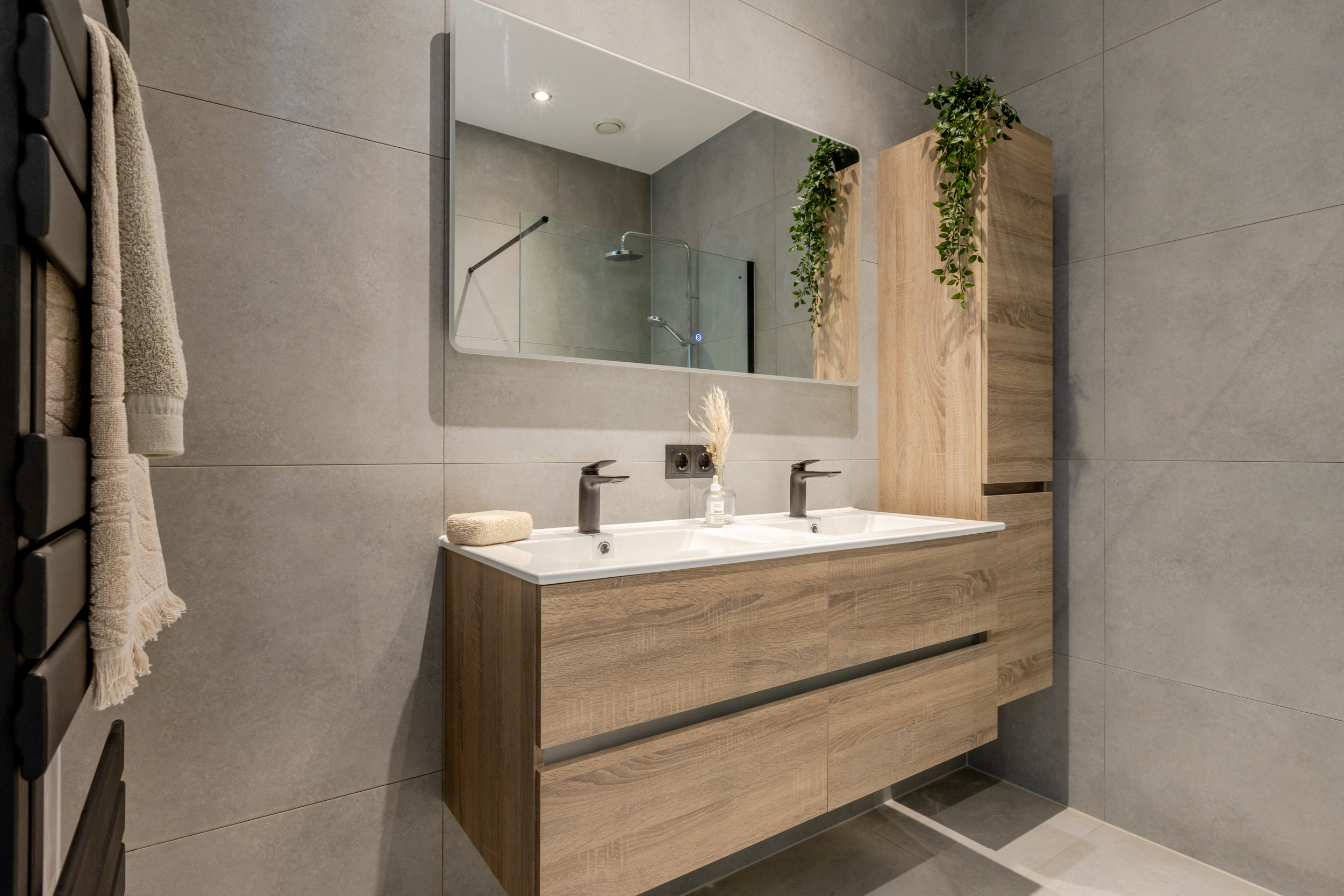 Aan de andere zijde bevinden twee slaapkamers op het noorden, van elkaar gescheiden door een stoere industriële glazen schuifdeur. Hoe gaaf is dat! Perfect om de hoofdslaapkamer te combineren met een inloopkast of een rustige werkplek. De indeling kun je helemaal aanpassen aan jouw woonwensen. De badkamer straalt rust en luxe uit, dankzij de grote, stijlvolle tegels. Daarnaast is de ruimte uitgerust met een inloopdouche, een dubbel wastafelmeubel en een handdoekradiator. Terug in de hal is het separate toilet met fonteintje en een vaste kast te vinden.