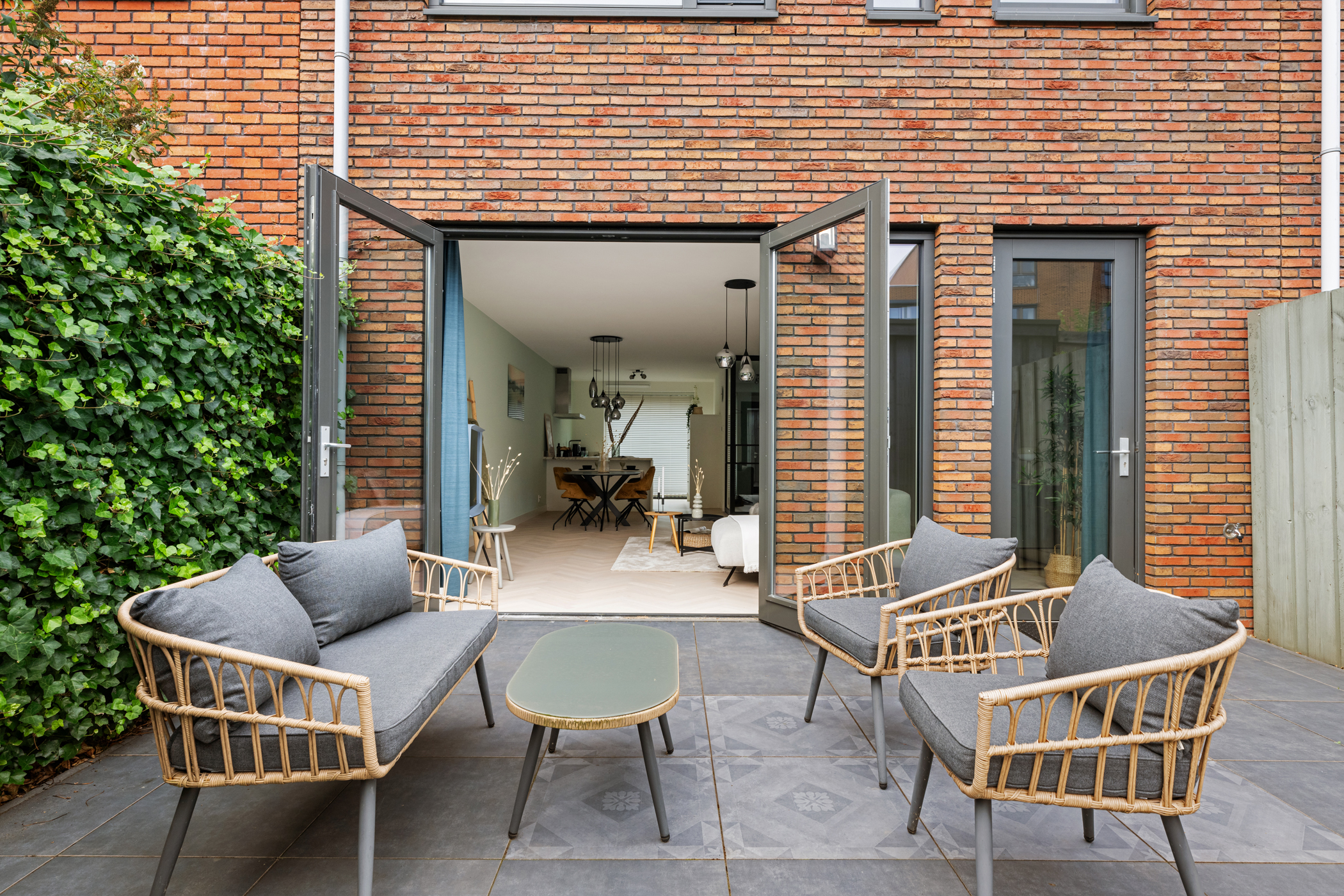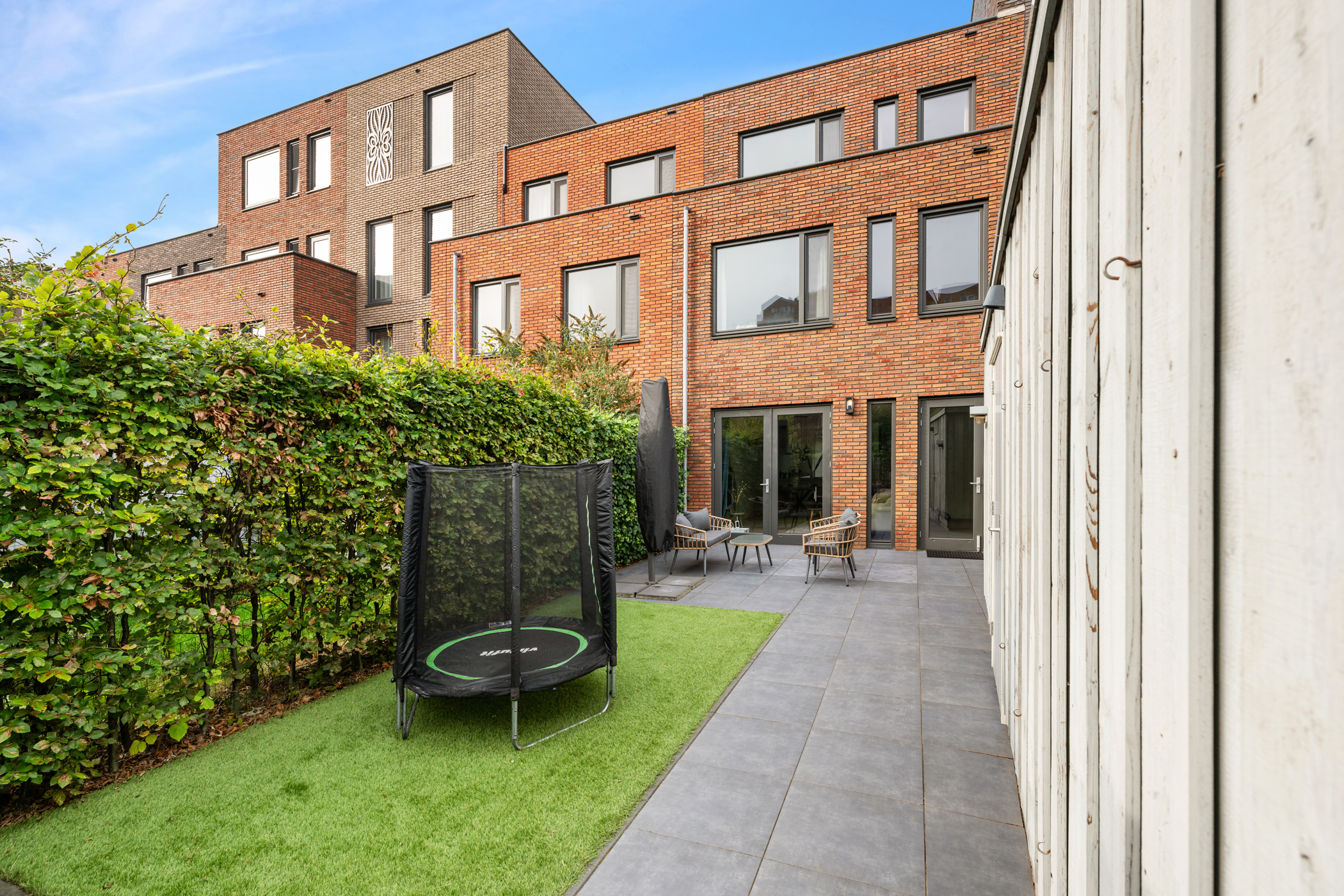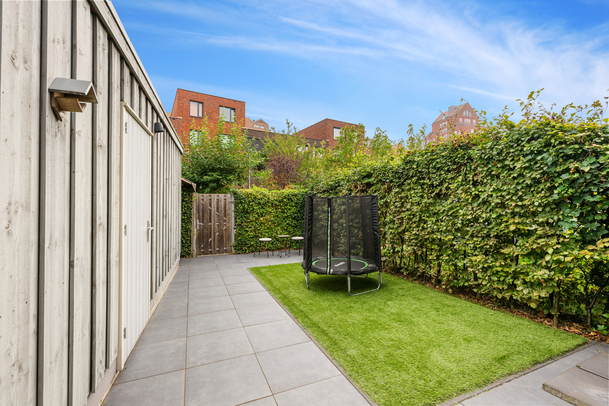 Via de openslaande deuren kom je in de achtertuin op het noord-oosten. Deze is net zo fraai afgewerkt als het huis zelf en biedt met een diepte van meer dan 10 meter altijd een plekje in zon of schaduw. Er is ruimte voor een loungehoek, een grote tuintafel en speelruimte voor de kinderen. Hou je van tuinieren? Ook daar is genoeg ruimte voor! De schuur is functioneel en biedt voldoende opbergruimte, met een handige achterom voor fietsen.