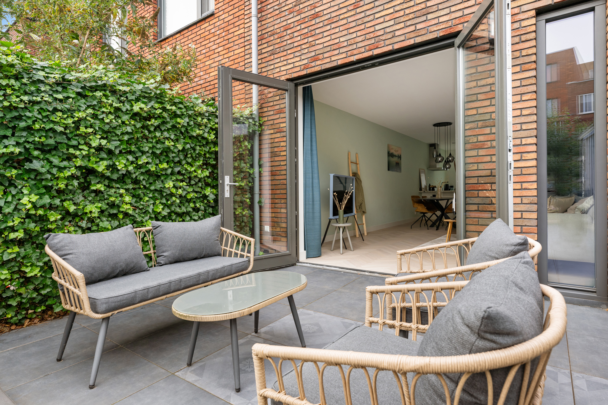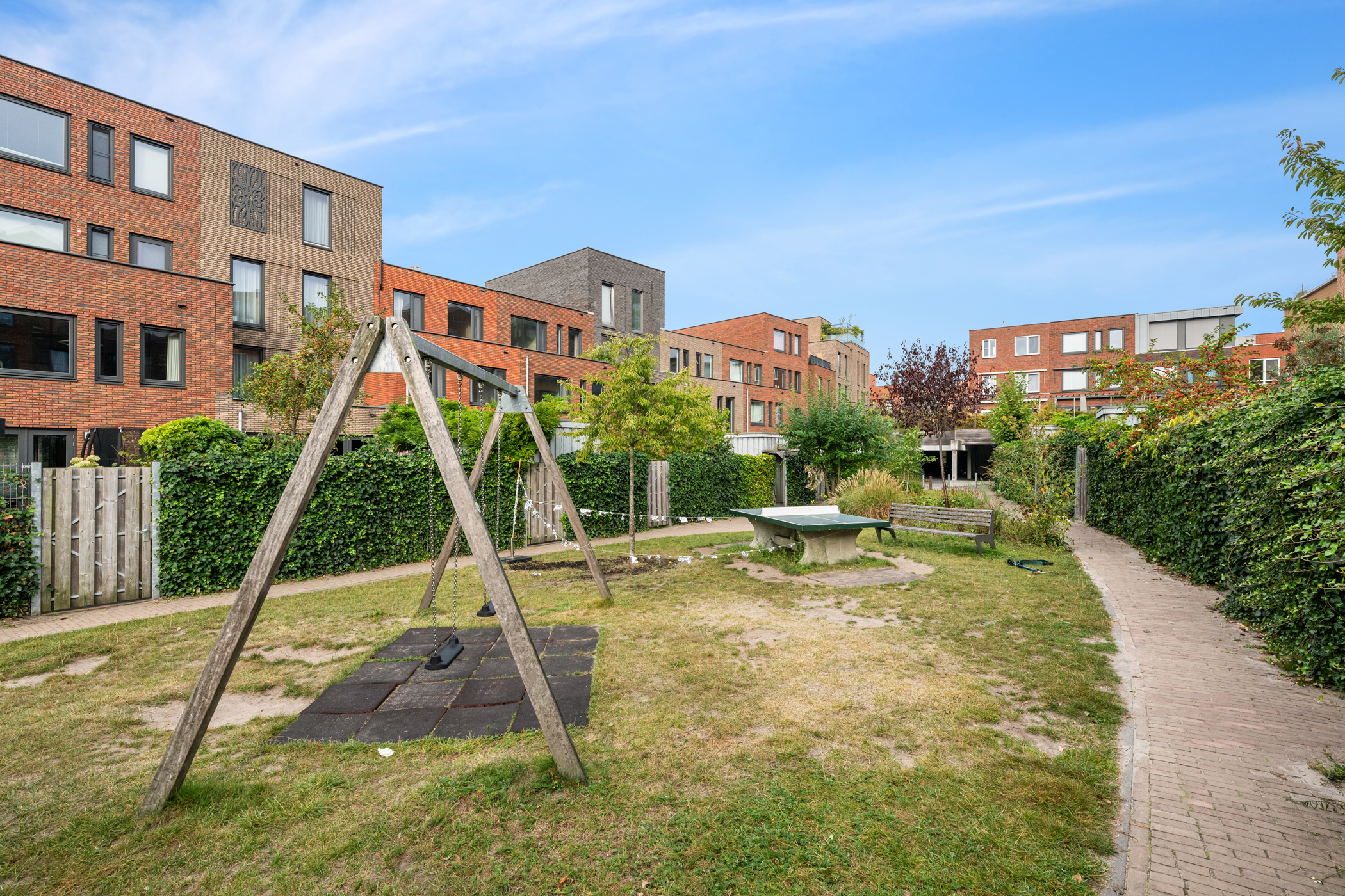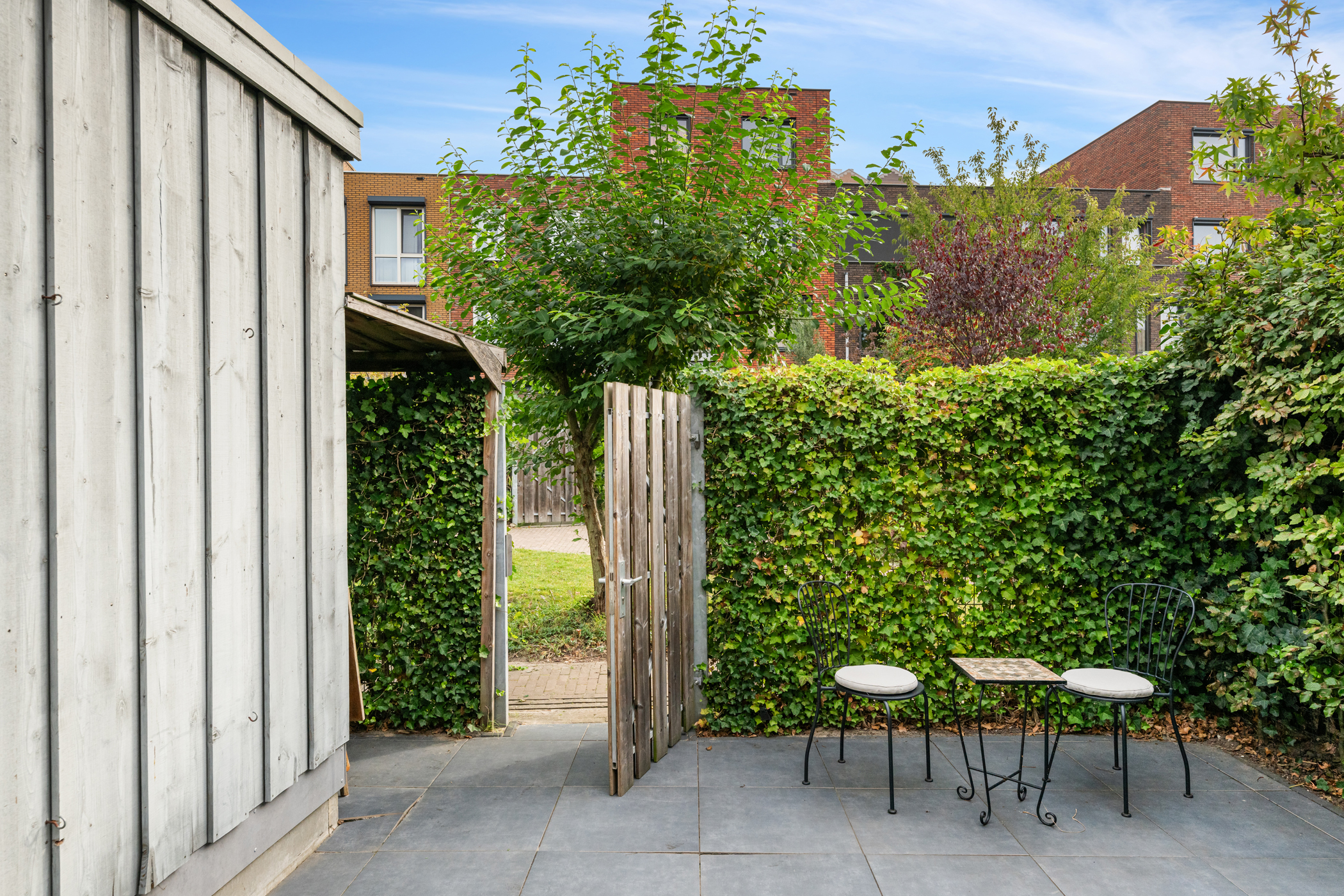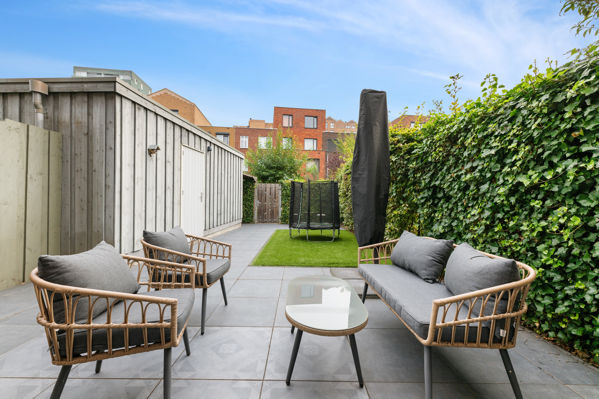 Via de openslaande deuren kom je in de achtertuin op het noord-oosten. Deze is net zo fraai afgewerkt als het huis zelf en biedt met een diepte van meer dan 10 meter altijd een plekje in zon of schaduw. Er is ruimte voor een loungehoek, een grote tuintafel en speelruimte voor de kinderen. Hou je van tuinieren? Ook daar is genoeg ruimte voor! De schuur is functioneel en biedt voldoende opbergruimte, met een handige achterom voor fietsen.