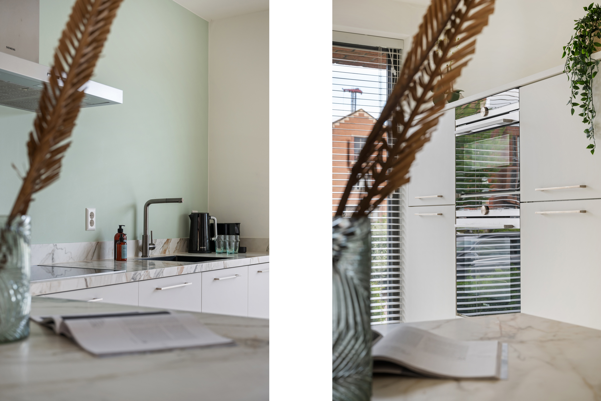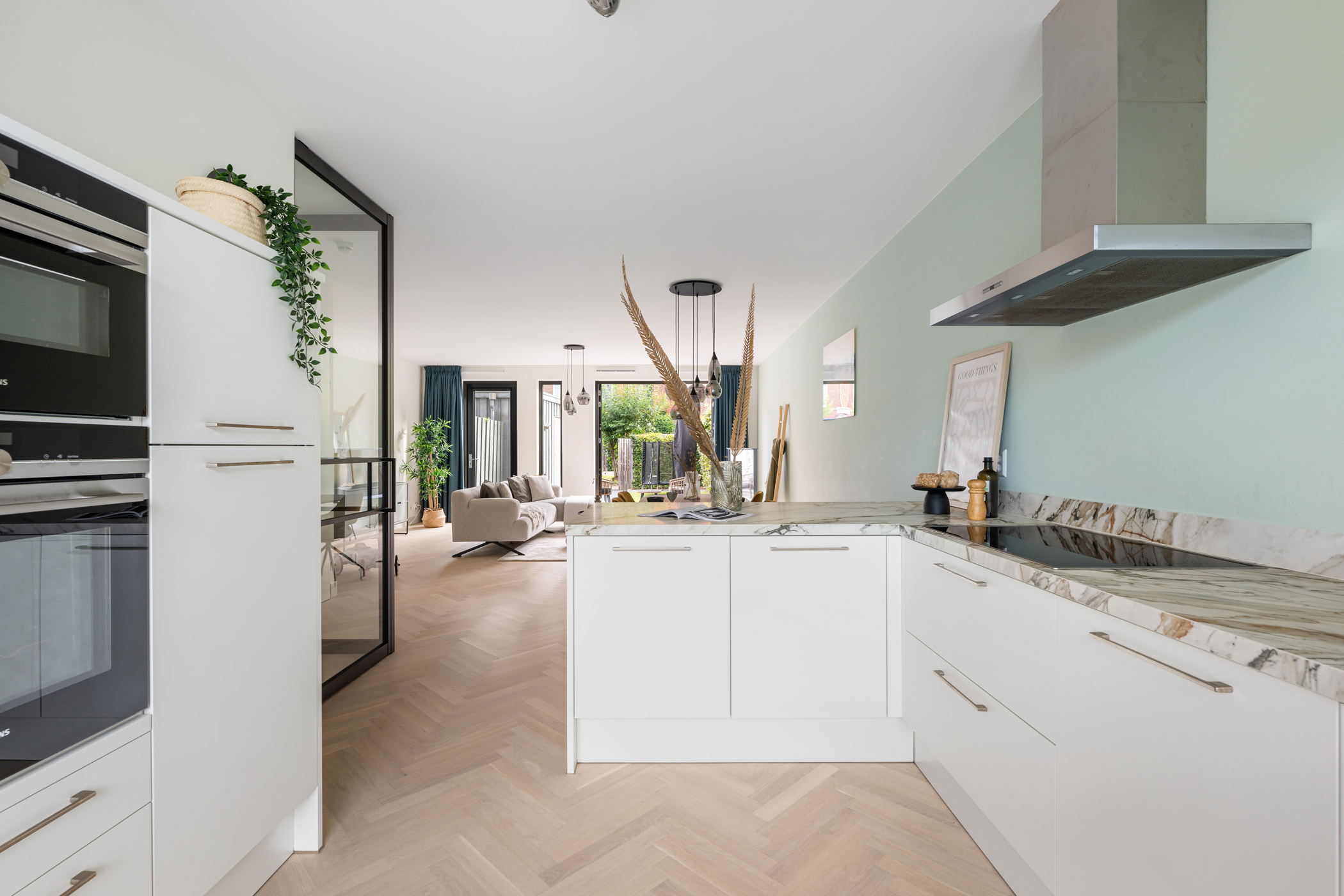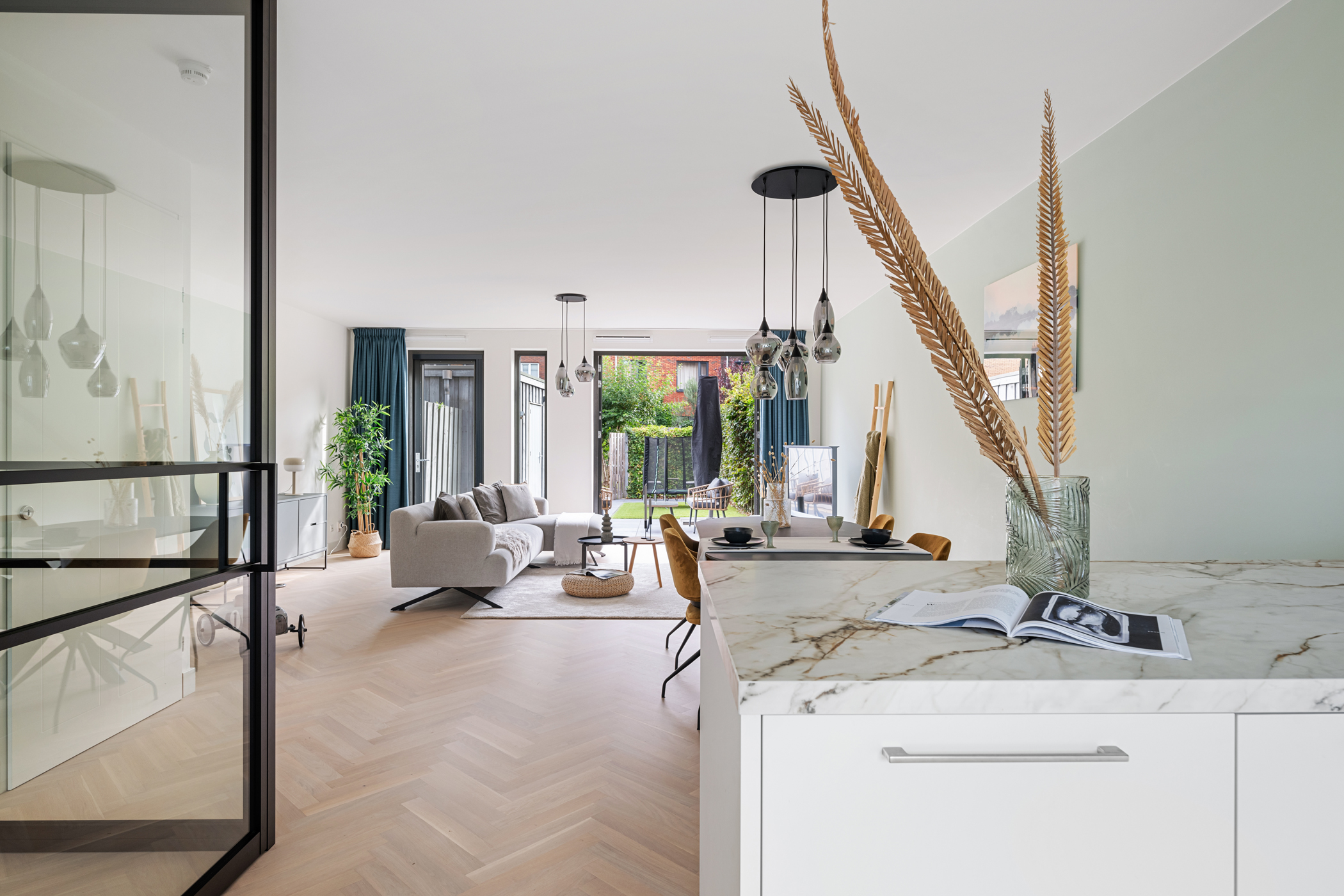Het leefgedeelte heeft een open indeling met de keuken aan de voorzijde, gevolgd door de eethoek en de royale zithoek. De L-vormige keuken is neutraal en modern afgewerkt met een stijlvol Dekton aanrechtblad. Dankzij de praktische indeling is er veel werk- en kastruimte en is er plek voor een paar barkrukken, zodat je gezelschap gezellig kan aanschuiven terwijl jij kookt. De keuken is volledig uitgerust met luxe inbouwapparatuur van Siemens, waaronder een vaatwasser, inductiekookplaat, combi-oven, oven, koelkast en vriezer.