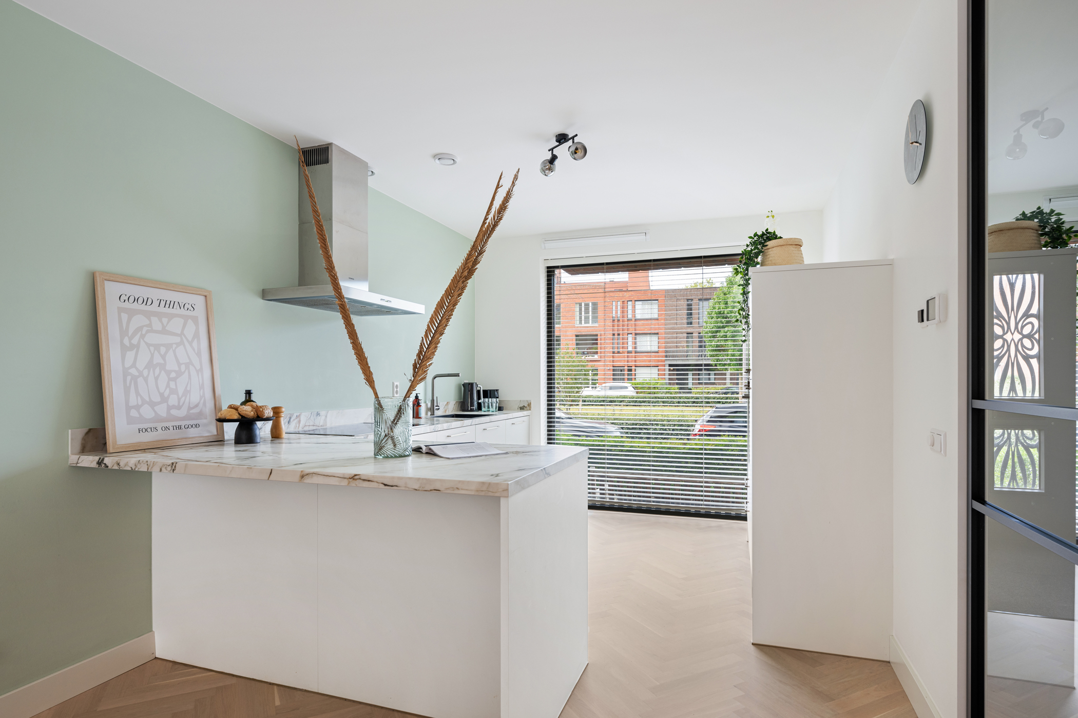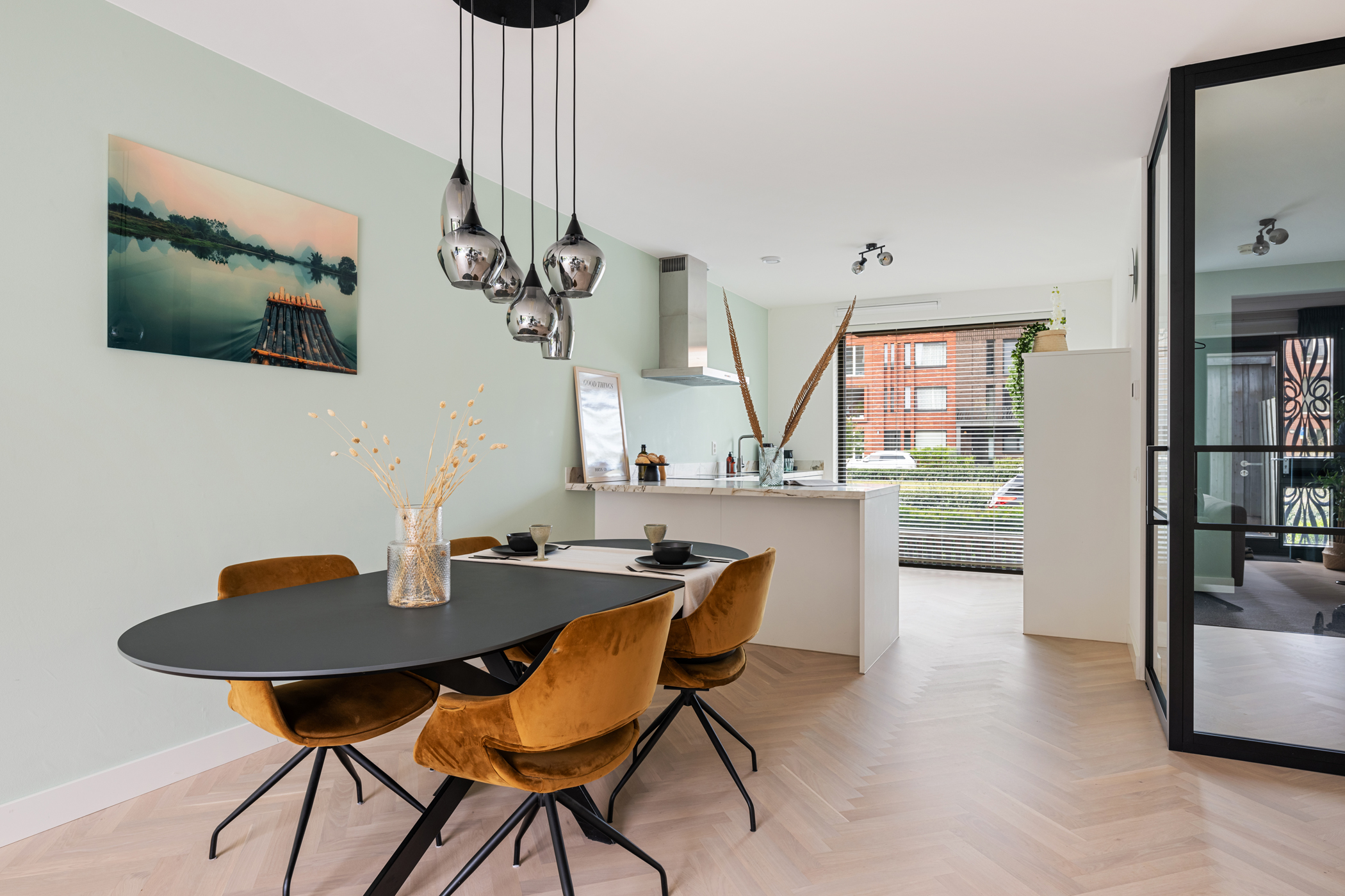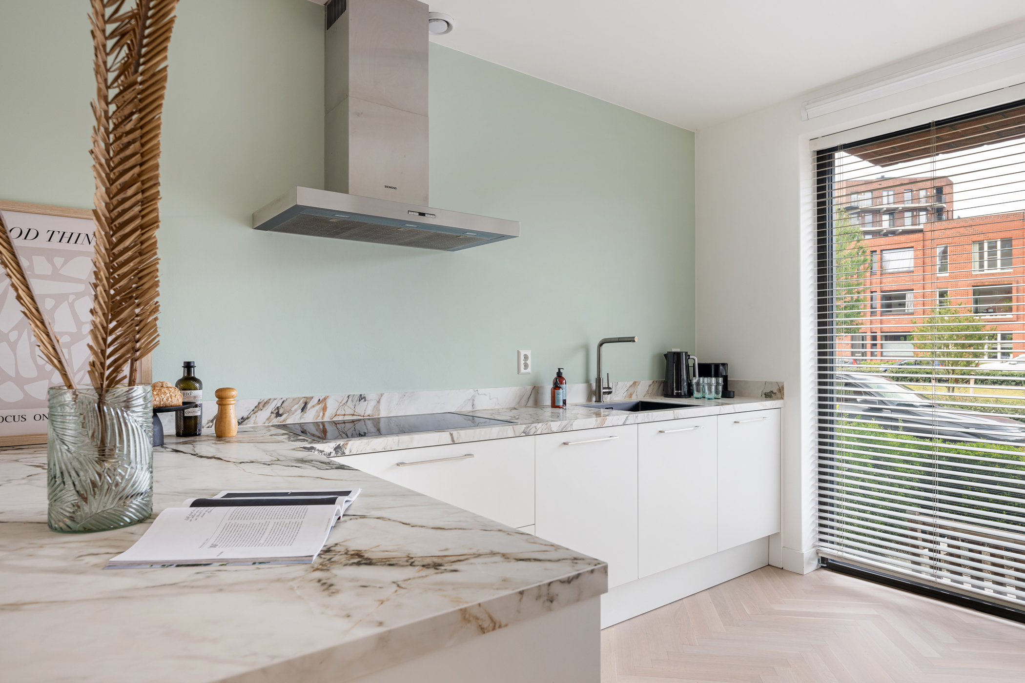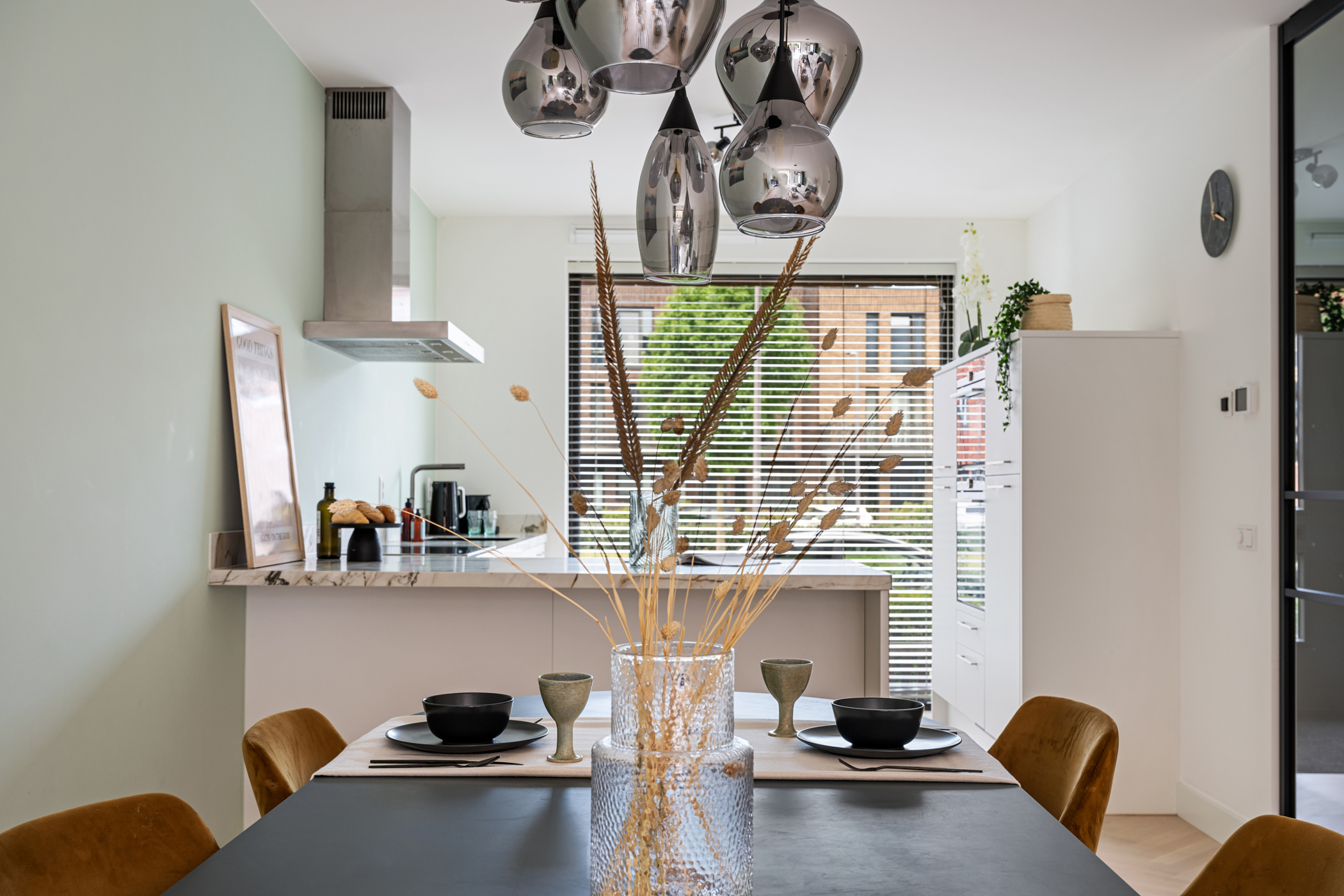 Het leefgedeelte heeft een open indeling met de keuken aan de voorzijde, gevolgd door de eethoek en de royale zithoek. De L-vormige keuken is neutraal en modern afgewerkt met een stijlvol Dekton aanrechtblad. Dankzij de praktische indeling is er veel werk- en kastruimte en is er plek voor een paar barkrukken, zodat je gezelschap gezellig kan aanschuiven terwijl jij kookt. De keuken is volledig uitgerust met luxe inbouwapparatuur van Siemens, waaronder een vaatwasser, inductiekookplaat, combi-oven, oven, koelkast en vriezer.