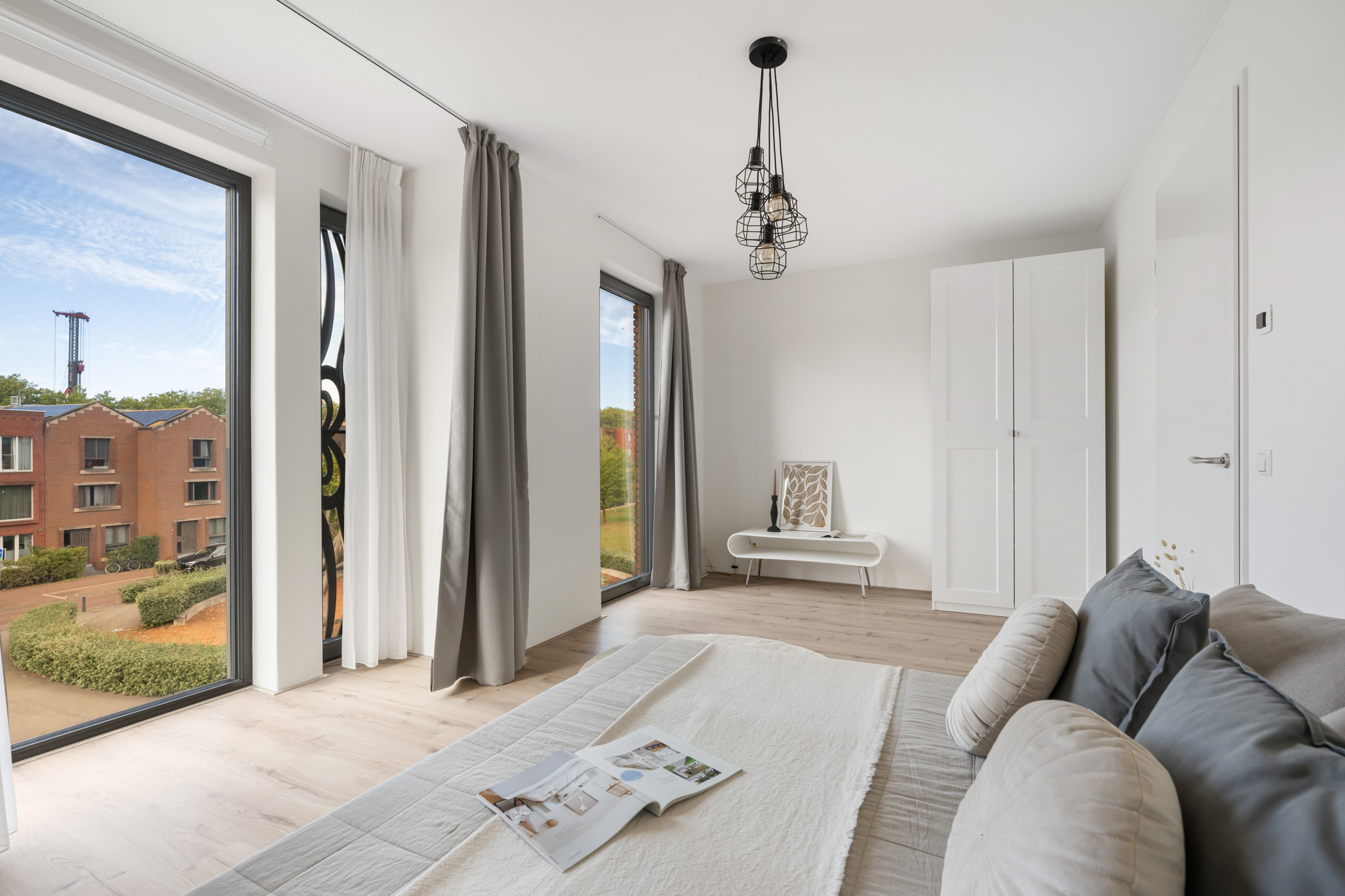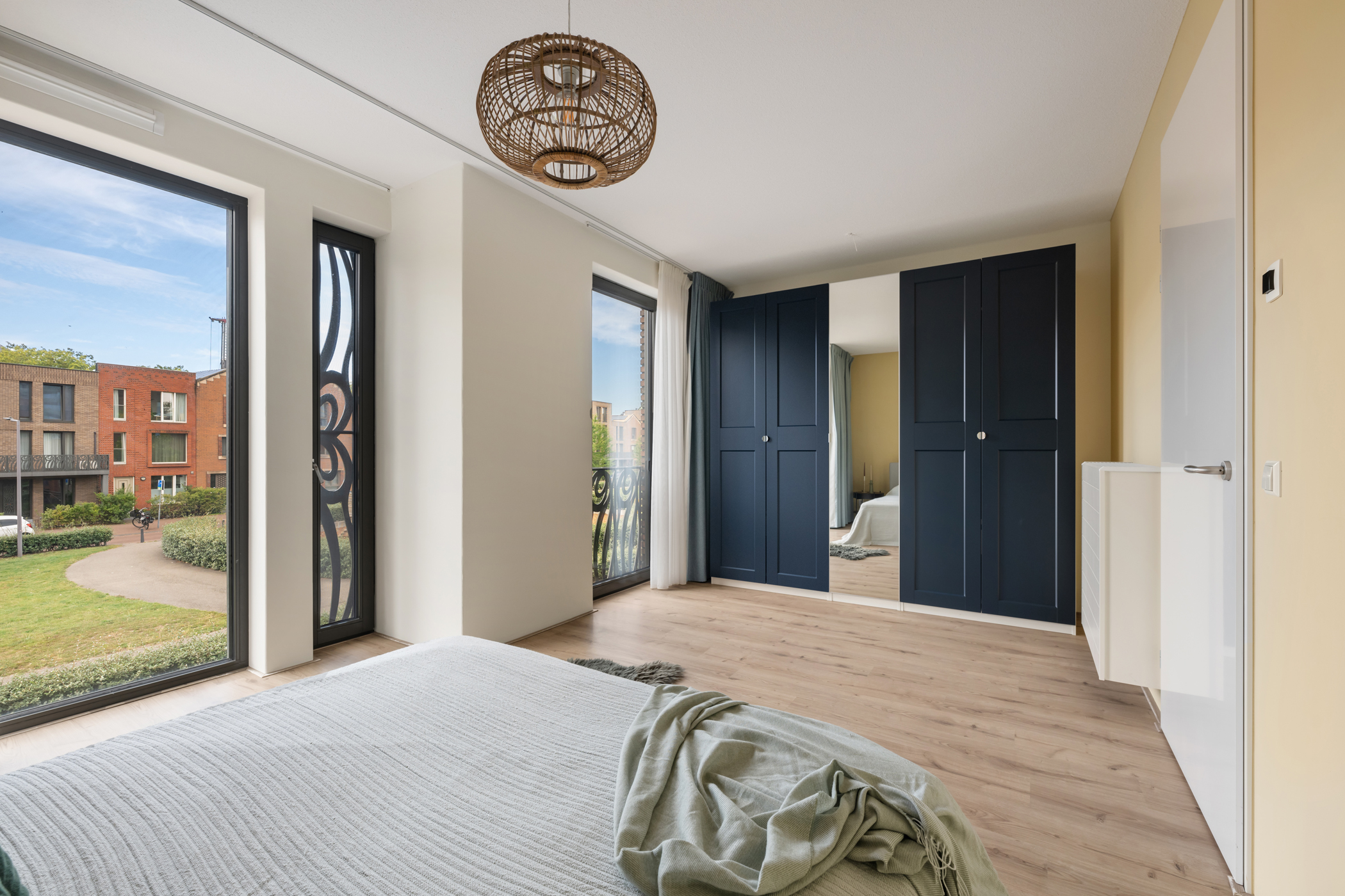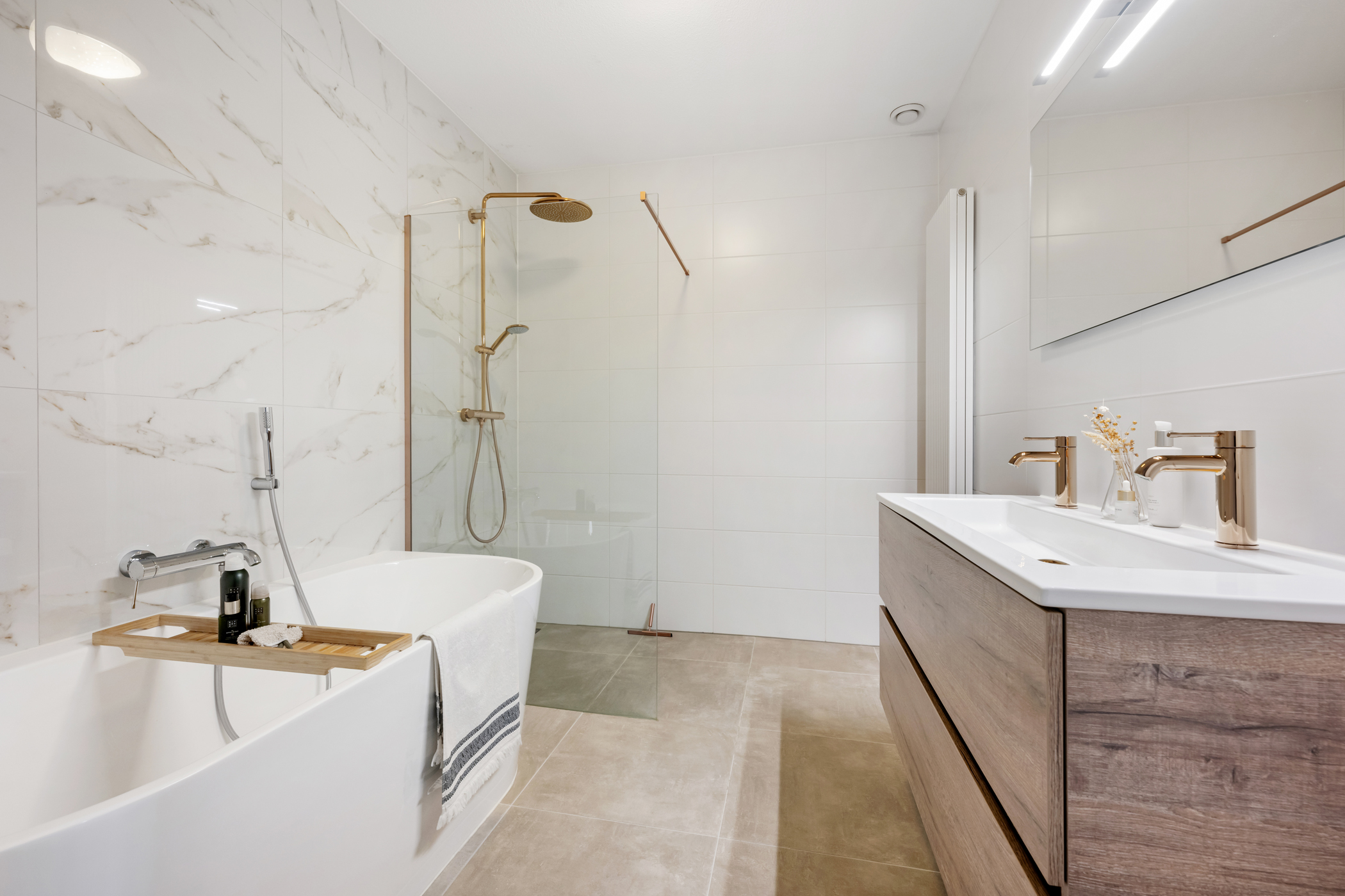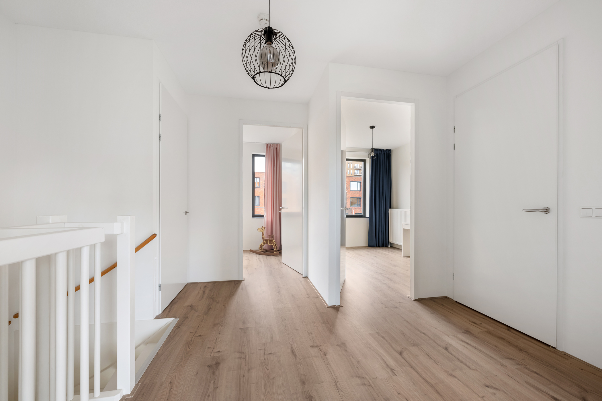 Op de eerste verdieping wordt de hoogwaardige afwerking van het huis voortgezet. Hier bevinden zich drie slaapkamers, elk met grote raampartijen en veel lichtinval. De ruime hoofdslaapkamer aan de voorzijde biedt plaats voor een tweepersoonsbed en een kastenwand. In het midden van deze etage vind je de luxe badkamer met stijlvolle gouden accenten, een royale inloopdouche, ligbad en dubbele wastafel. Het separate toilet is tegenover de badkamer gelegen. De twee slaapkamers aan de achterzijde kunnen naar eigen wens worden ingericht, ideaal voor kinderen, logees of een kantoor aan huis.
