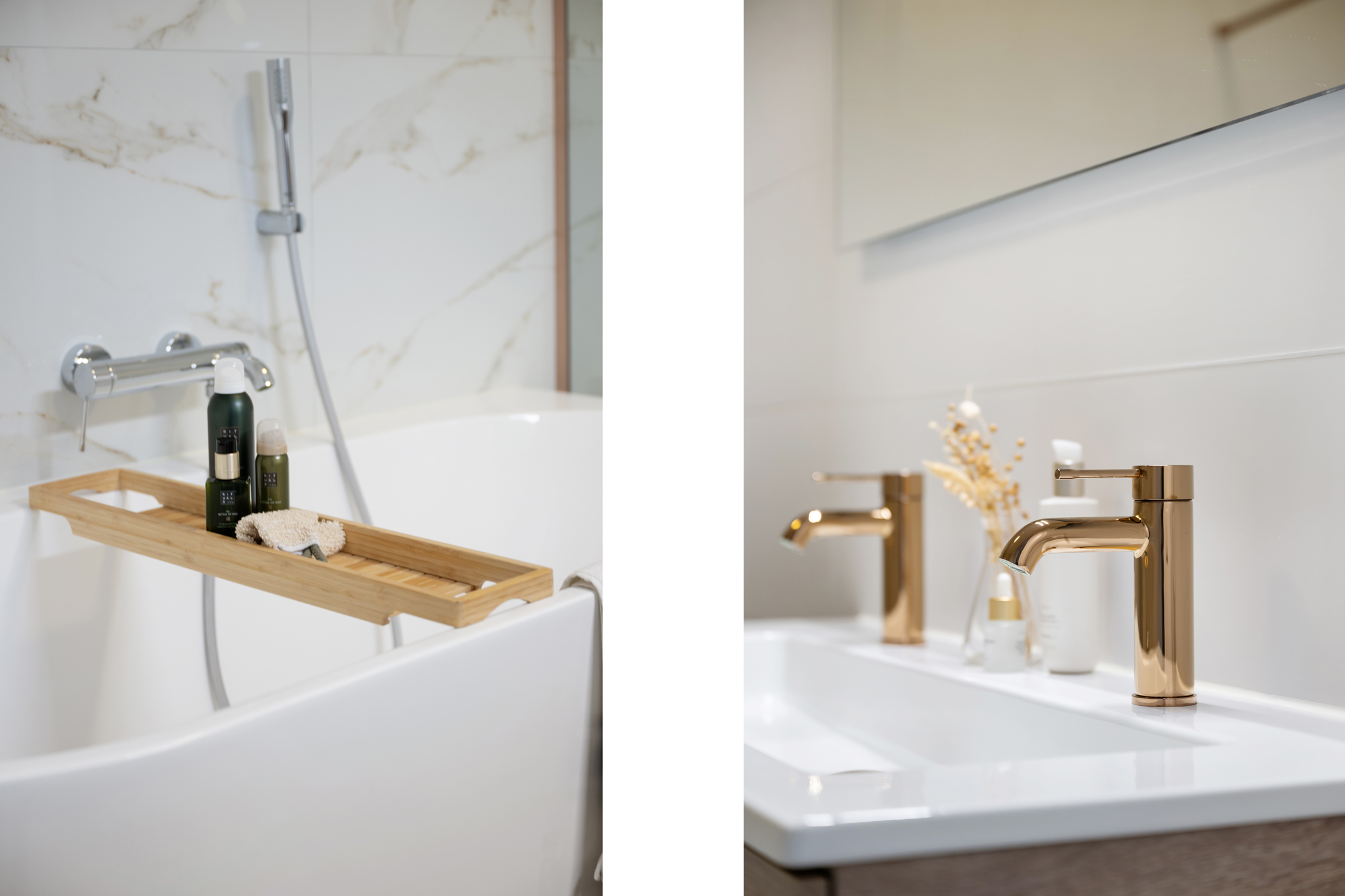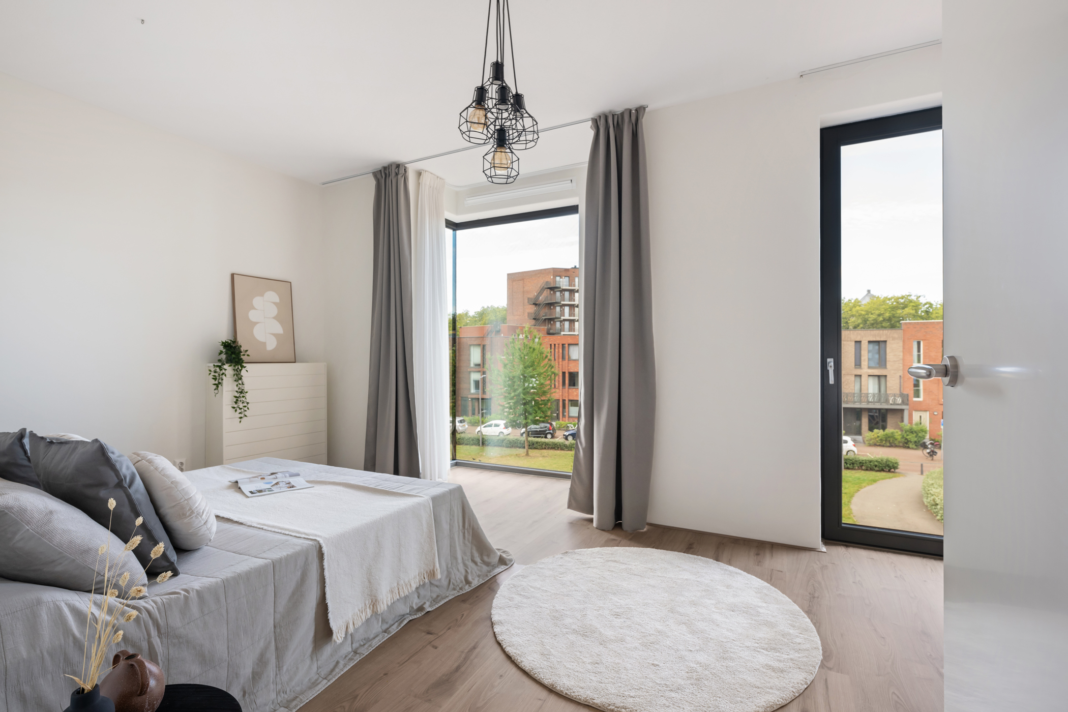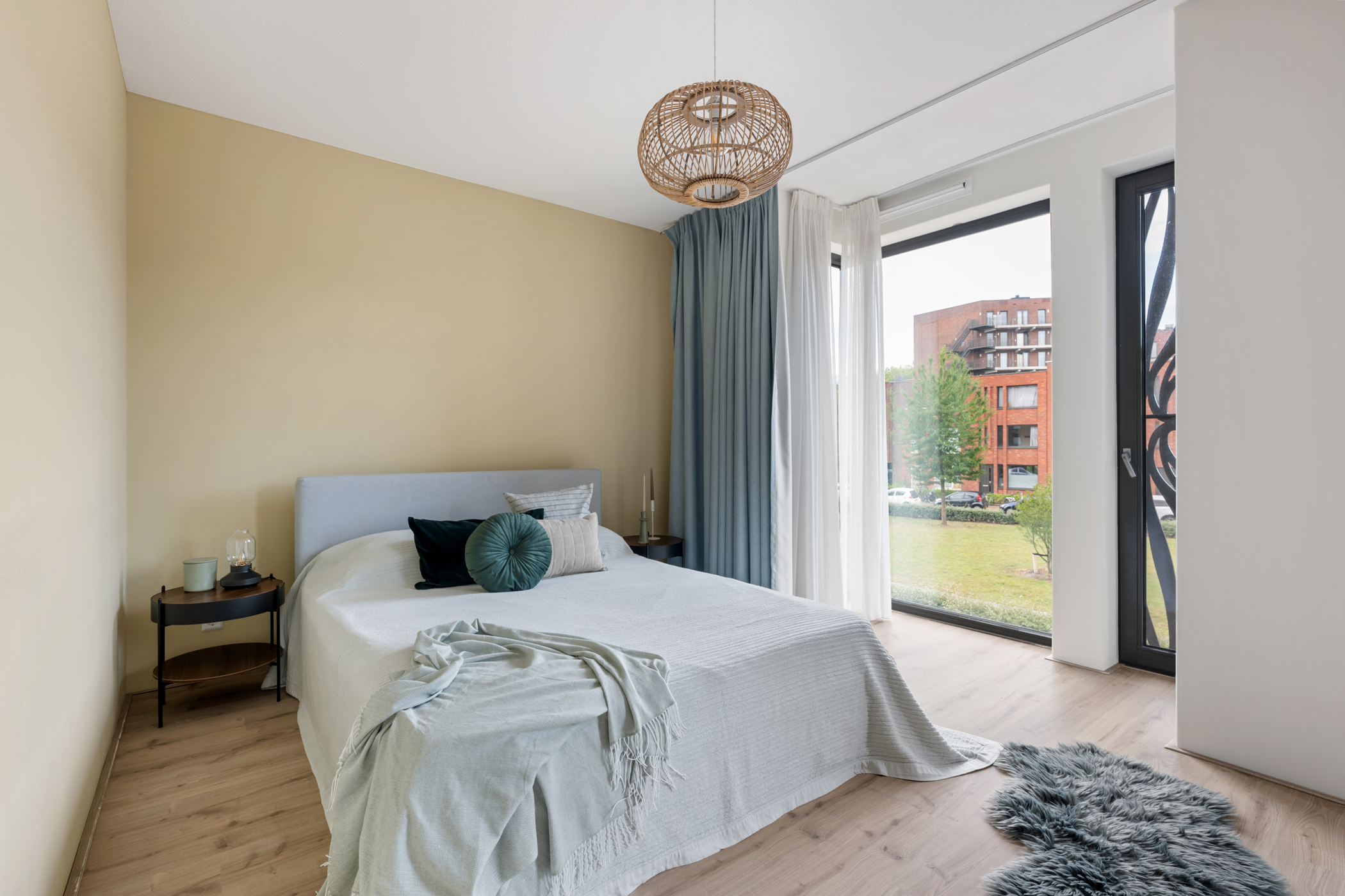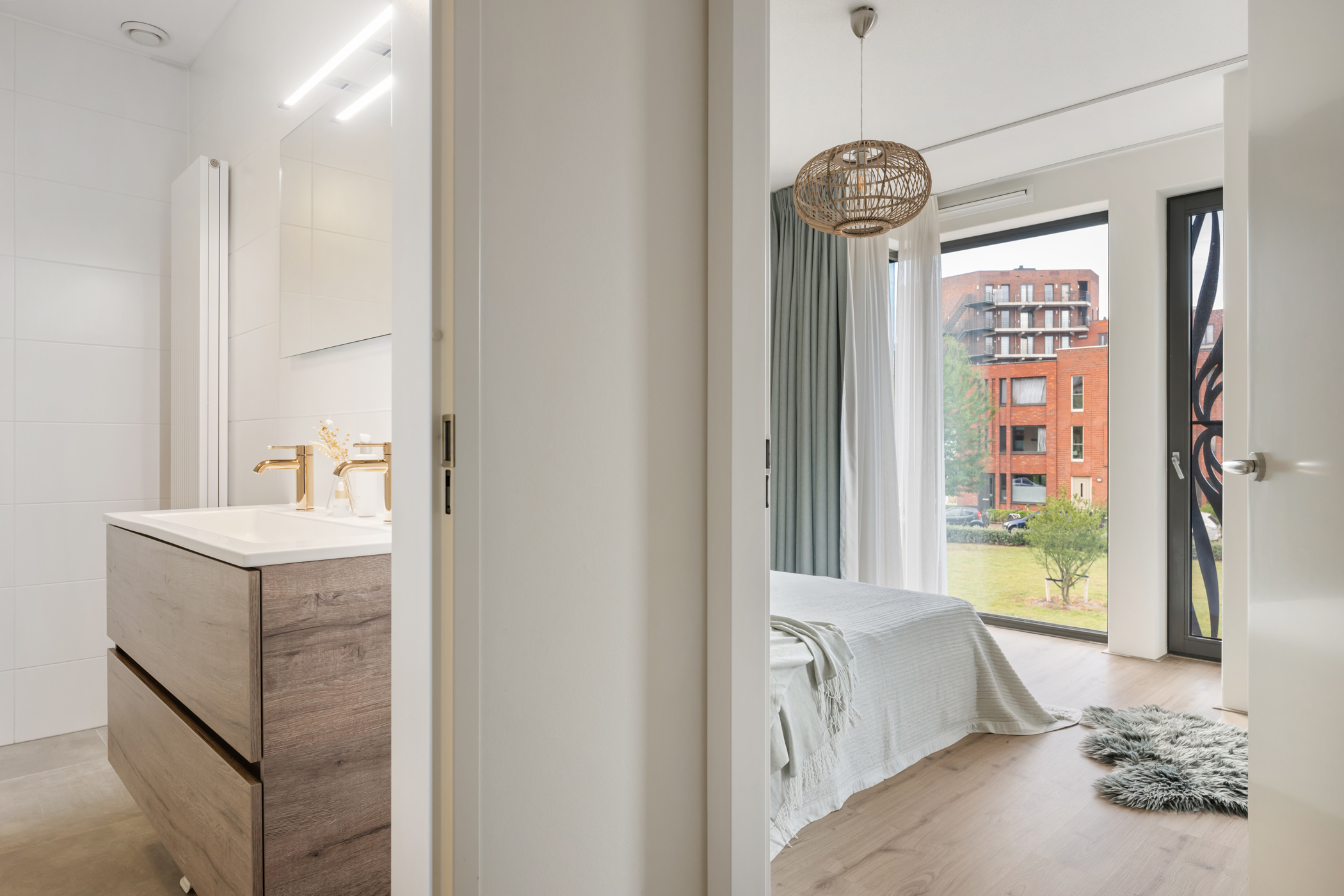 Op de eerste verdieping wordt de hoogwaardige afwerking van het huis voortgezet. Hier bevinden zich drie slaapkamers, elk met grote raampartijen en veel lichtinval. De ruime hoofdslaapkamer aan de voorzijde biedt plaats voor een tweepersoonsbed en een kastenwand. In het midden van deze etage vind je de luxe badkamer met stijlvolle gouden accenten, een royale inloopdouche, ligbad en dubbele wastafel. Het separate toilet is tegenover de badkamer gelegen. De twee slaapkamers aan de achterzijde kunnen naar eigen wens worden ingericht, ideaal voor kinderen, logees of een kantoor aan huis.