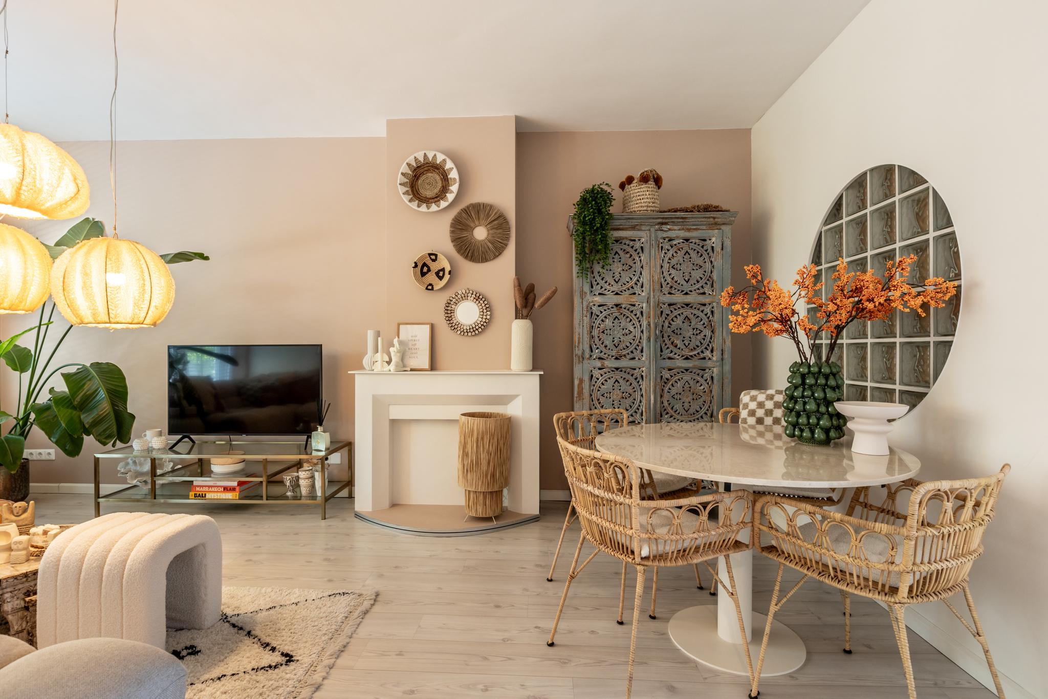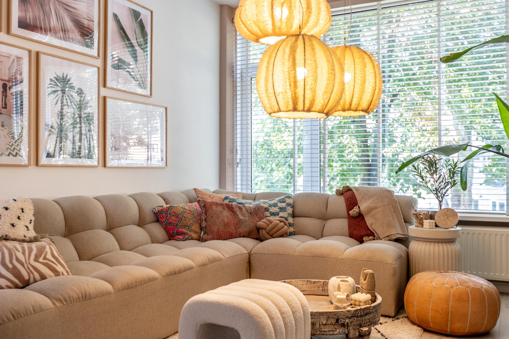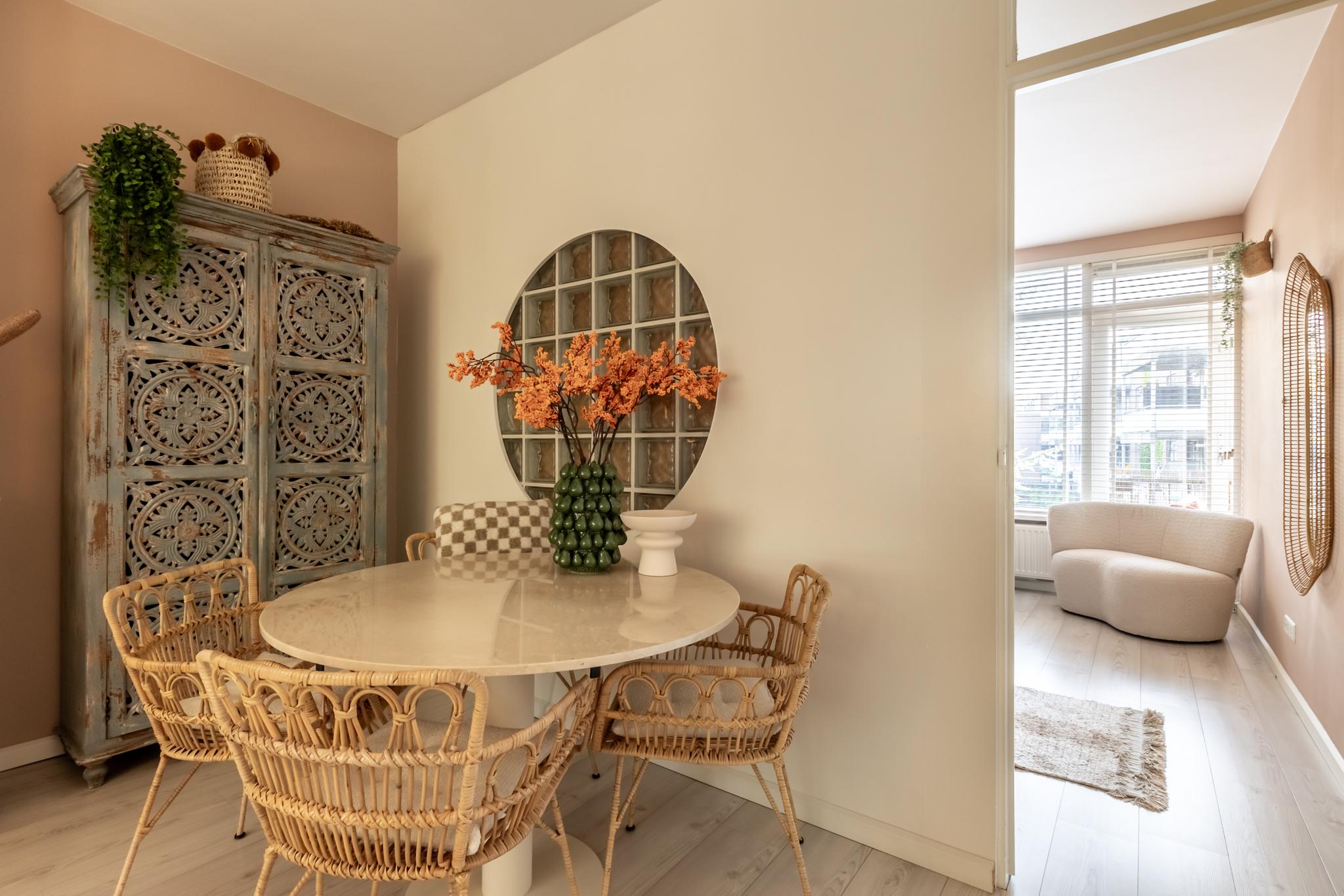 Bij binnenkomst word je verwelkomd in een ruime woonkamer, prachtig ingericht met zachte, neutrale kleuren die direct een gevoel van rust creëren. De moderne meubels, met een speelse mix van natuurlijke materialen zoals rotan en hout, maken deze ruimte niet alleen gezellig maar ook zeer uitnodigend. Grote ramen laten veel natuurlijk licht binnen en bieden een mooi uitzicht op de omgeving. De fraaie lampen in de woonkamer geven 's avonds een warme, knusse sfeer, ideaal voor ontspannen momenten. De hoofdslaapkamer is eveneens een plaatje. Hier is gekozen voor warme aardetinten die perfect passen bij de rustige uitstraling van de rest van het huis. Het nodigt uit tot lekker lang uitslapen en het interieur is minimalistisch maar toch stijlvol met prachtige decoratieve details, zoals wandkunst in natuurlijke materialen. Aangekomen in de keurige keuken welke voorzien is van een koelkast, 4-pitsgasstel, afzuigkap en een oven. Perfect! En als kers op de taart, vanuit de keuken heb je toegang tot het balkon. Waar je heerlijk kunt genieten van een kopje koffie in de ochtendzon, het balkon is gelegen op het noordoosten! De badkamer is modern en verfijnd. De combinatie van beige tegels en groene accenten geeft een natuurlijke, serene sfeer. Het is een heerlijke plek om tot rust te komen, met stijlvolle details zoals het stoere houten wastafelblad. Verder beschikt de woning over een tweede slaapkamer, perfect als thuiskantoor of logeerkamer.