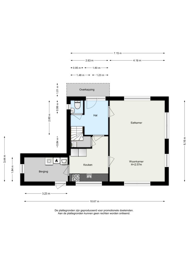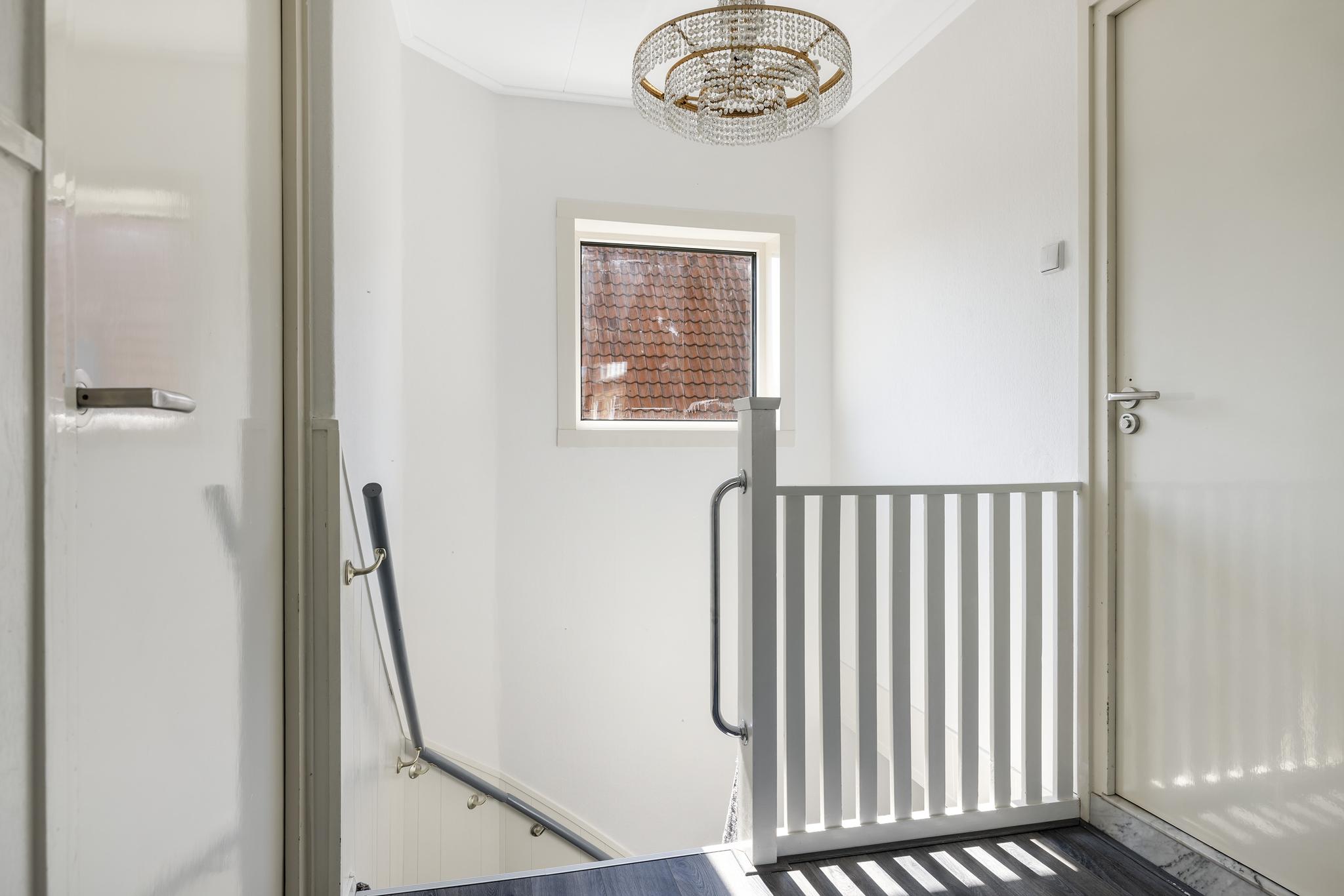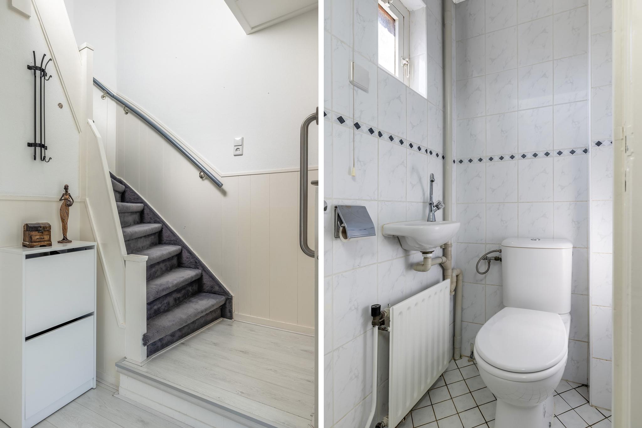 Entree in ruime hal, toilet met fontein, toegang tot woonkamer en keuken, trapopgang naar verdieping.