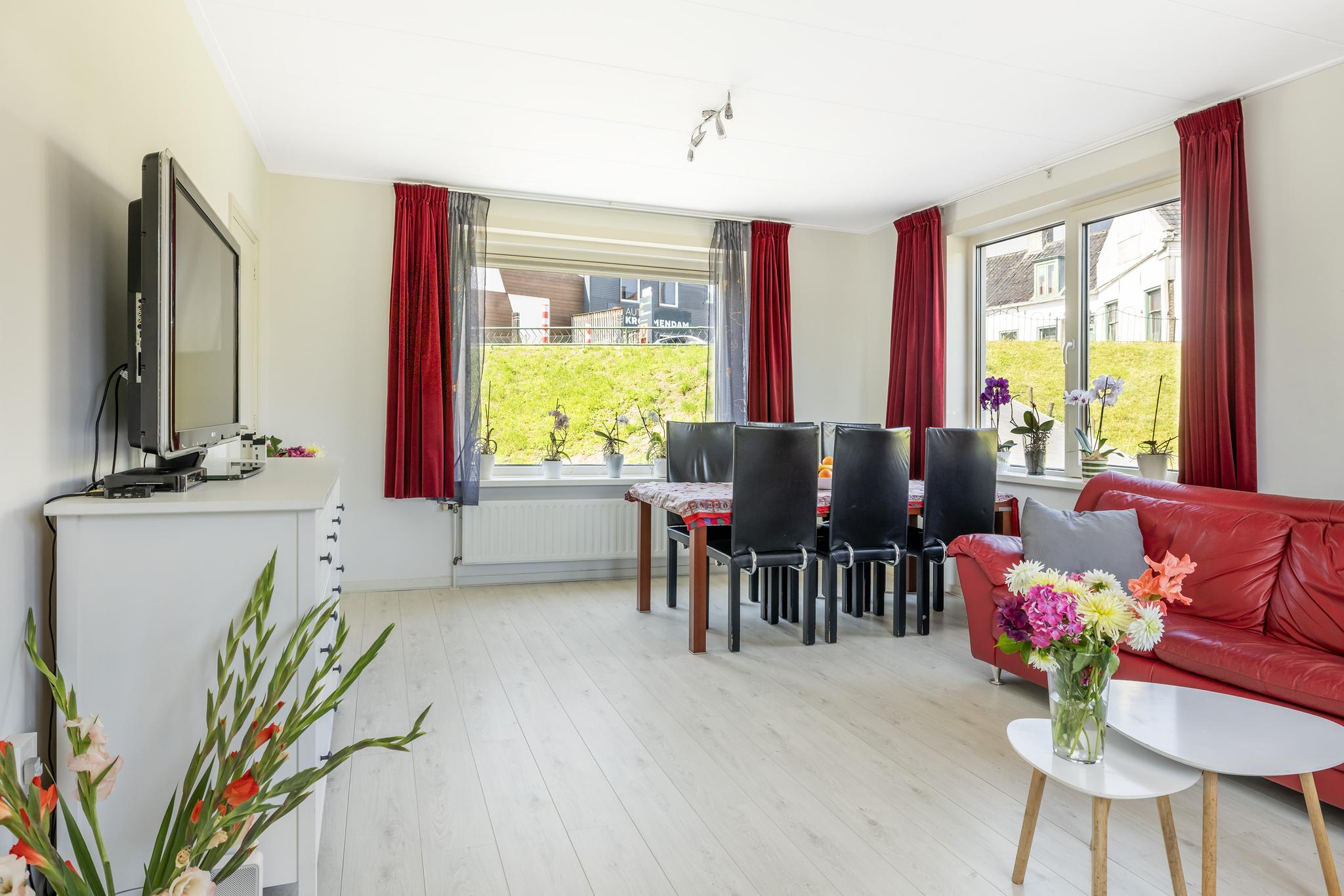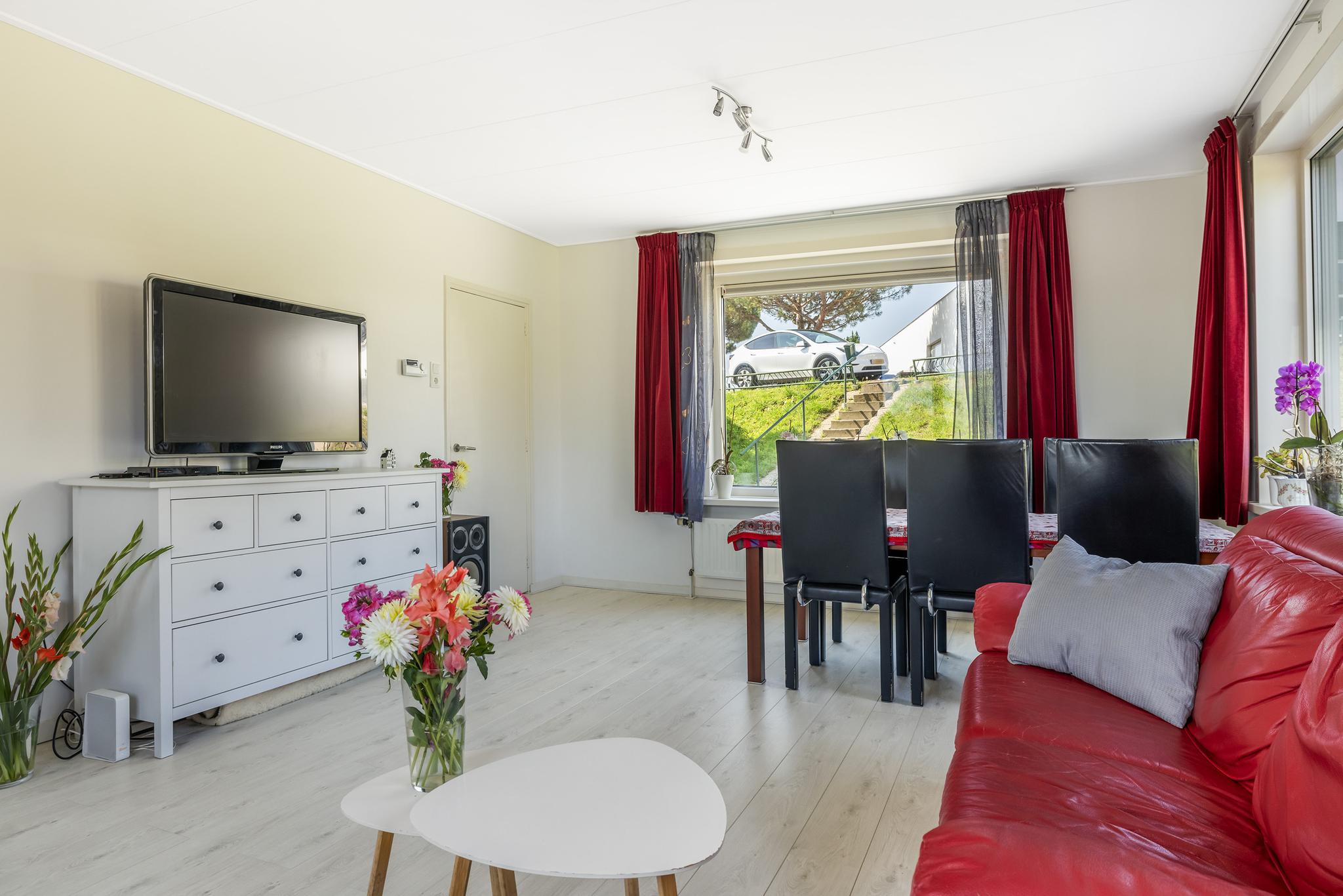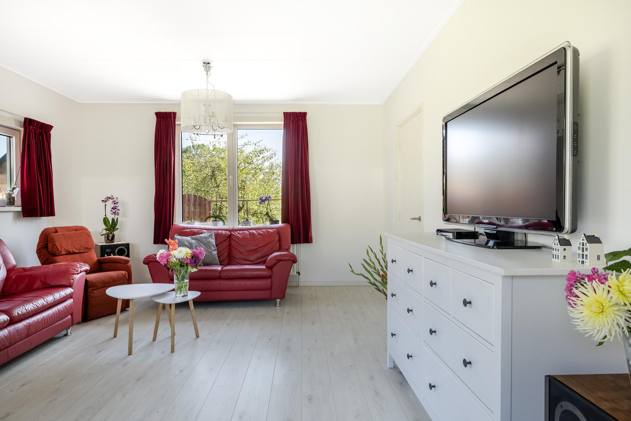 Lichte woonkamer over de gehele lengte van de woning, met aan achterzijde toegang tot de keuken. De woonkamer is voorzien van gestucte wanden, een nette laminaatvloer en zonnescherm aan voorzijde.