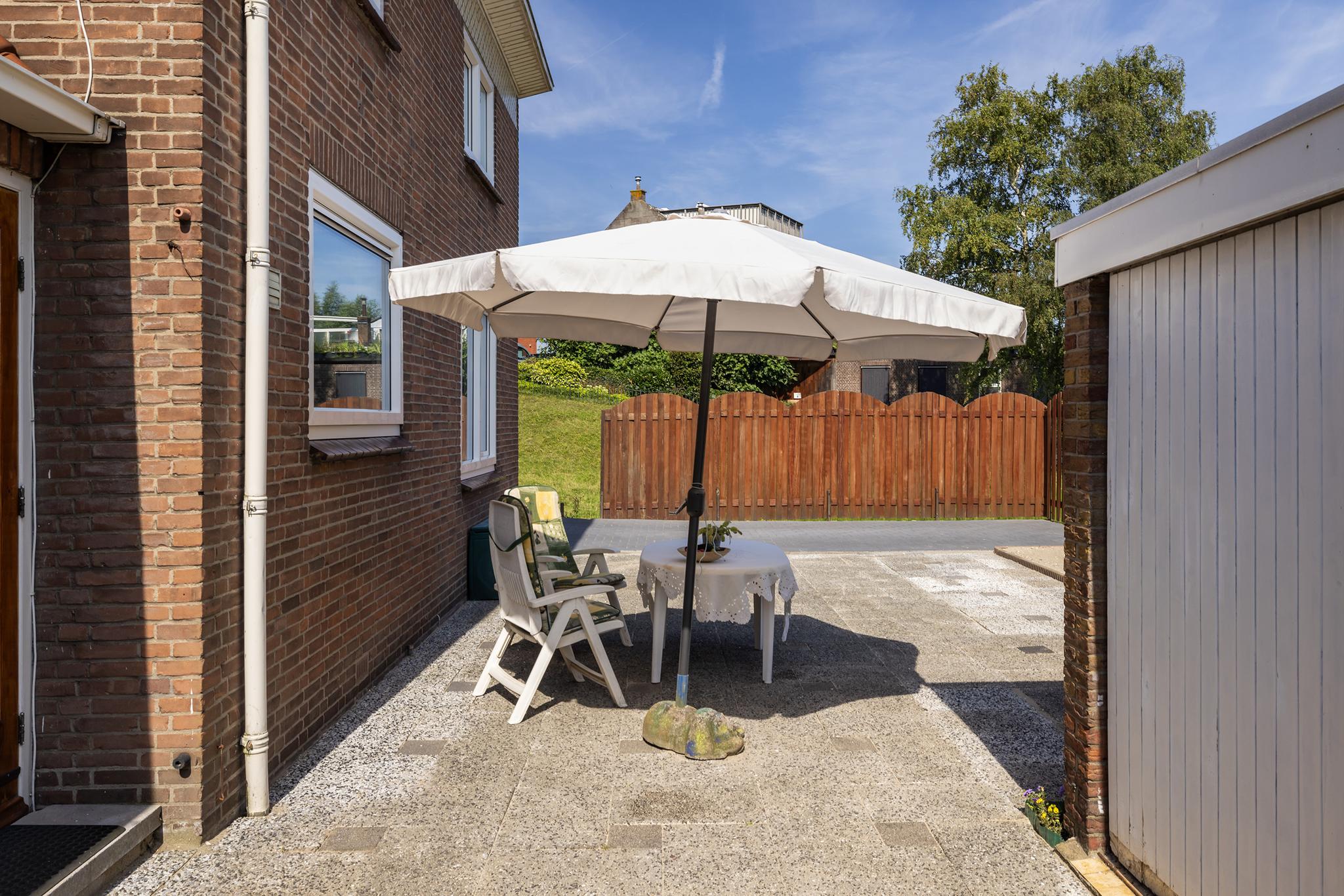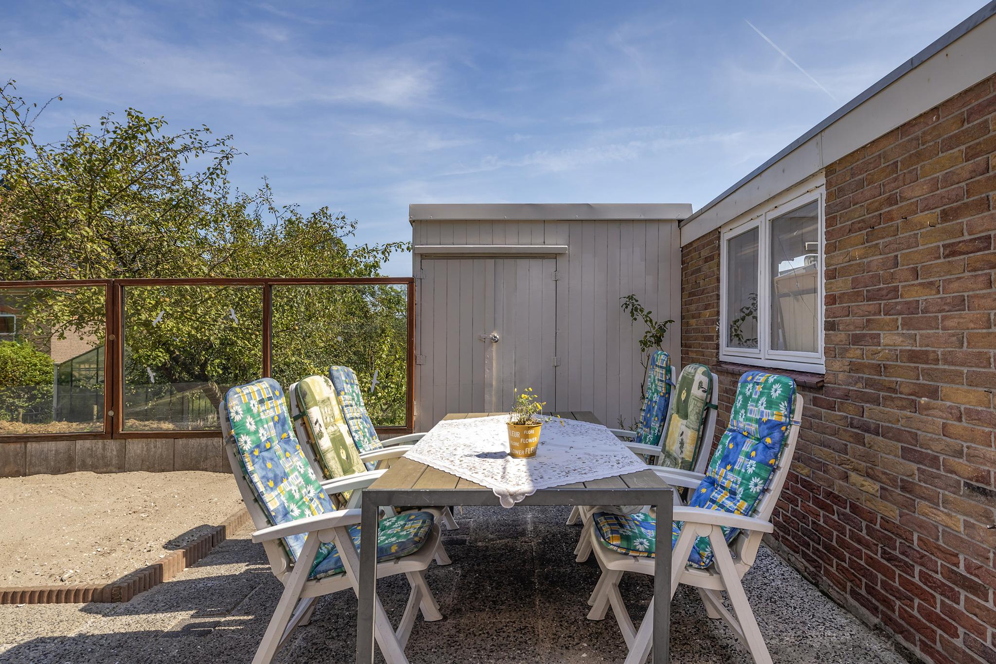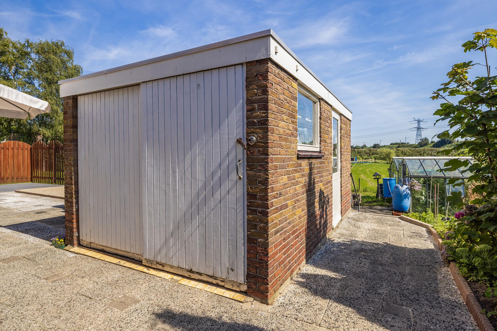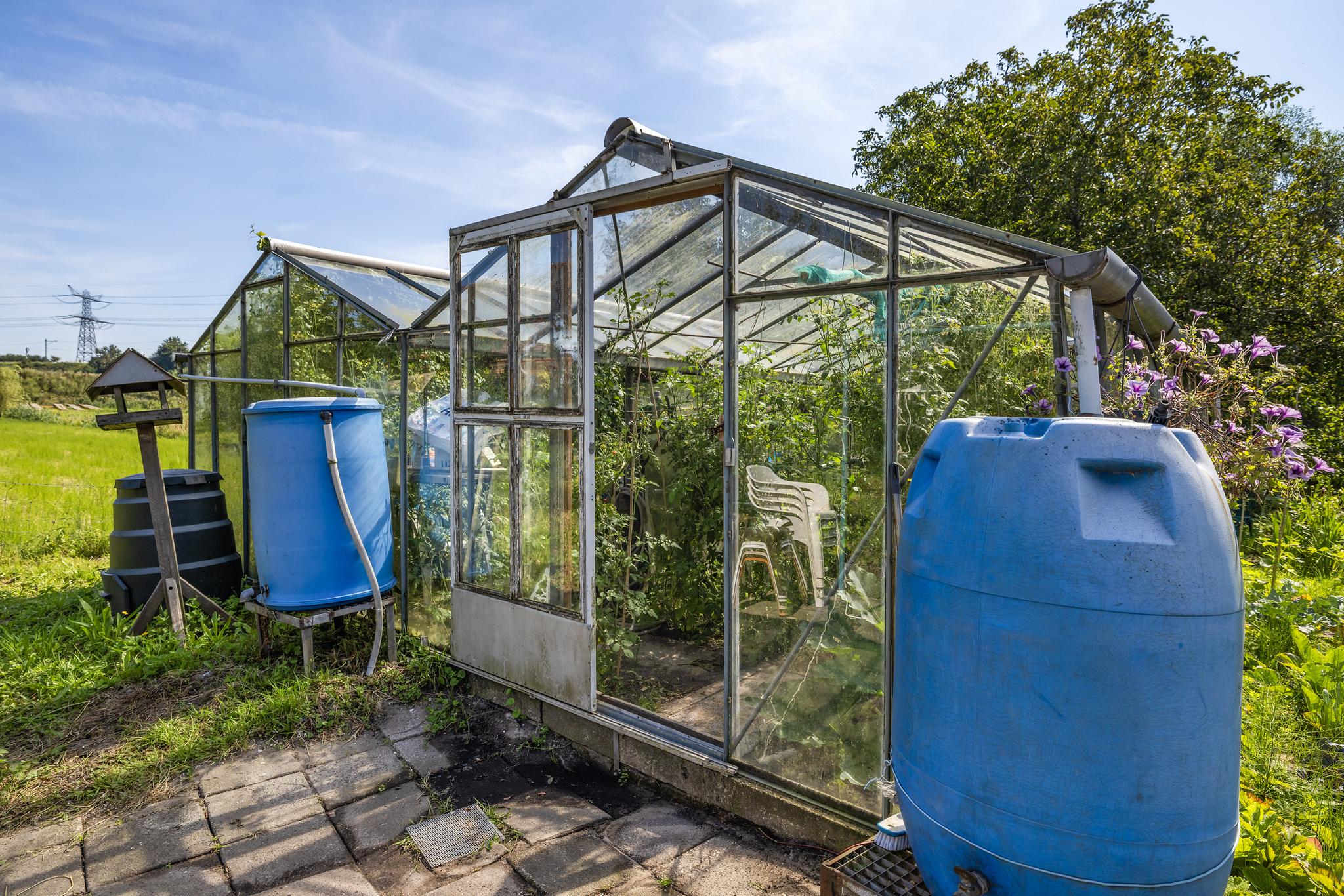 Direct achter de woning bevindt zich een groot terras vanaf waar je fraai uitzicht hebt over de rest van het perceel en de achtergelegen weide. Hier bevinden zich tevens de bergingen.