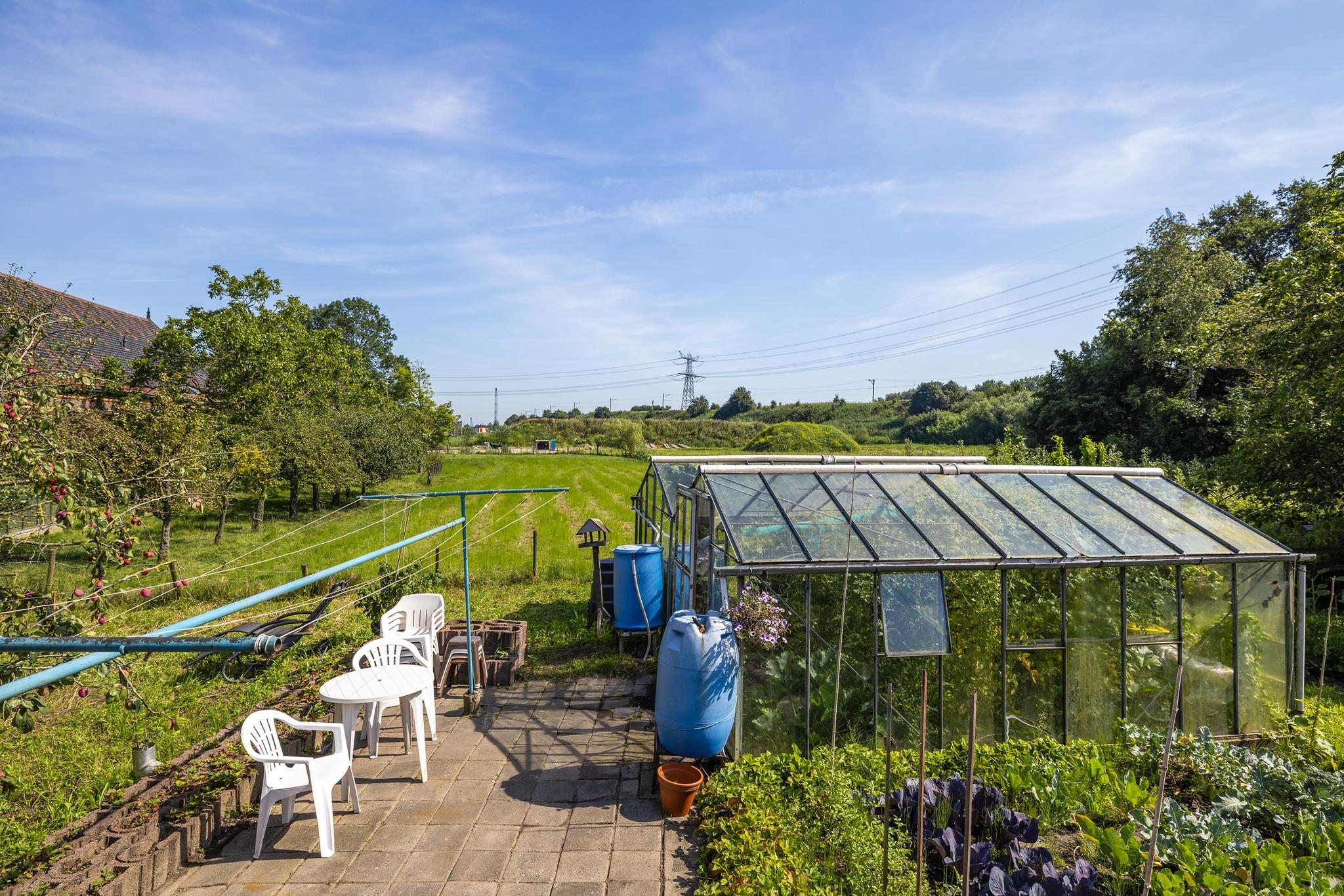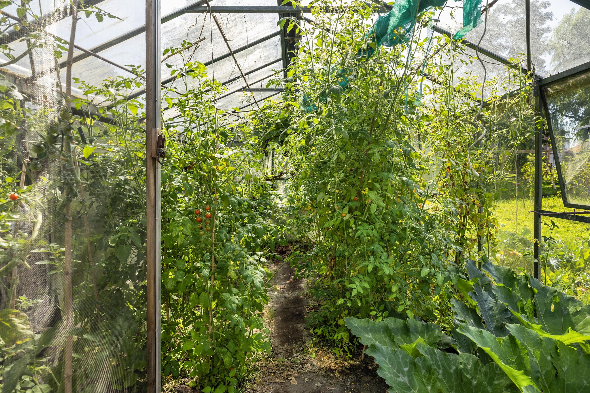 Via een trapje betreed je het lager gelegen deel van de achtertuin. Dit gedeelte is deels ingericht als moestuin met naastgelegen broeikassen. Daarnaast heb je hier beschikking over een groot grasveld met fruitbomen.