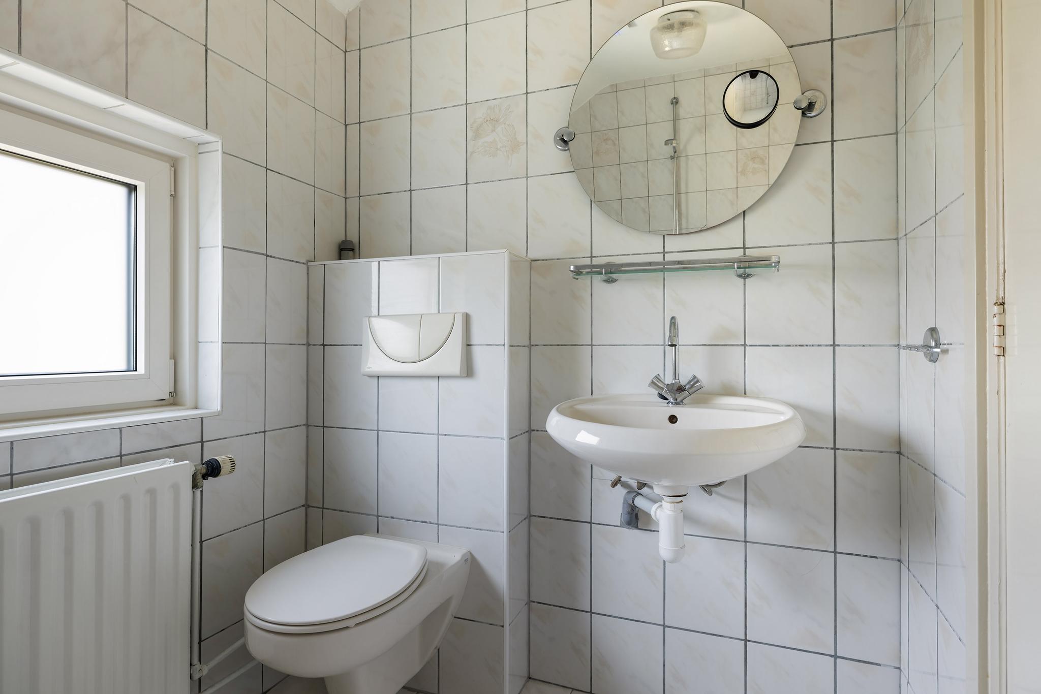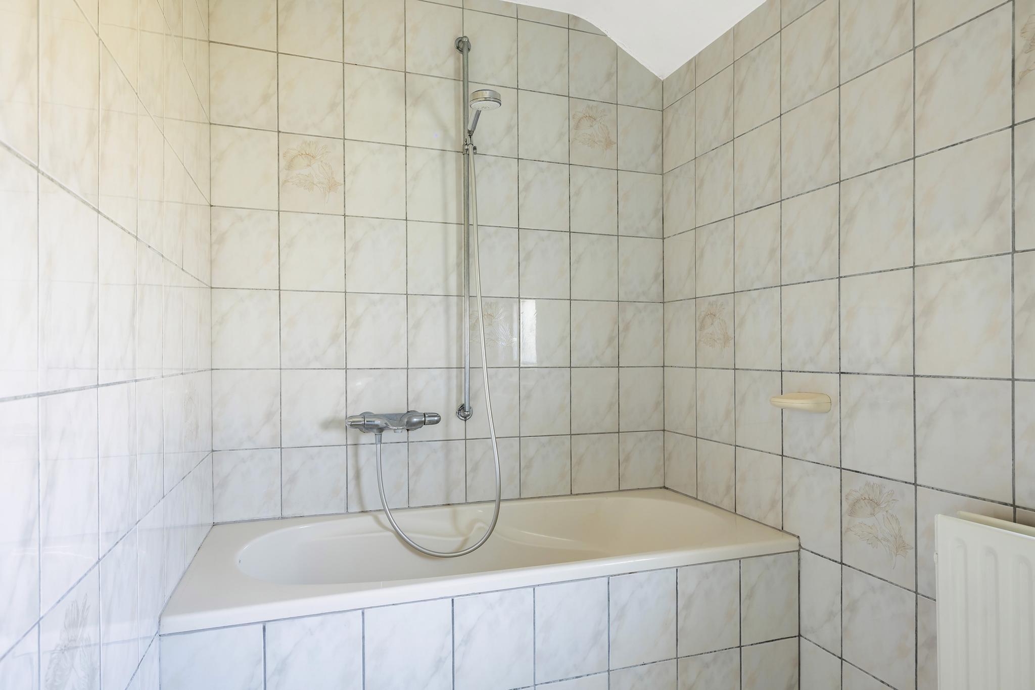Bijkeuken met deur naar achtertuin, wasaansluiting, opstelplaats CV-ketel (Nefit, 2015) en douchehoek met thermostaatkraan. Boven de bijkeuken is een kleine bergzolder aanwezig.