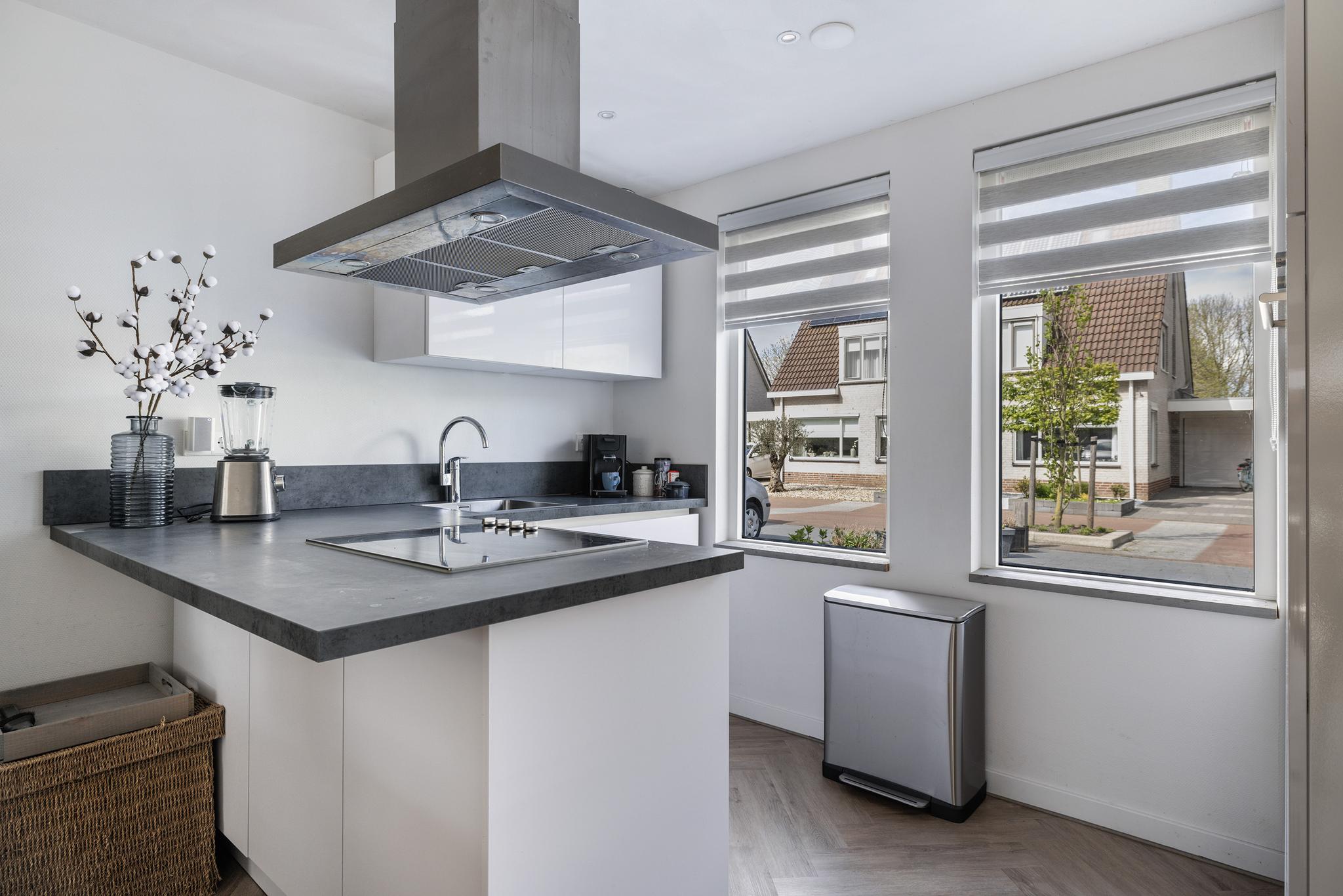 De keuken is geplaatst in een schiereiland met rvs schouw (2021), vaatwasser (2022), spoelbak, keramische kookplaat, en combi oven.