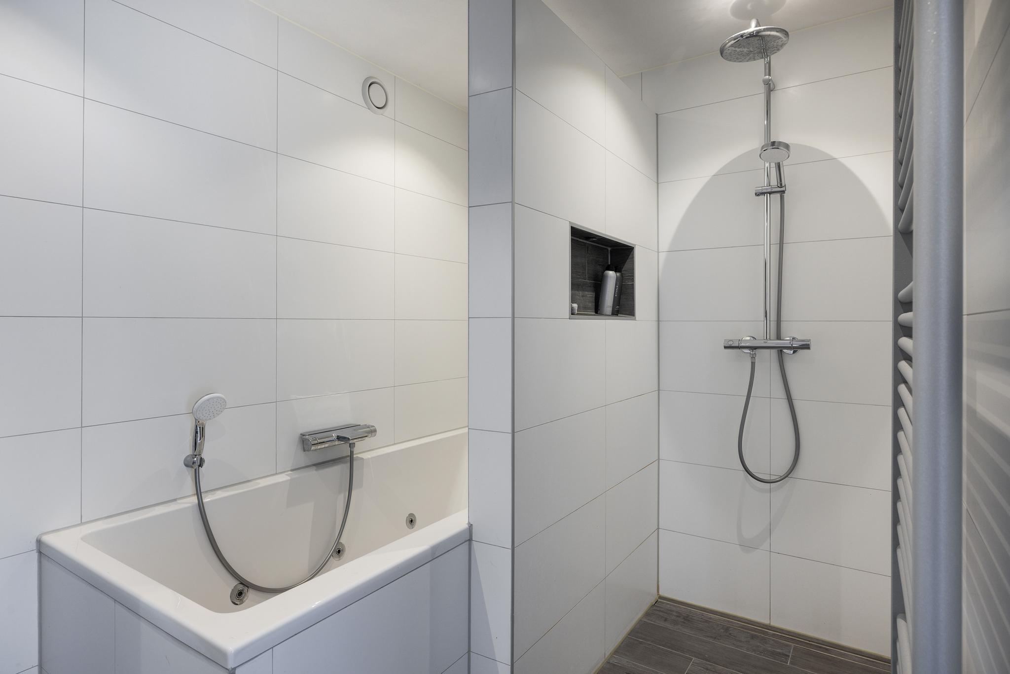 Aan de slaapkamer grenst een eigen luxe badkamer met bad en whirlpool, inloop douche (beide met thermostaatkraan), designradiator, wastafel en meubel, geheel betegelde wanden en vloerverwarming.