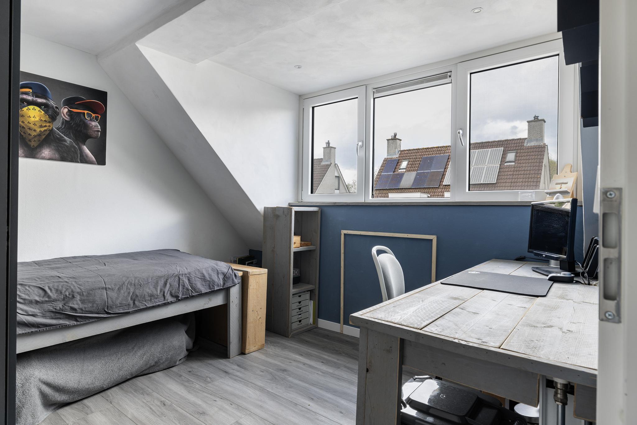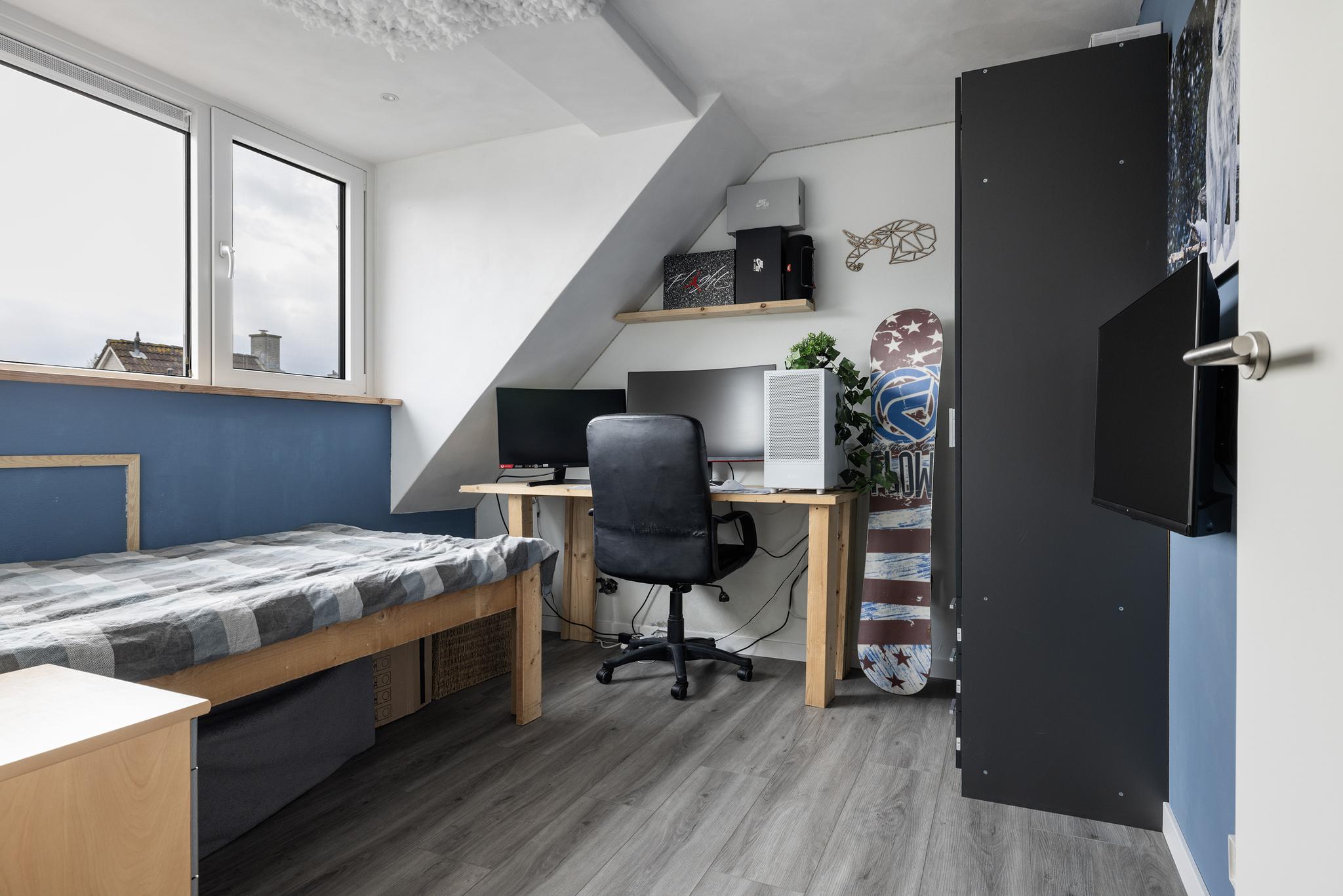 Slaapkamer 1 aan de achterzijde met bergruimte onder schuin dak, dakkapel en elektrisch rolluik.