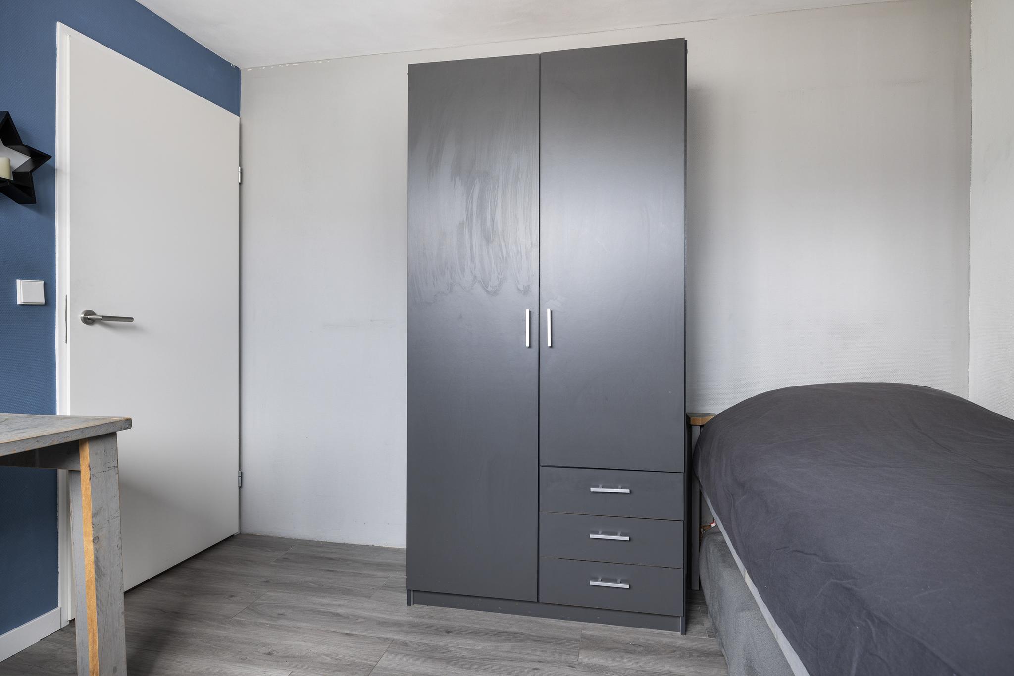 Ruime slaapkamer met grote vaste schuifkast en elektrisch rolluik.