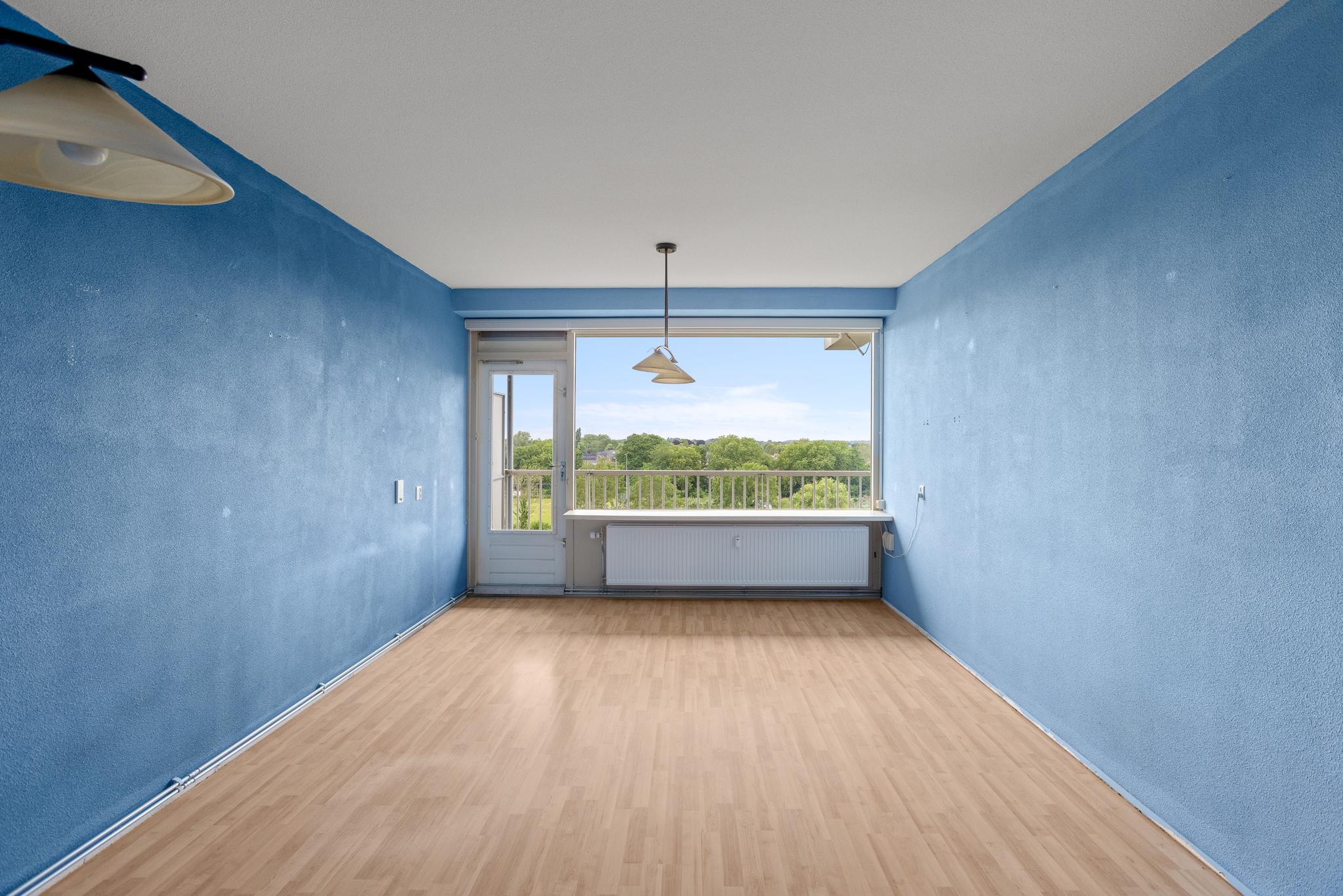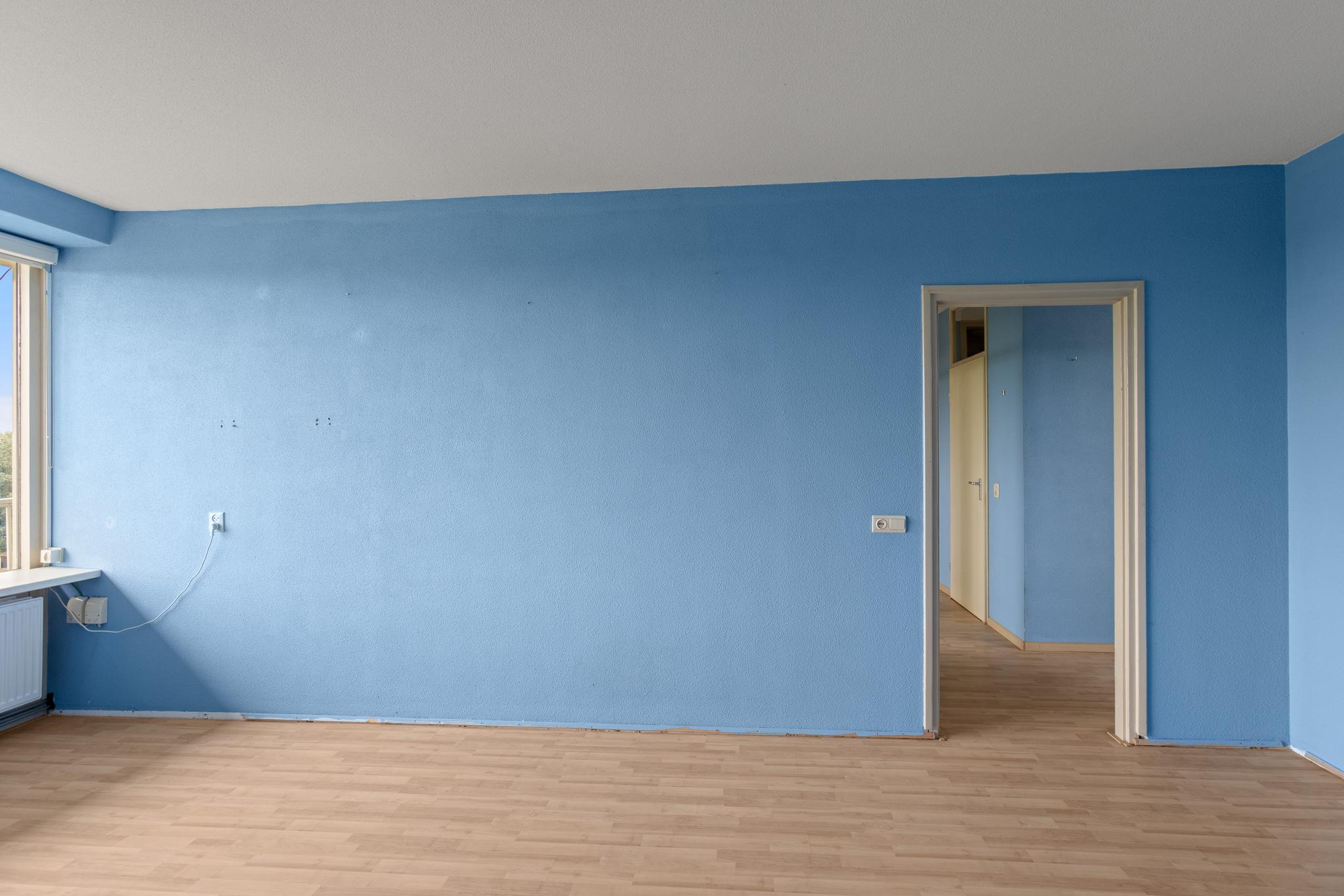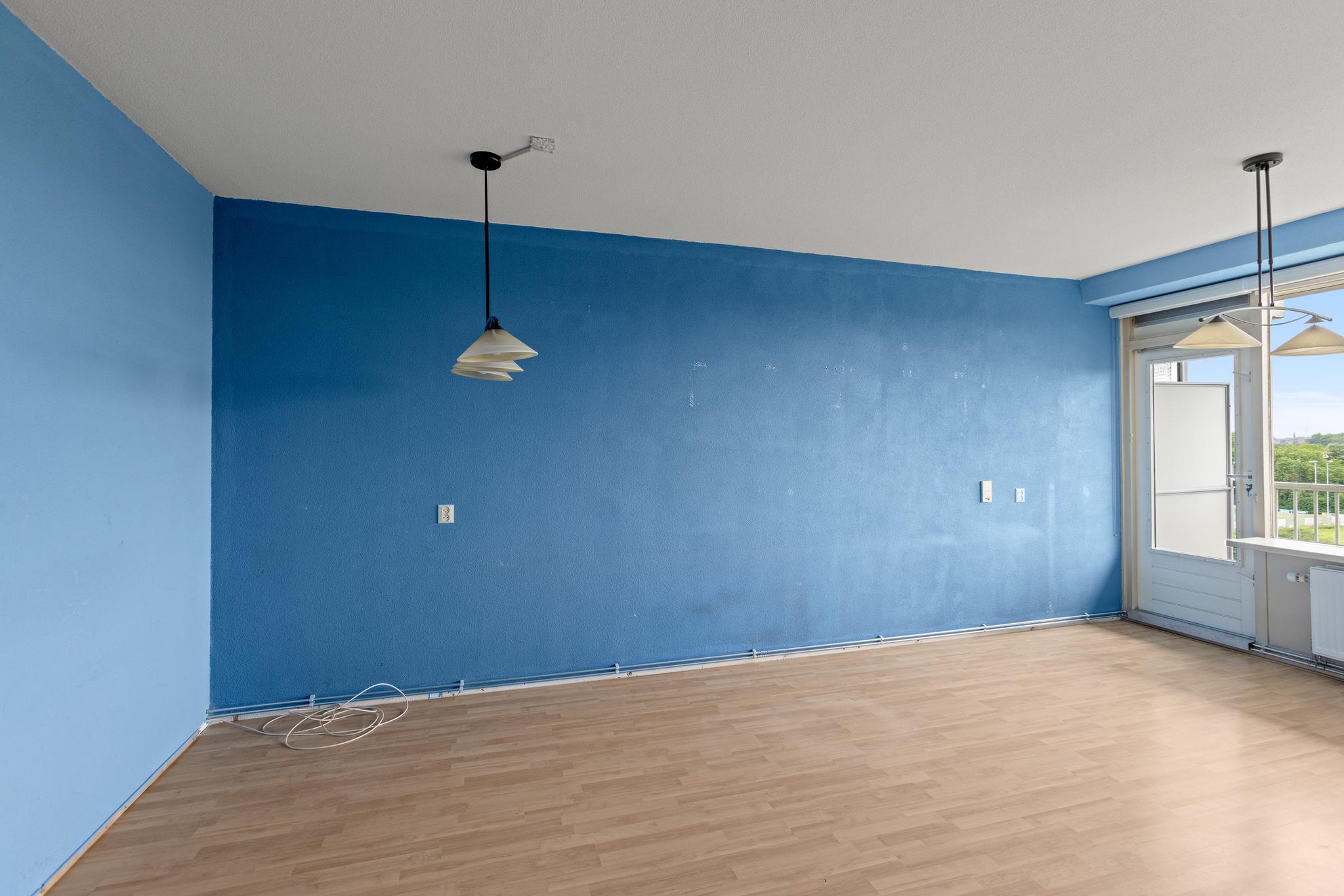 Aan de achterzijde van het appartement bevindt zich de ruime woonkamer met toegang tot het balkon over de gehele breedte van het appartement. Het balkon is voorzien van een elektrisch zonnescherm.