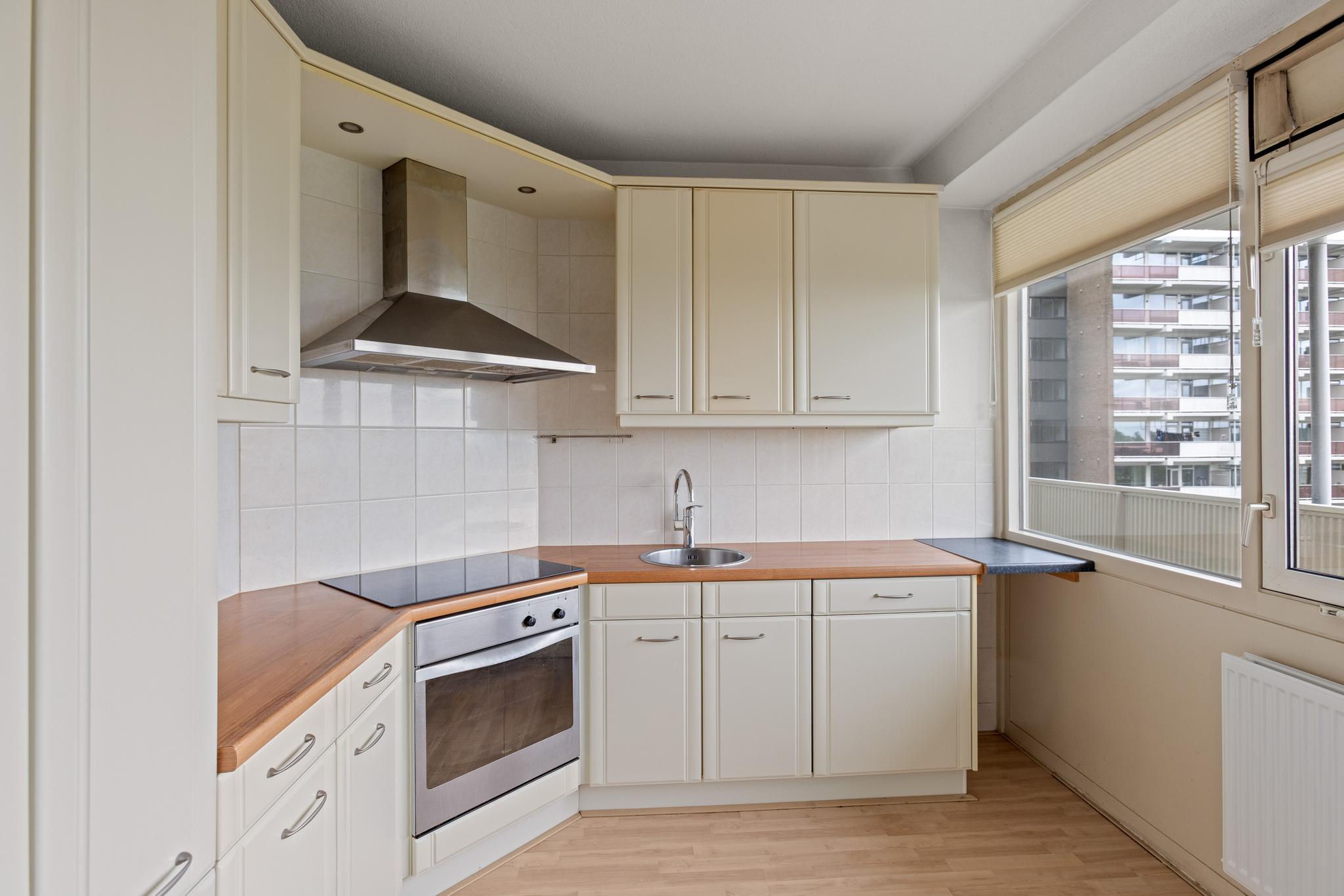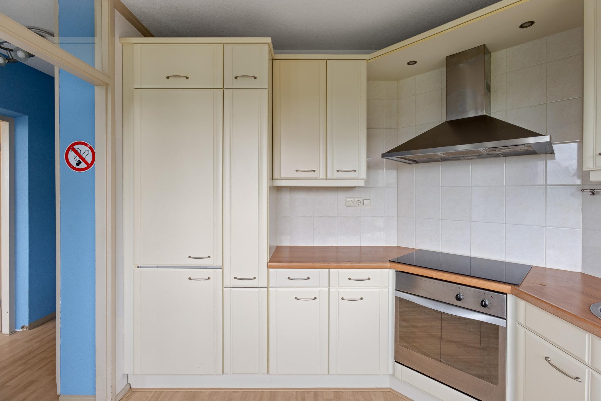 Aan de galerijzijde bevindt zich de eveneens ruime keukenruimte. De keuken in hoekopstelling is voorzien van een elektrische kookplaat, afzuigkap, koelkast, vriezer, oven, vaatwasser, apothekerskast en lekker veel bergruimte.