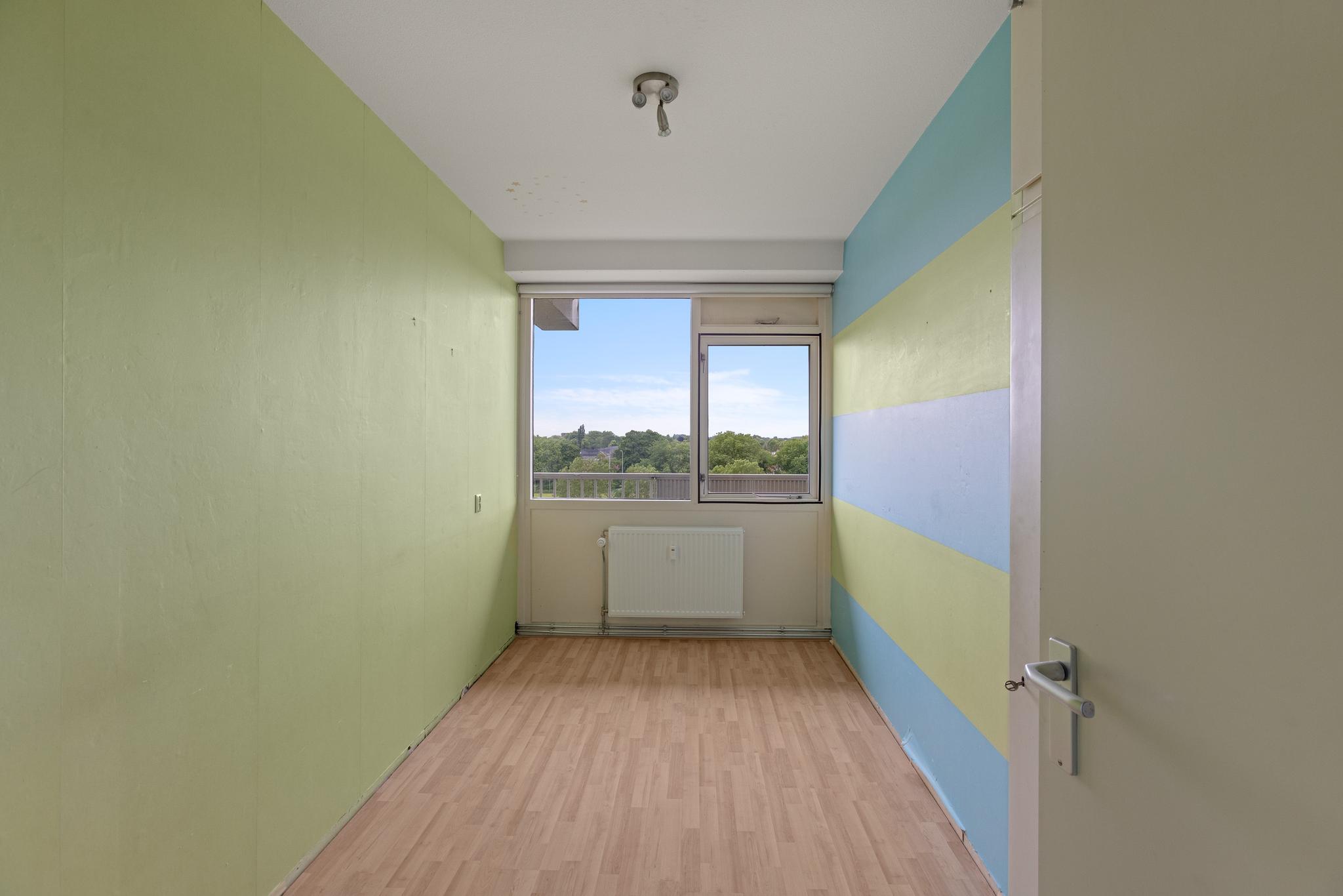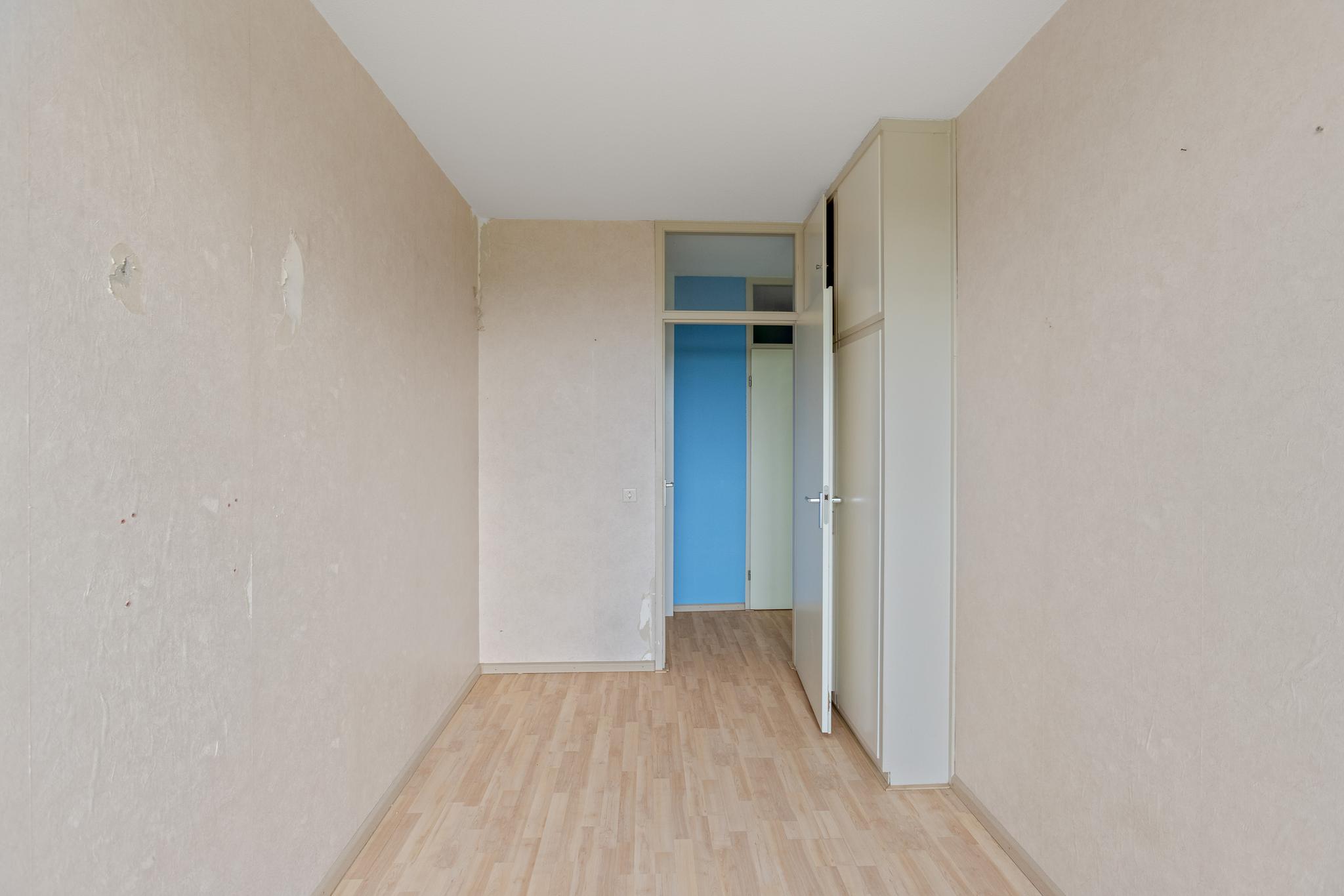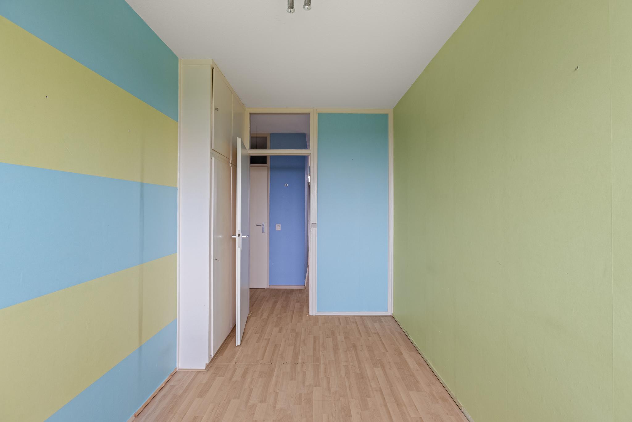 Slaapkamer 2 bevindt zich aan de achterzijde van het appartement, deze kamer is voorzien van een vaste kast, een laminaatvloer en behang wandafwerking.
