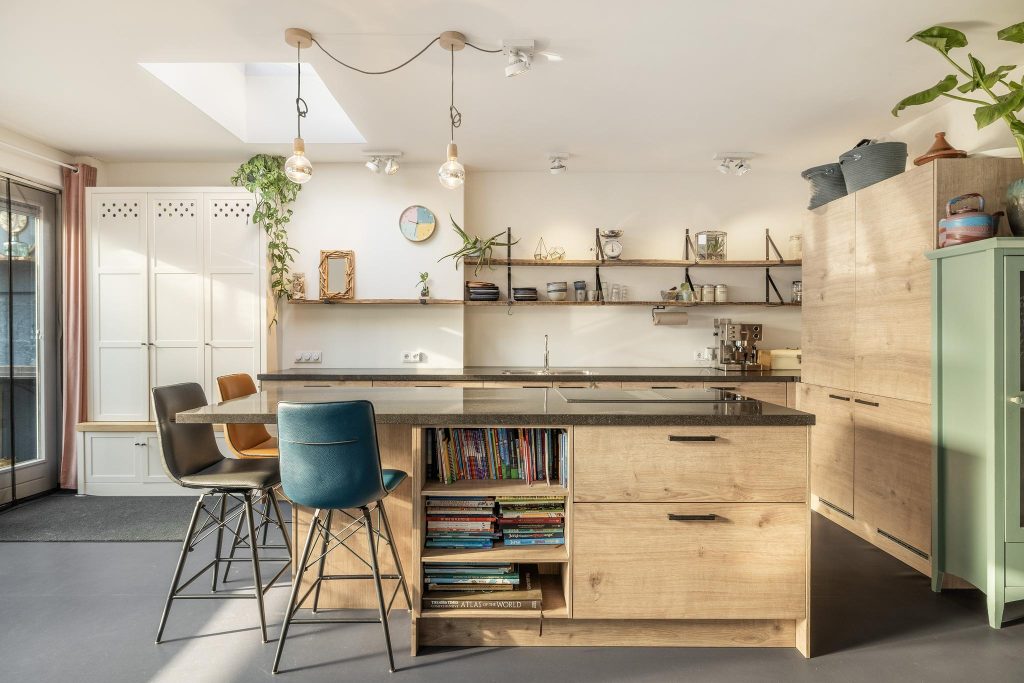 Wat in de woonkamer direct opvalt, is de ruimtelijkheid en lichtinval. Door de aanbouw aan achterzijde met mooie lichtstraat komt er enorm veel licht de woonkamer en keuken in. Te warm hoeft het daardoor zeker niet te worden, met de airconditioning houdt je deze ruimte het hele jaar door aangenaam. Achterin de woonkamer bevindt zich de open keuken, het toilet en dubbele deuren naar de zonnige achtertuin.
