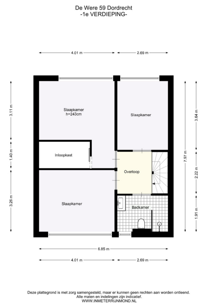 De hele verdieping heeft een laminaat vloer en stuc wanden.