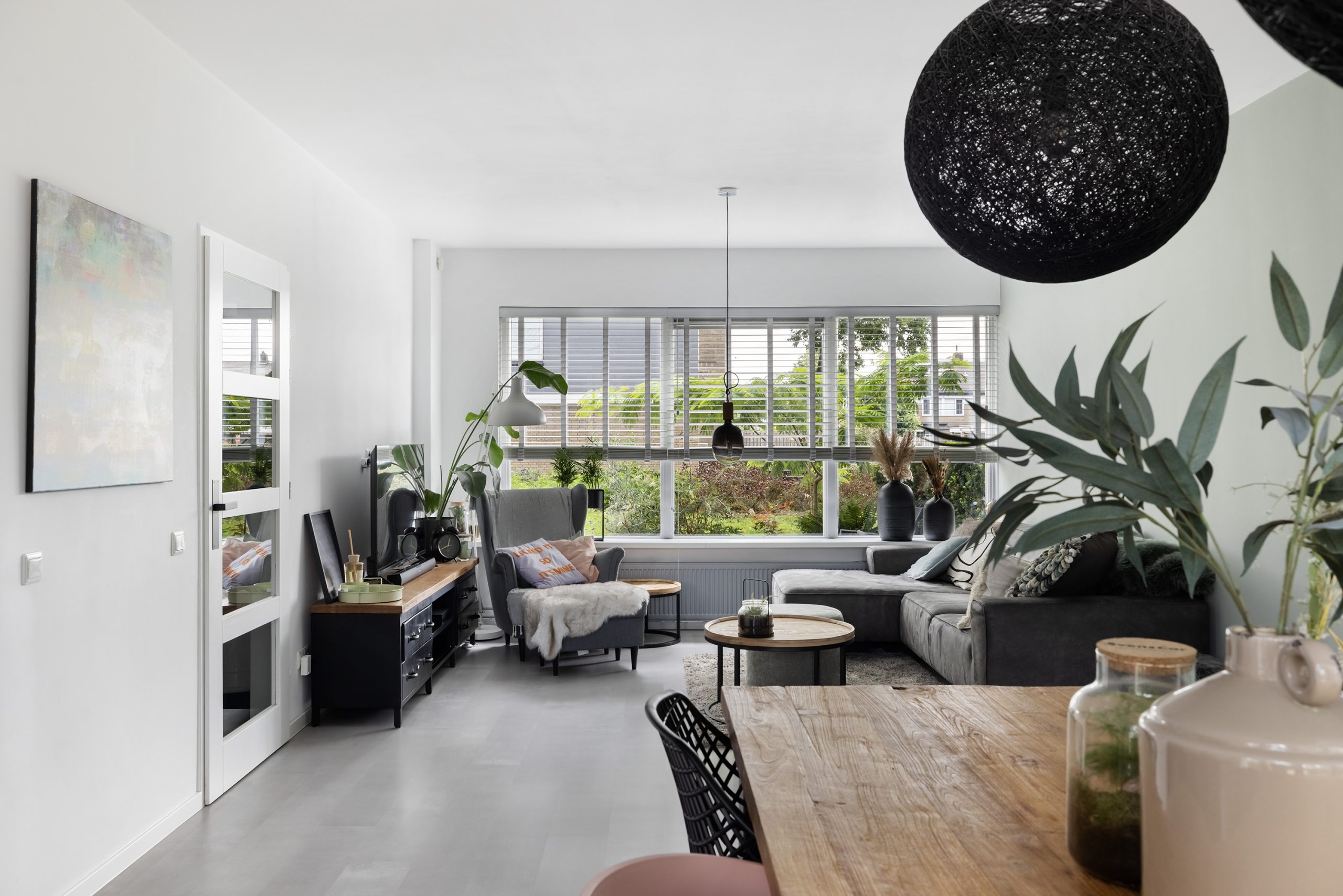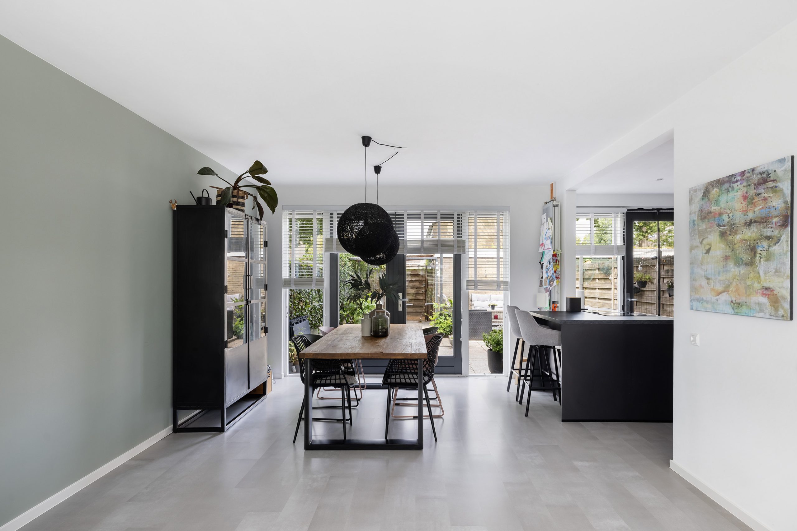 Heerlijk grote en lichte woonkamer, vanuit elk raam kijk je heerlijk het groen in. Aan de achterzijde is de open keuken gesitueerd. Grote openslaande deuren aan de achterzijde met toegang tot de tuin.
