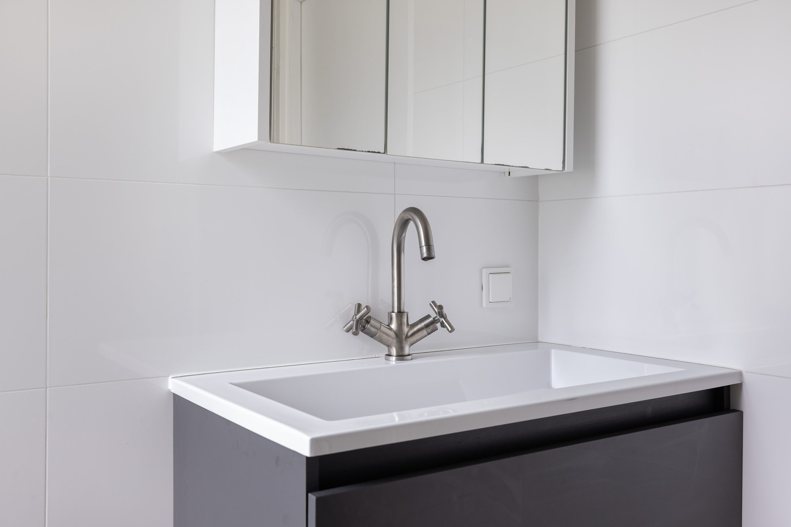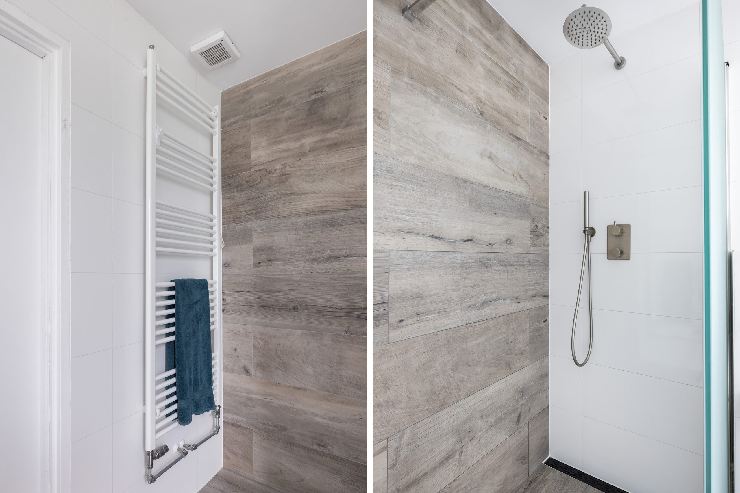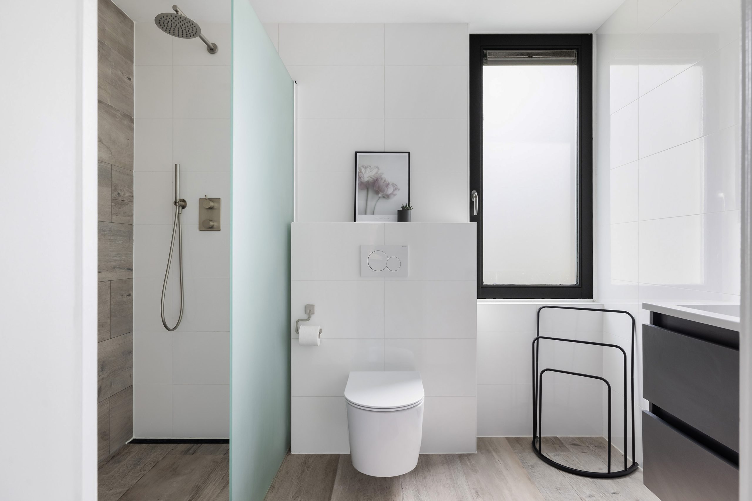 De badkamer is in 2021 nieuw geplaatst en afgewerkt met een designradiator, ruime inloopdouche, vrijhangend toilet, wastafel met meubel, geheel betegelde wanden en verlaagd plafond met spots. De elektrische ventilator is defect. Wel is er een raam met rooster aanwezig voor de beluchting.