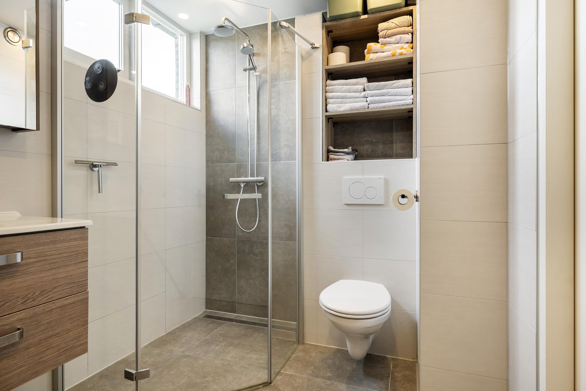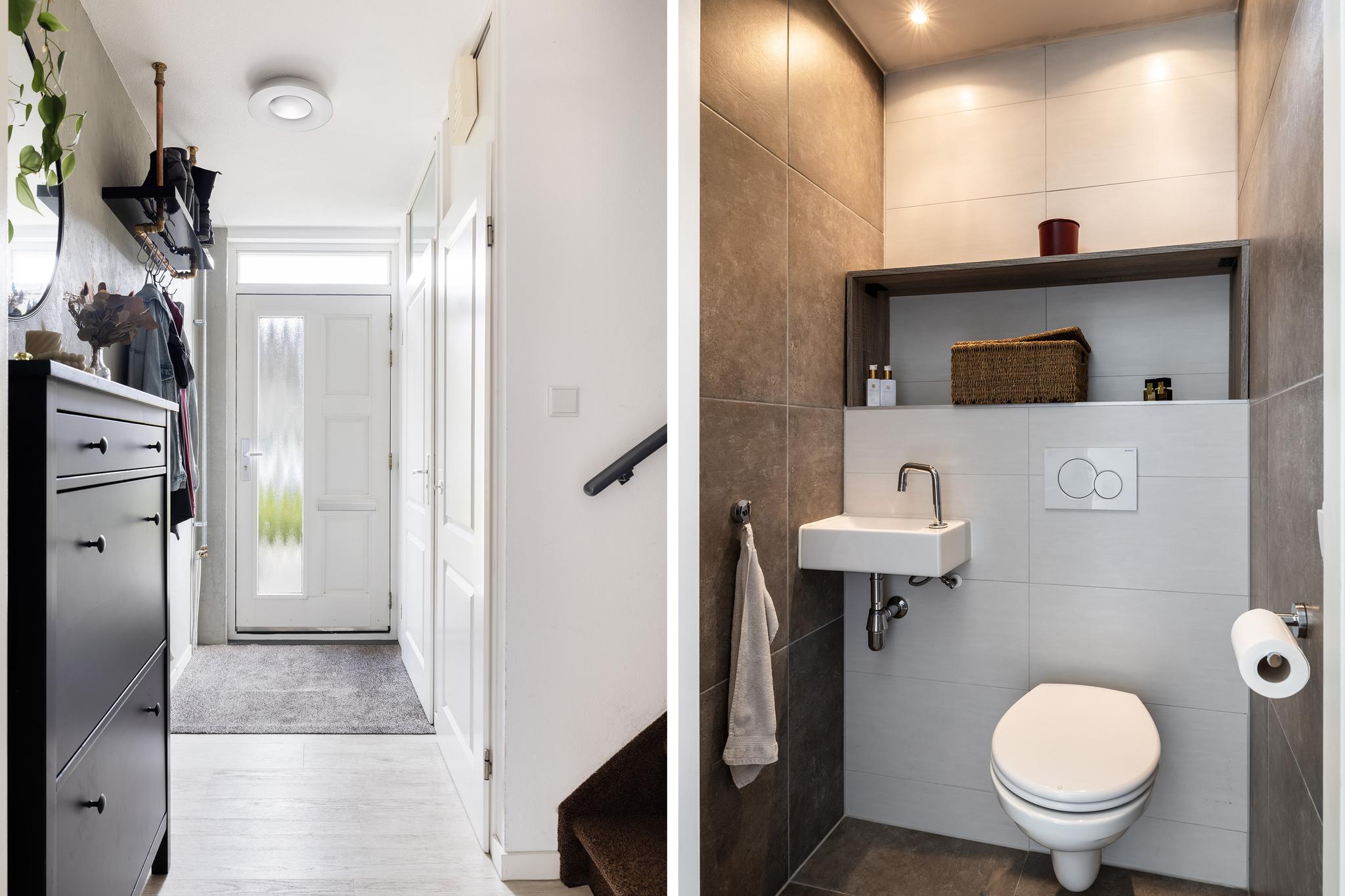 Hal met modern toilet (volledig betegeld, fontein), meterkast (7 groepen, slimme meters, glasvezel) en toegang tot de woonkamer.