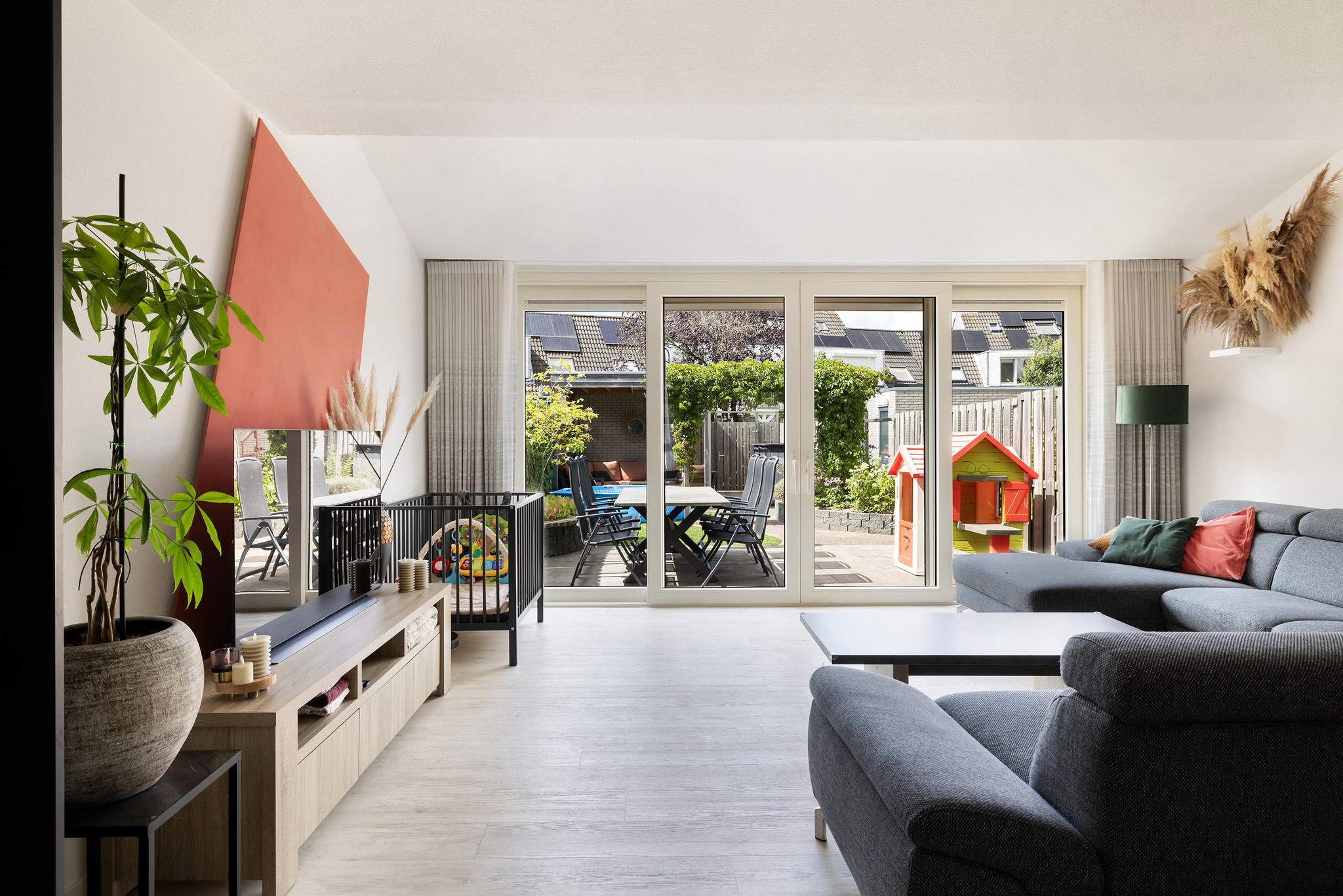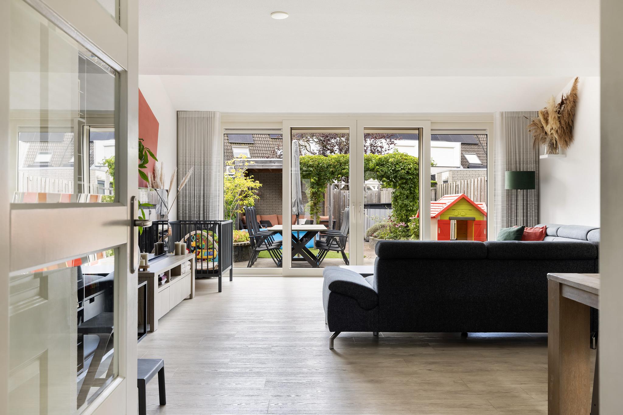Ruime woonkamer met uitbouw gelegen aan de achterzijde van de woning met brede kunststof schuifpui naar de achtertuin, een nette PVC vloer met vloerverwarming, spagtelputz wandafwerking en een trapkast. De schuifpui is voorzien van een plisé hordeur.
