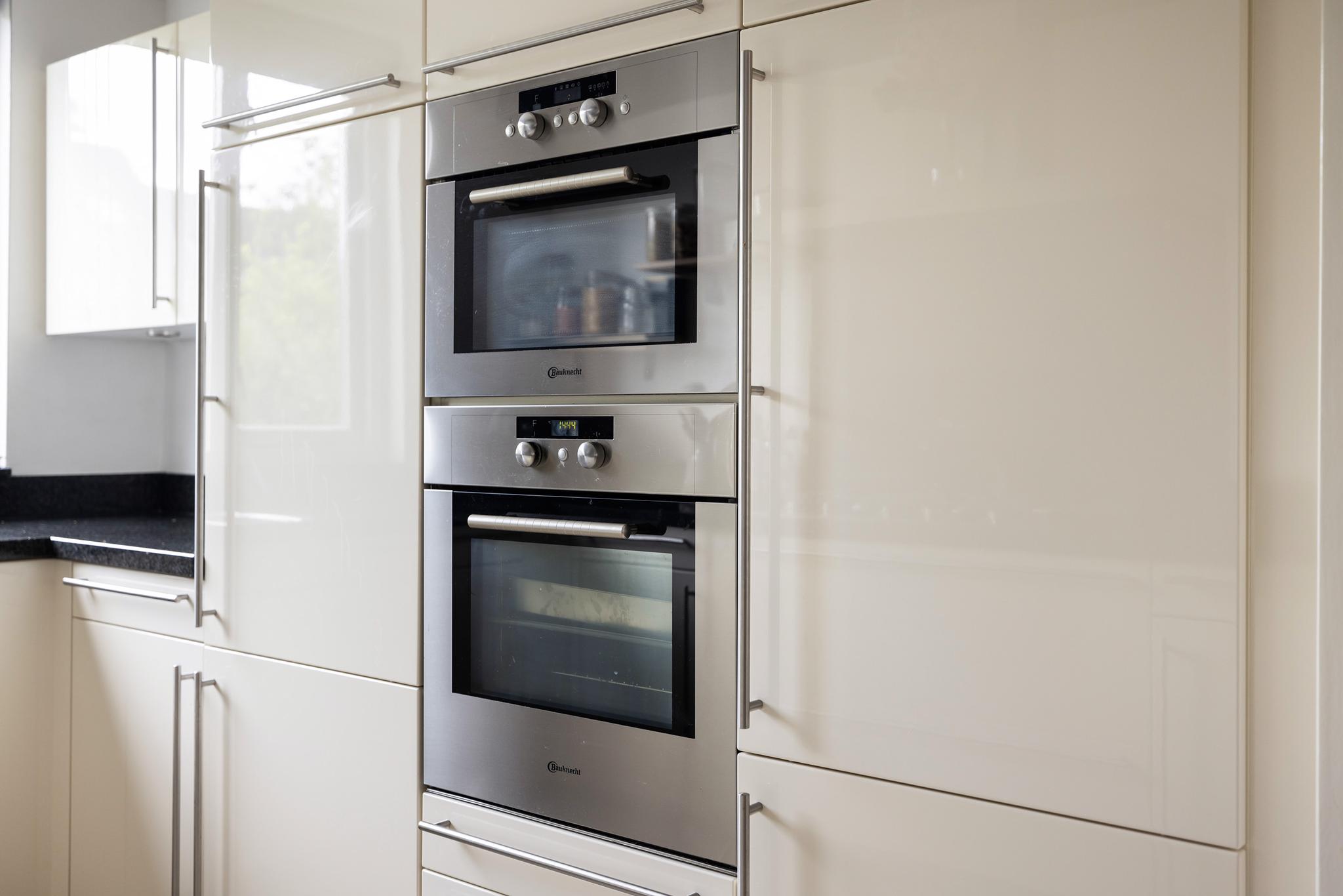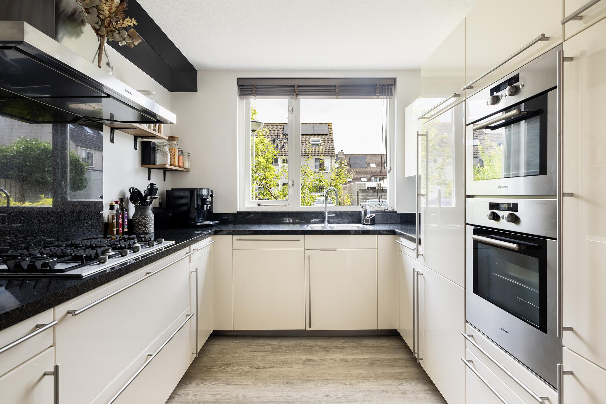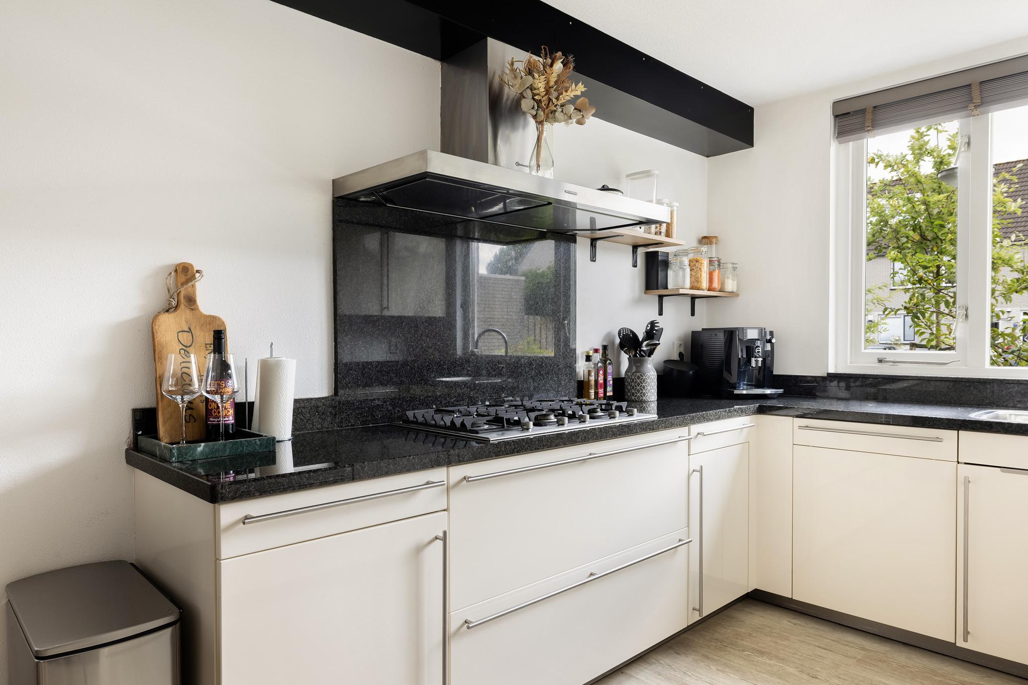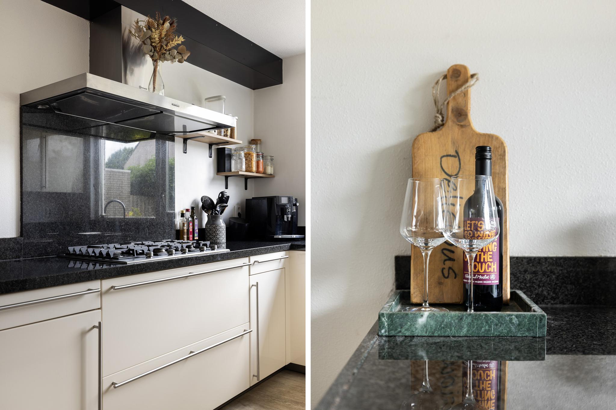 Moderne keuken in U-opstelling, voorzien van 1,5 spoelbak, 5 pit gaskookplaat, afzuigkap, oven, combi-magnetron, vaatwasser, grote koelkast en grote vriezer, Quooker kraan en een granieten werkblad.