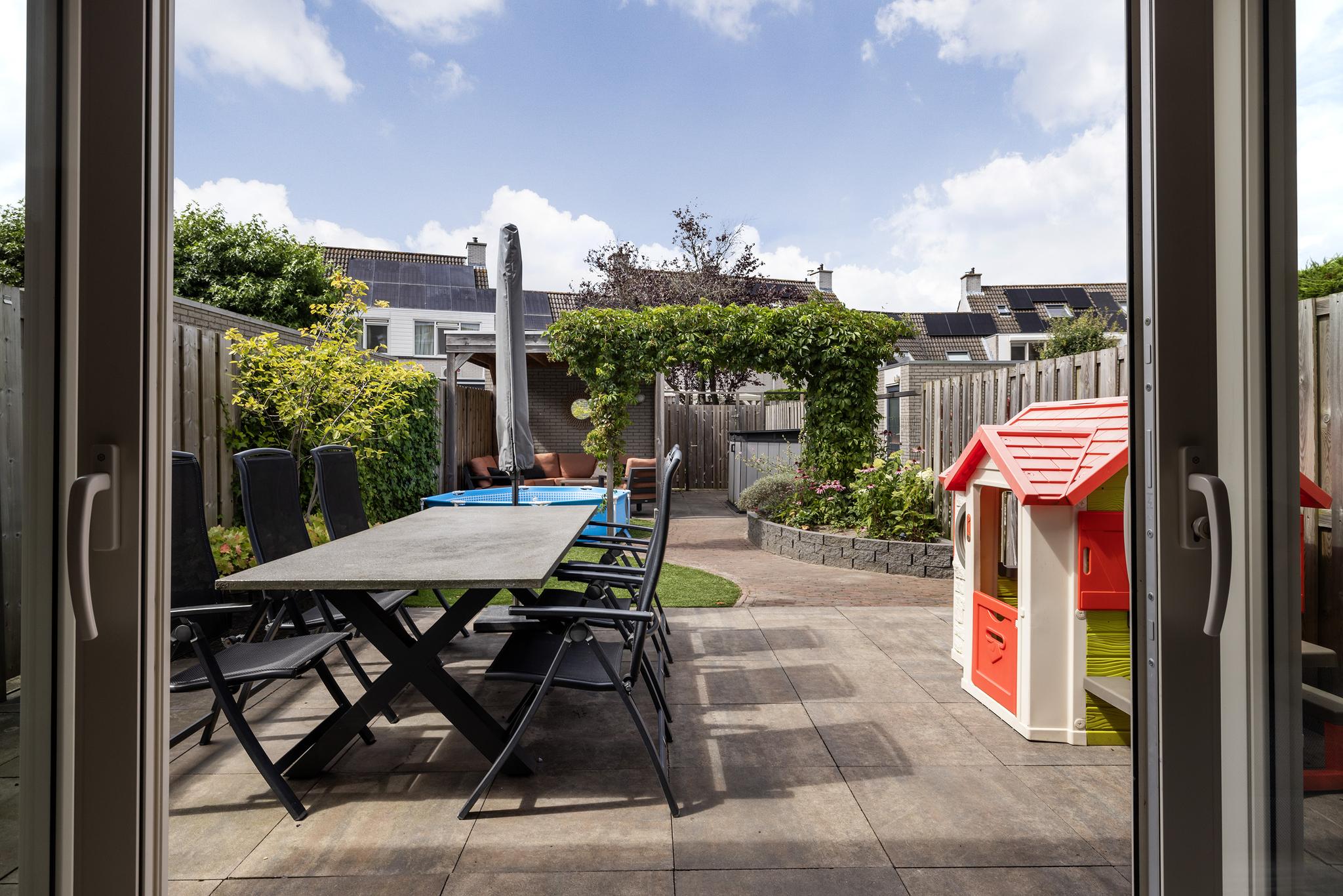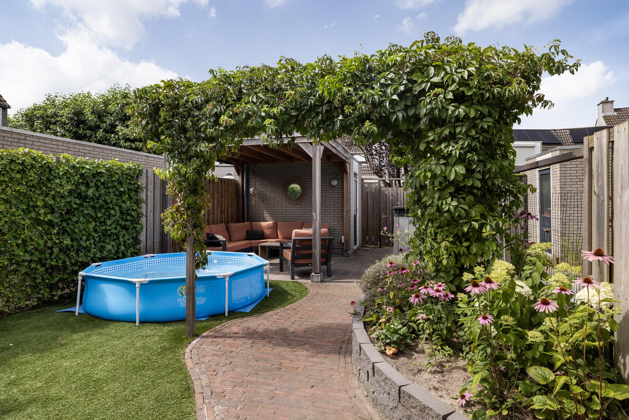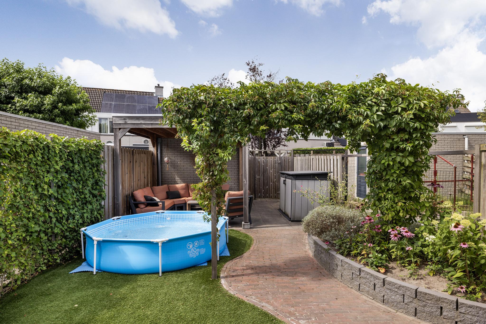 De achtertuin is gelegen op het noordwesten en maar liefst 14 meter diep. De tuin is fraai aangelegd met een fijn terras direct aan de woonkamer gelegen, een ruime stenen berging achterin de tuin met een aangebouwde overkapping, een border met leuke begroeiing en kunstgras. Verder is de tuin voorzien van een zonnescherm en achterom.