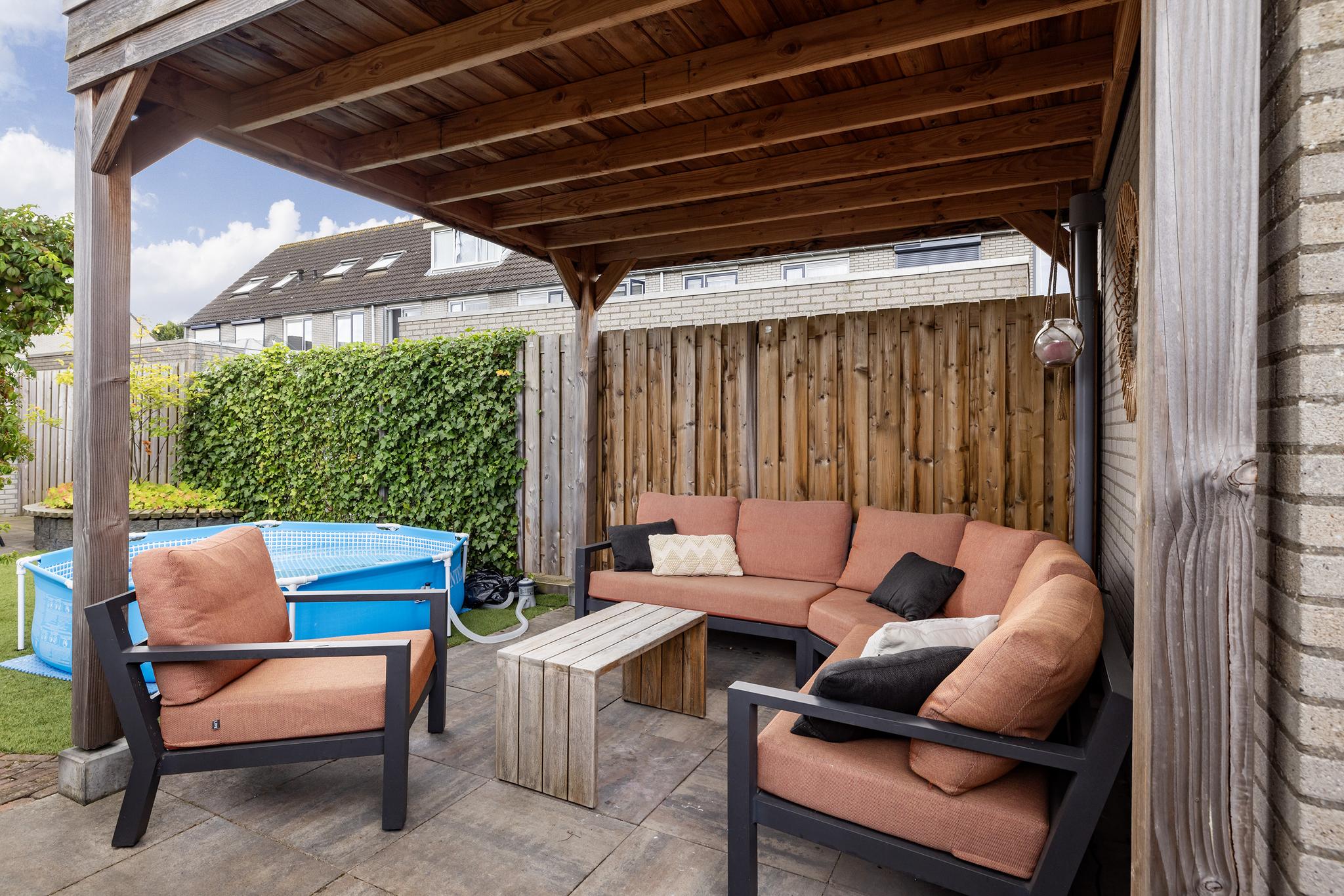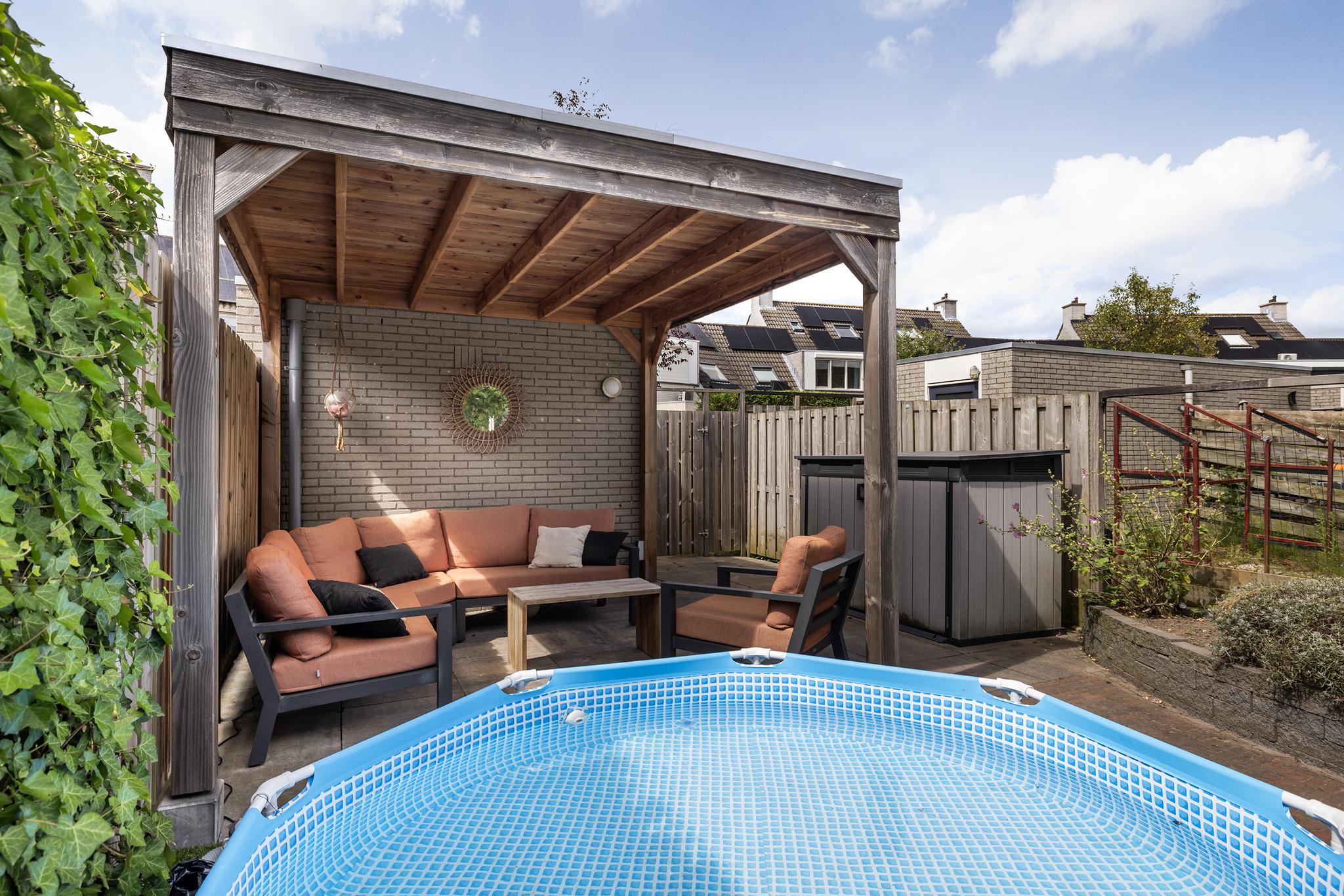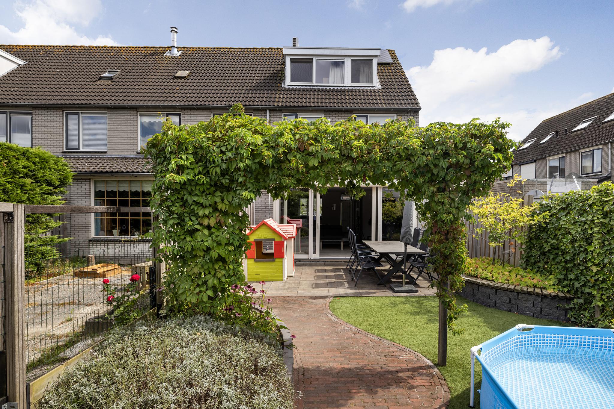 De achtertuin is gelegen op het noordwesten en maar liefst 14 meter diep. De tuin is fraai aangelegd met een fijn terras direct aan de woonkamer gelegen, een ruime stenen berging achterin de tuin met een aangebouwde overkapping, een border met leuke begroeiing en kunstgras. Verder is de tuin voorzien van een zonnescherm en achterom.