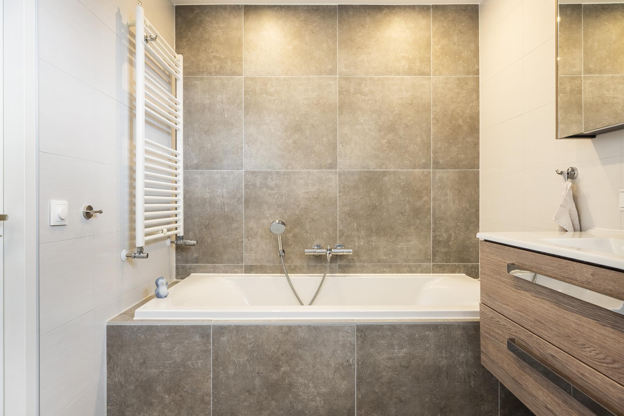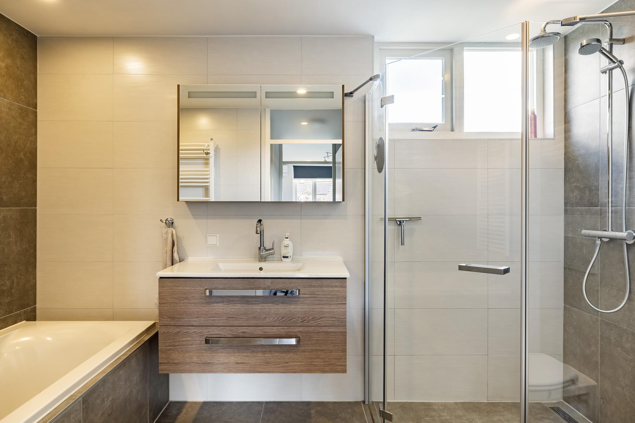 Moderne badkamer (geheel betegeld) met zowel een ligbad als een ruime douche (beide met thermostaatkraan), een brede wastafel met spiegelkast, toilet, designradiator en inbouwspots.