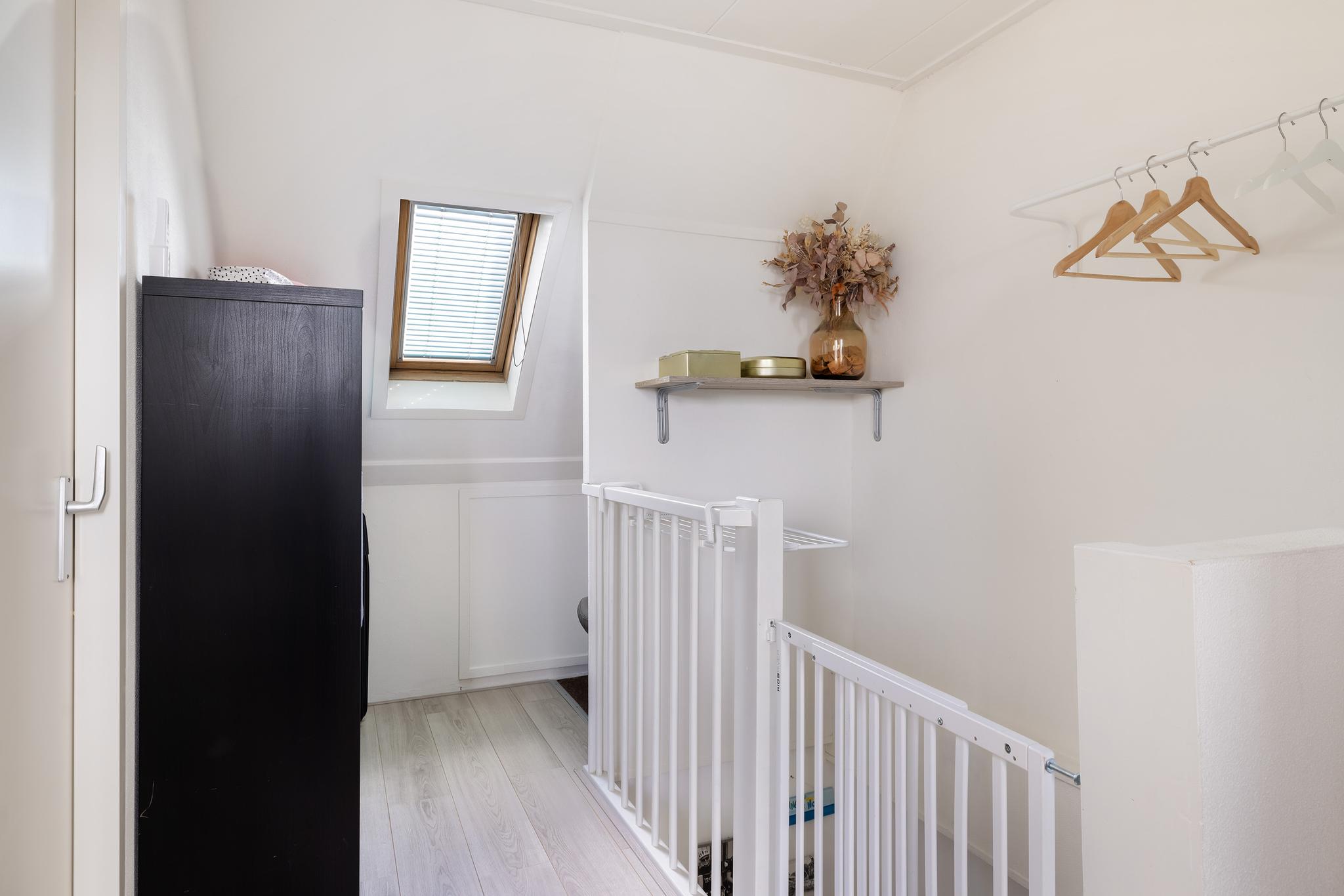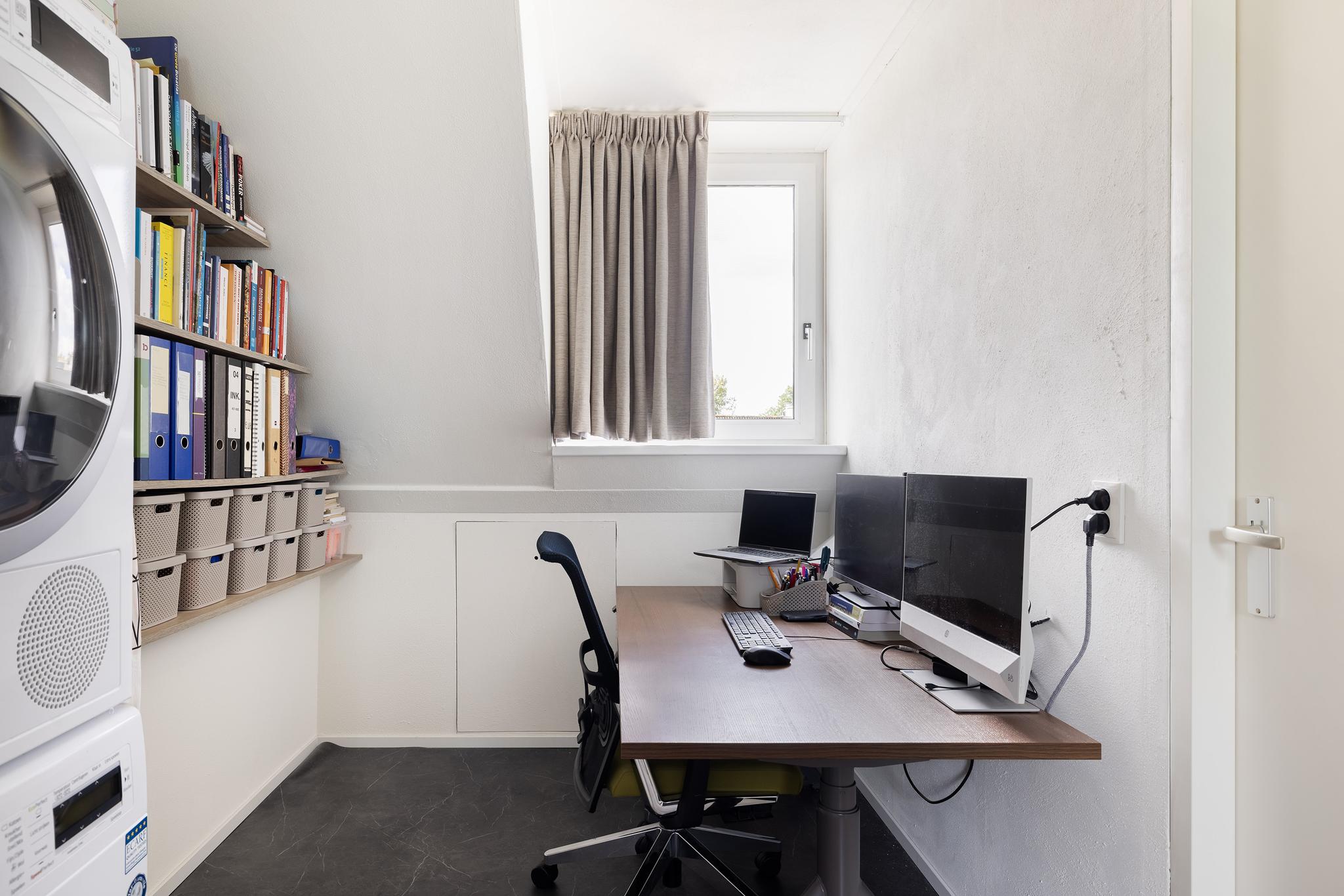 Ruime overloop met wasaansluiting, opstelplaats CV-ketel (Remeha, 2021), mechanische ventilatie, een dakraam en vlizotrap naar de verrassend grote vliering. Verkopers hebben op de overloop tevens een fijne kantoorruimte gecreëerd, zo wordt optimaal gebruik gemaakt van de ruimte.
