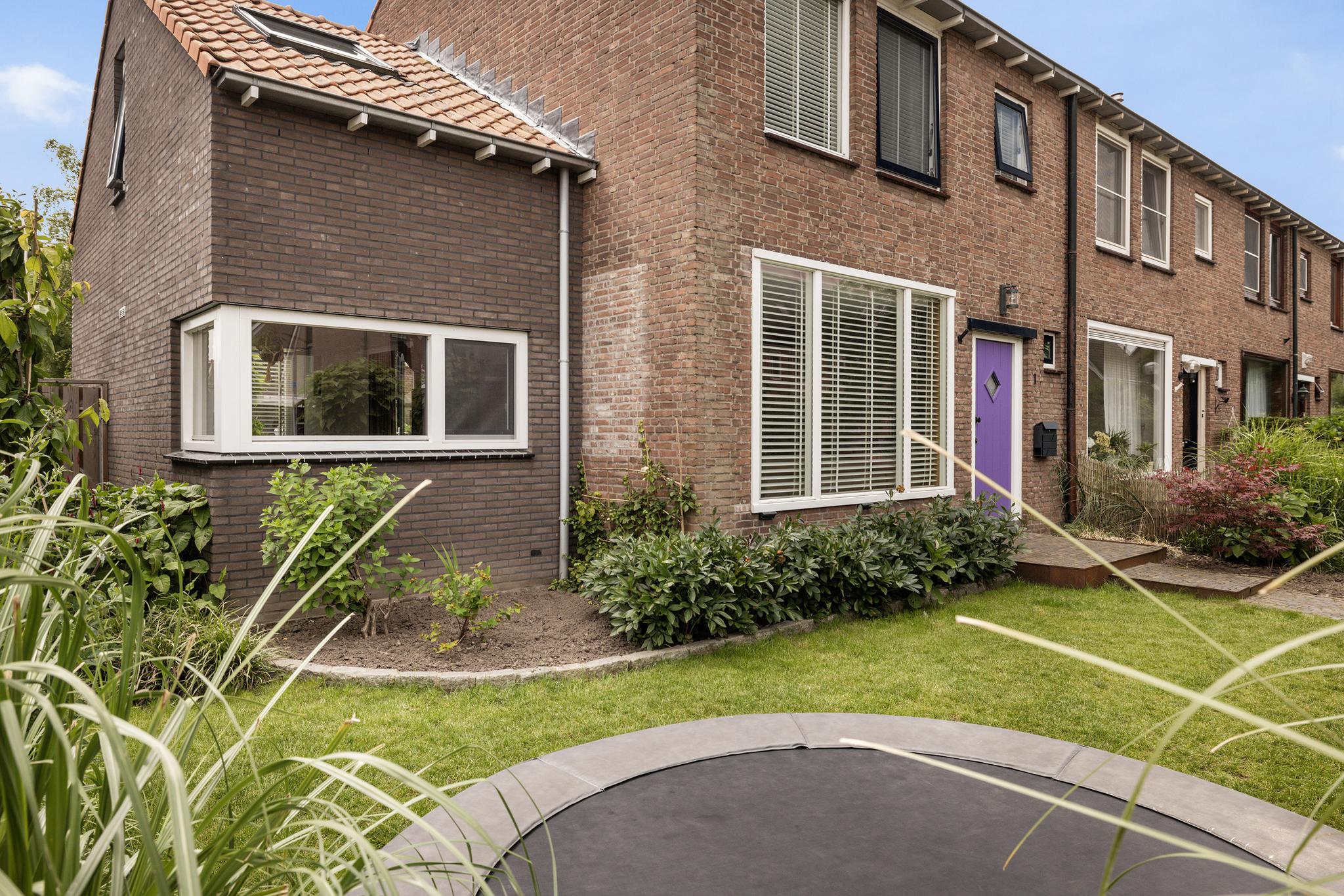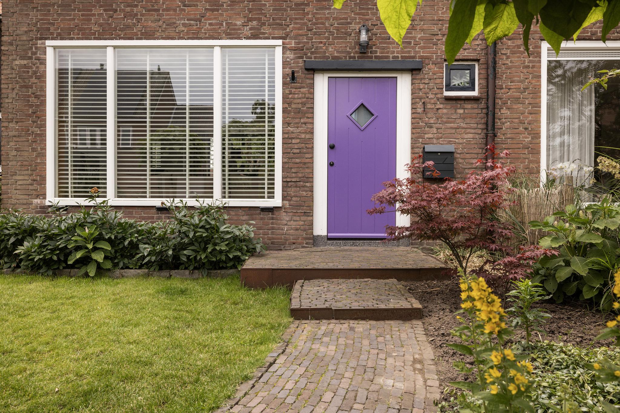 Via de ruime voortuin loop je over het klinkerpad en langs de trampoline naar de paarse voordeur. Opvallend? Jazeker! Maar de kinderen zullen niet snel vergeten bij welke deur ze moeten zijn ;)