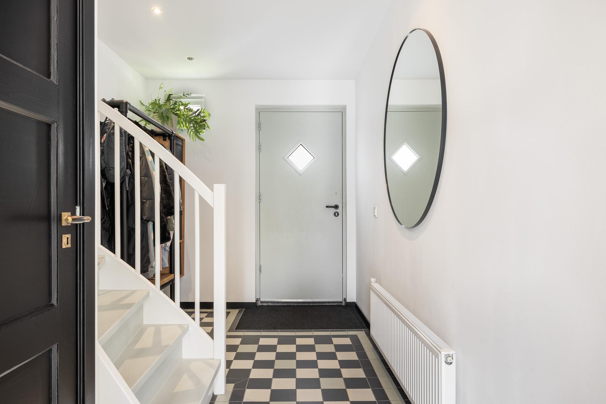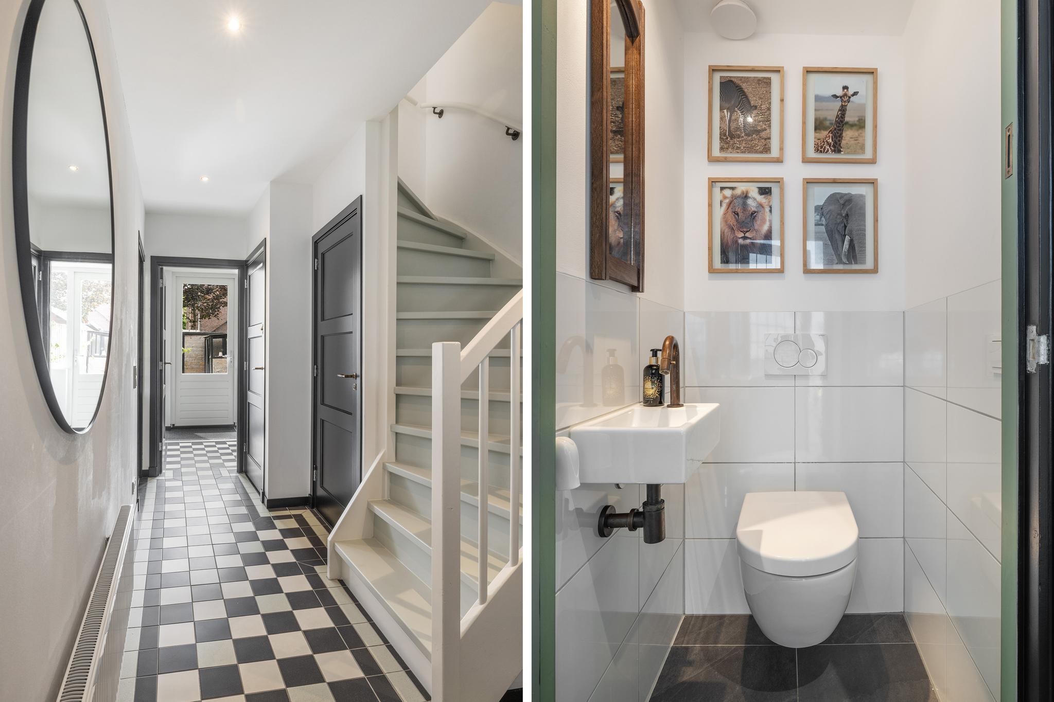 Ruime hal met zwart/witte tegelvloer, toilet met fontein, trapkast met meterkast (14 groepen + 1 dubbele groep, 4 aardlekschakelaars, slimme meters, glasvezel), toegang tot woonkamer en bijkeuken.