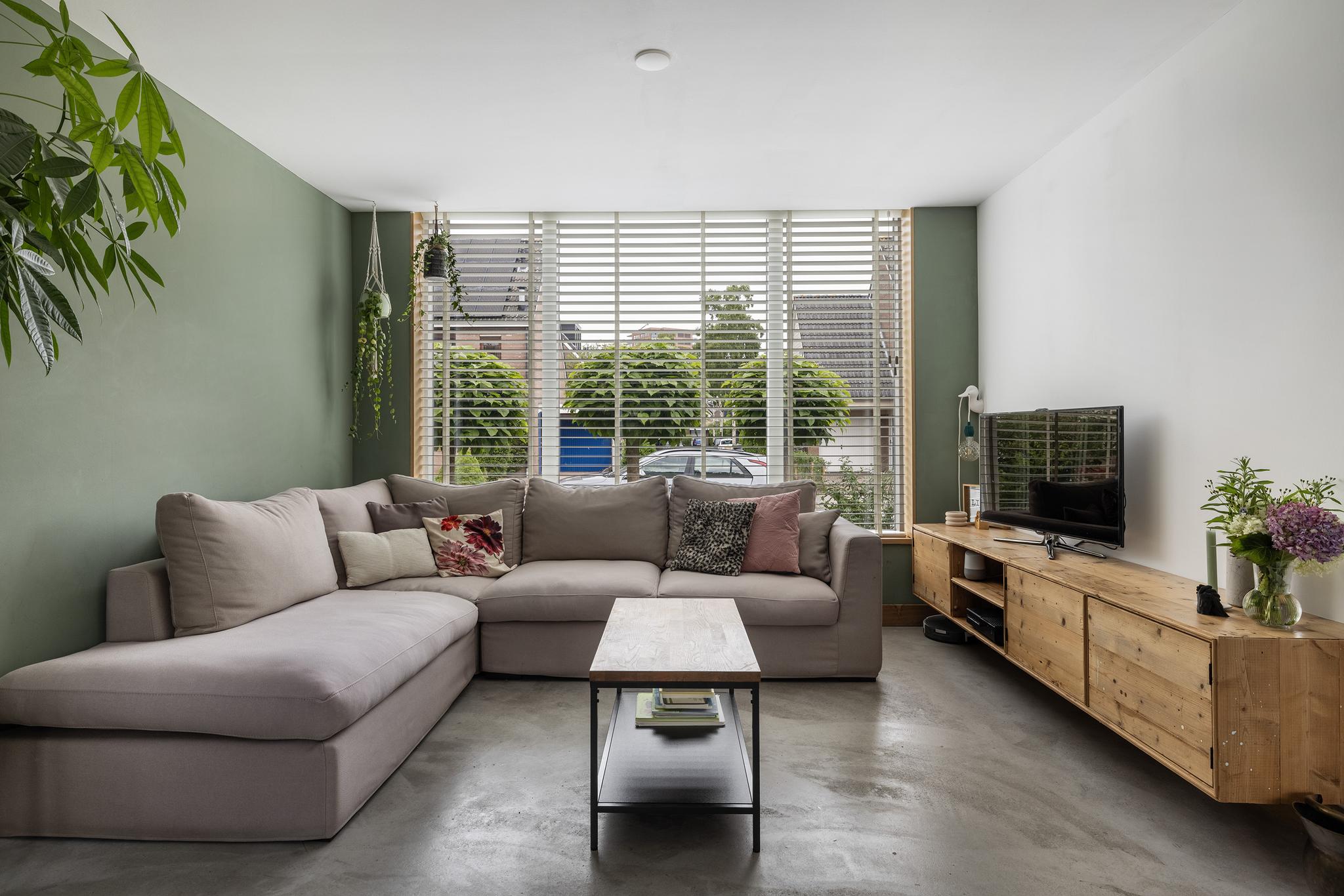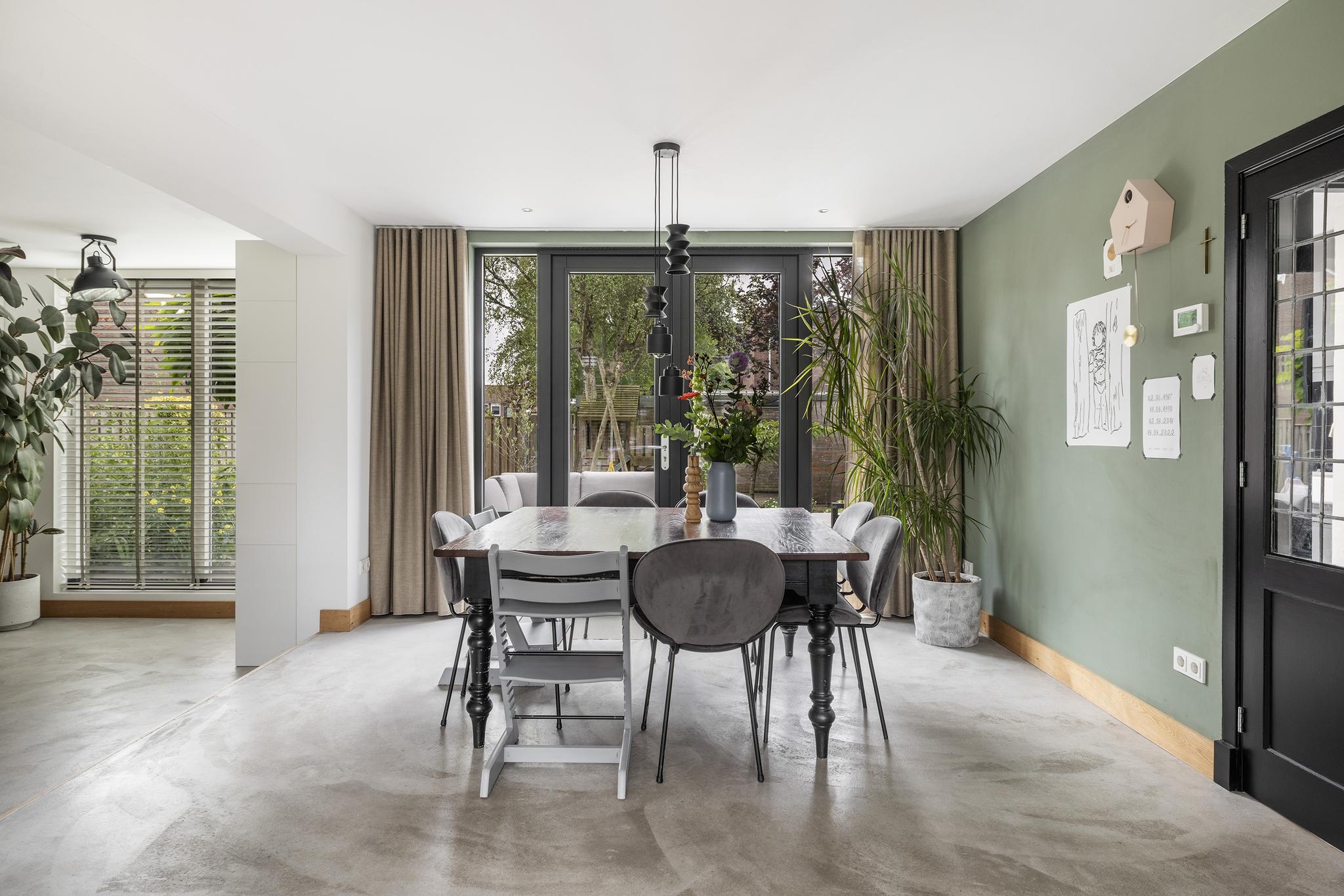 Lichte en sfeervolle woonkamer met open keuken in de aanbouw. In 2018 is de ruime zijuitbouw geplaatst, de gehele woonkamer voorzien van een strakke betonpleistervloer met vloerverwarming en stucwerk wandafwerking en een nieuw haardkanaal aangelegd. De woonkamer is verder voorzien van dubbele tuindeuren en een tussendeur met glas in lood.