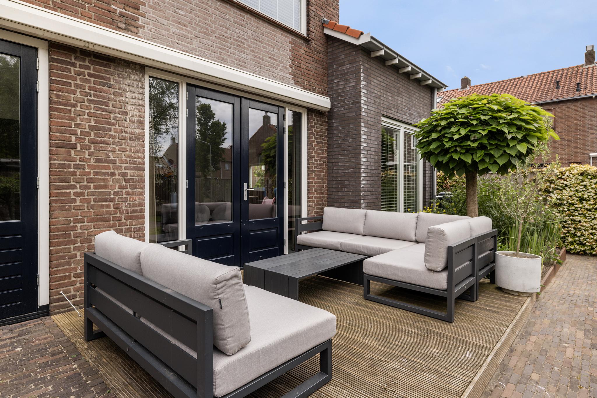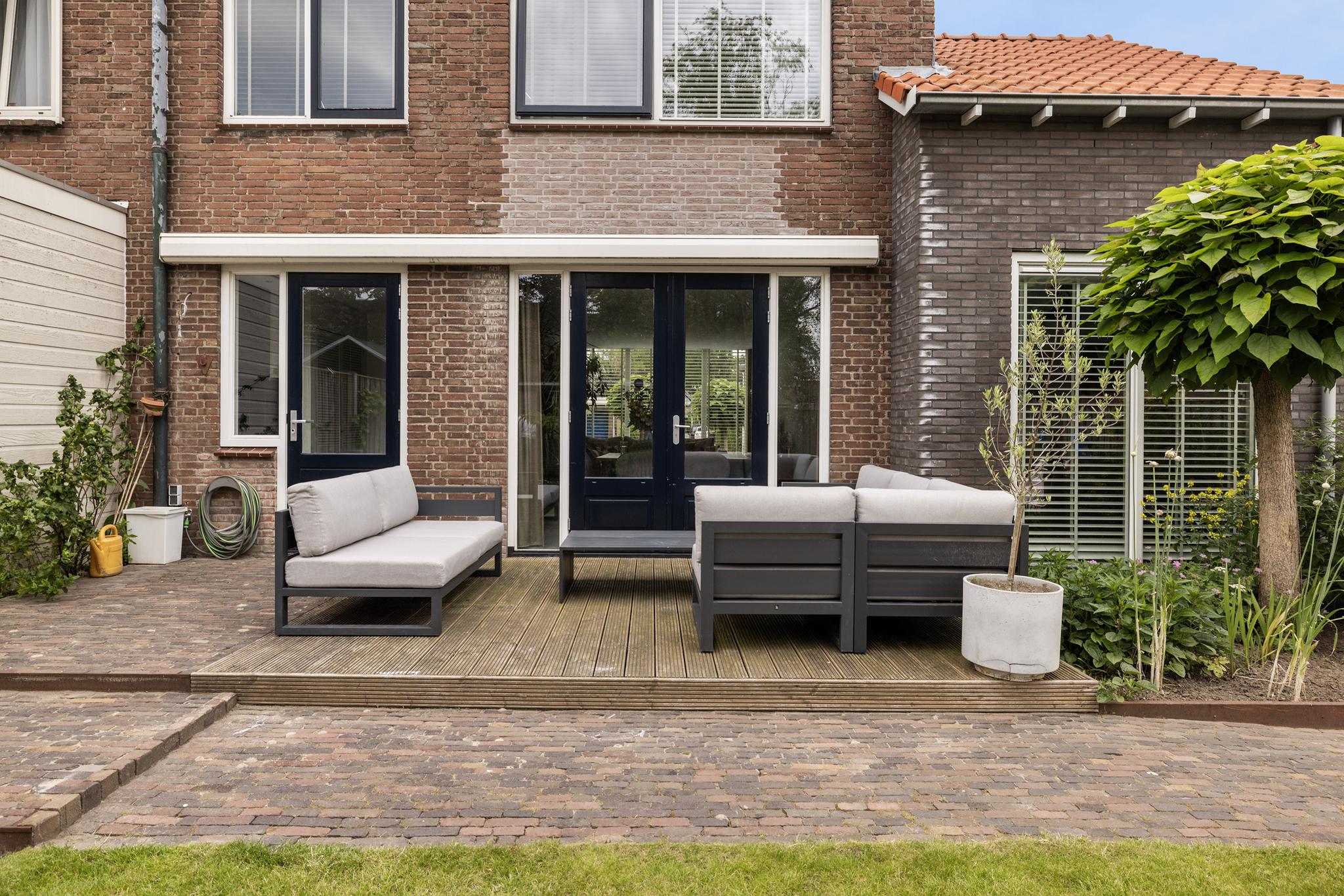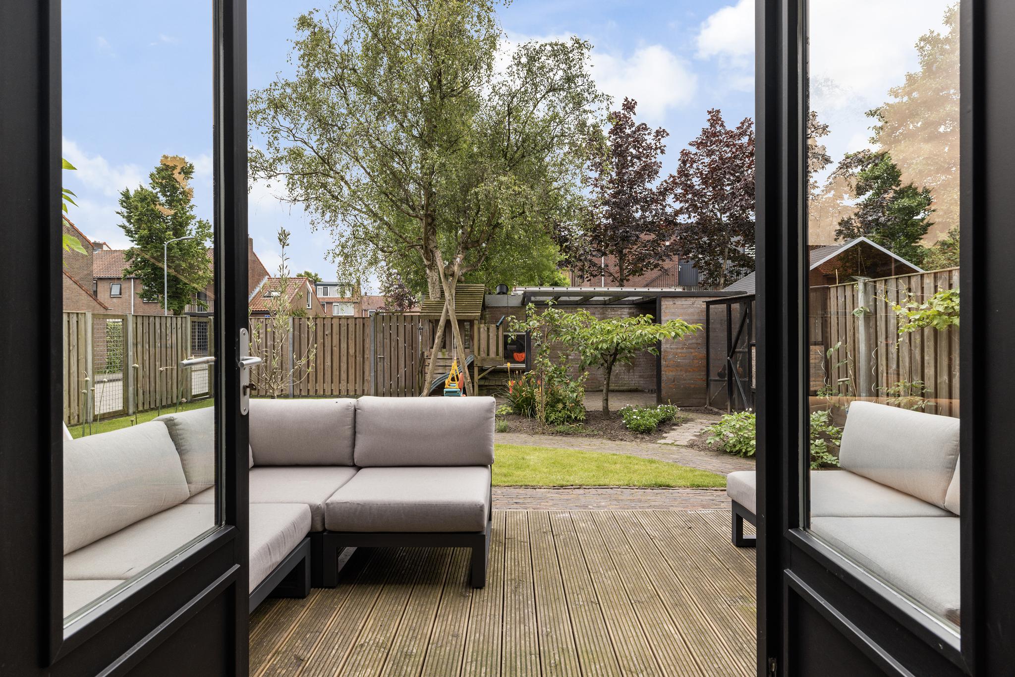 Wat een fantastische achtertuin is dit, heerlijk breed en zonnig gelegen op het zuidwesten. De tuin is fraai aangelegd met klinkers, vlonderpanelen, schuttingen met klimplanten, diverse borders met beplanting en een grasmat waar Oranje jaloers op zou zijn!