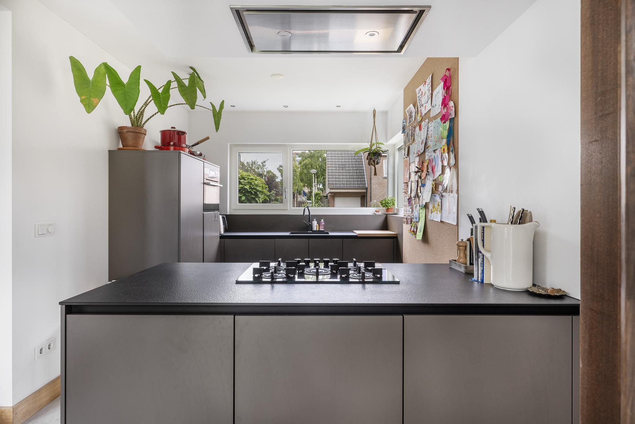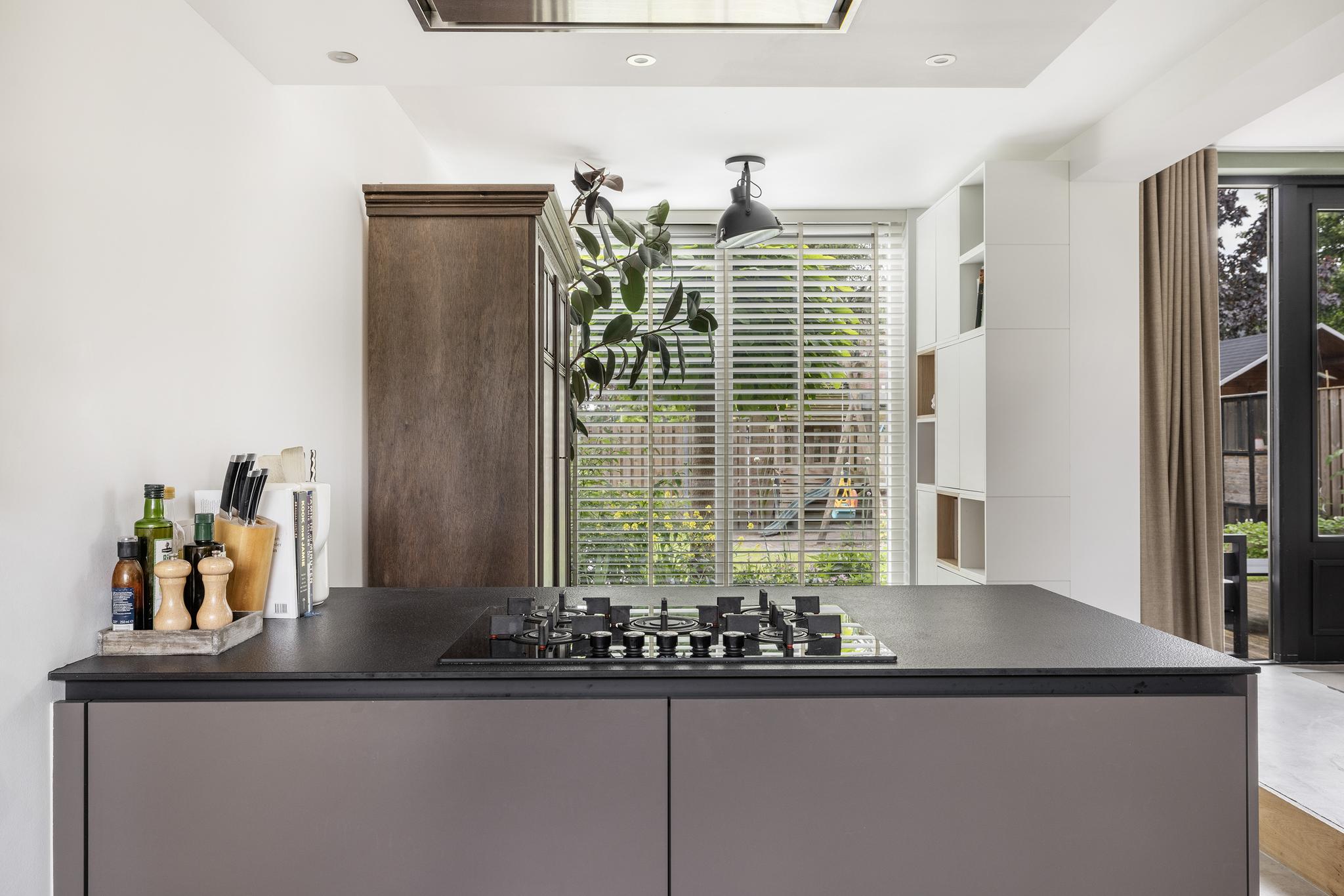 De moderne leefkeuken in de zijuitbouw is van alle gemakken voorzien! De keuken in hoekopstelling met ruim (schier)kookeiland is in 2018 geplaatst en beschikt over een 5 pit gaskookplaat, afzuigkap, koelkast, stoomoven, vaatwasser, boiler en veel kastruimte. Tevens is een voorbereiding voor elektrisch koken aanwezig. Ook deze ruimte is voorzien van de strakke betonpleistervloer met vloerverwarming en stucwerk wandafwerking.