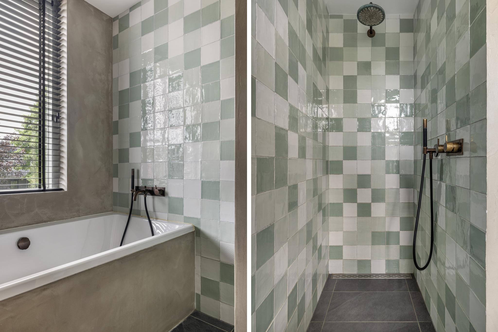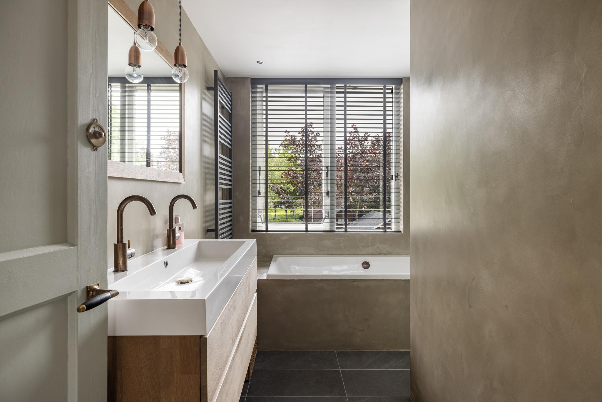 Ook de badkamer is in 2018 aangepakt en het resultaat mag er zeker zijn! Een prachtige moderne badkamer met inloopdouche, ligbad, brede wastafel in meubel met dubbele kranen, toilet, inbouwspots en mechanische ventilatie. De badkamer is deels afgewerkt met beton ciree en met hippe gebakken tegeltjes.