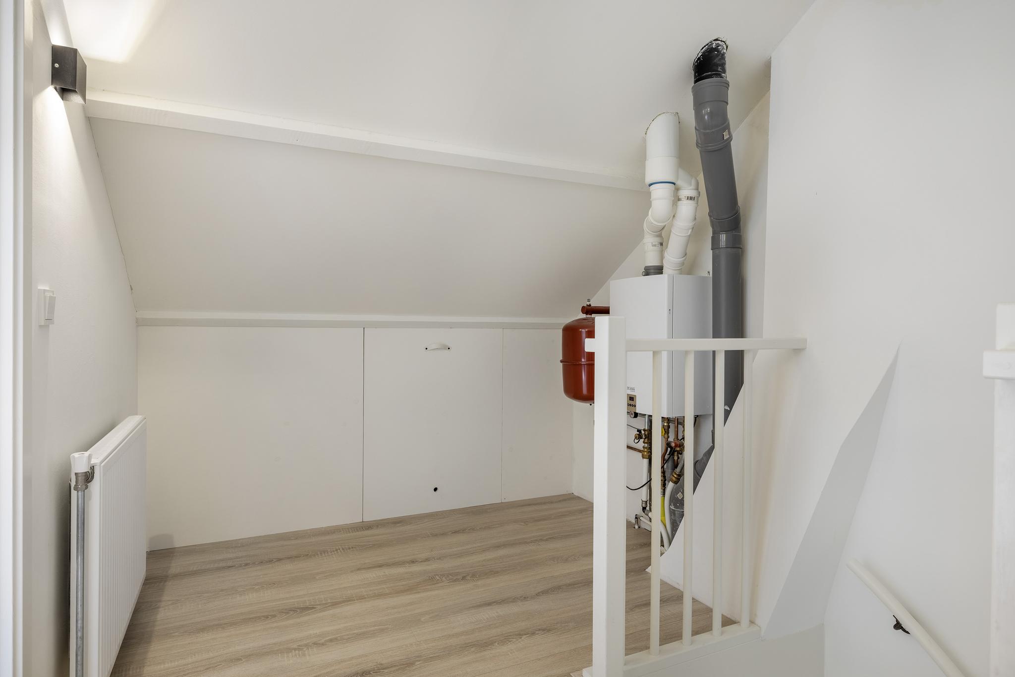 Voorzolder met opstelplaats CV-ketel (Remeha Avanta, 2018) en bergruimte achter het knieschot.