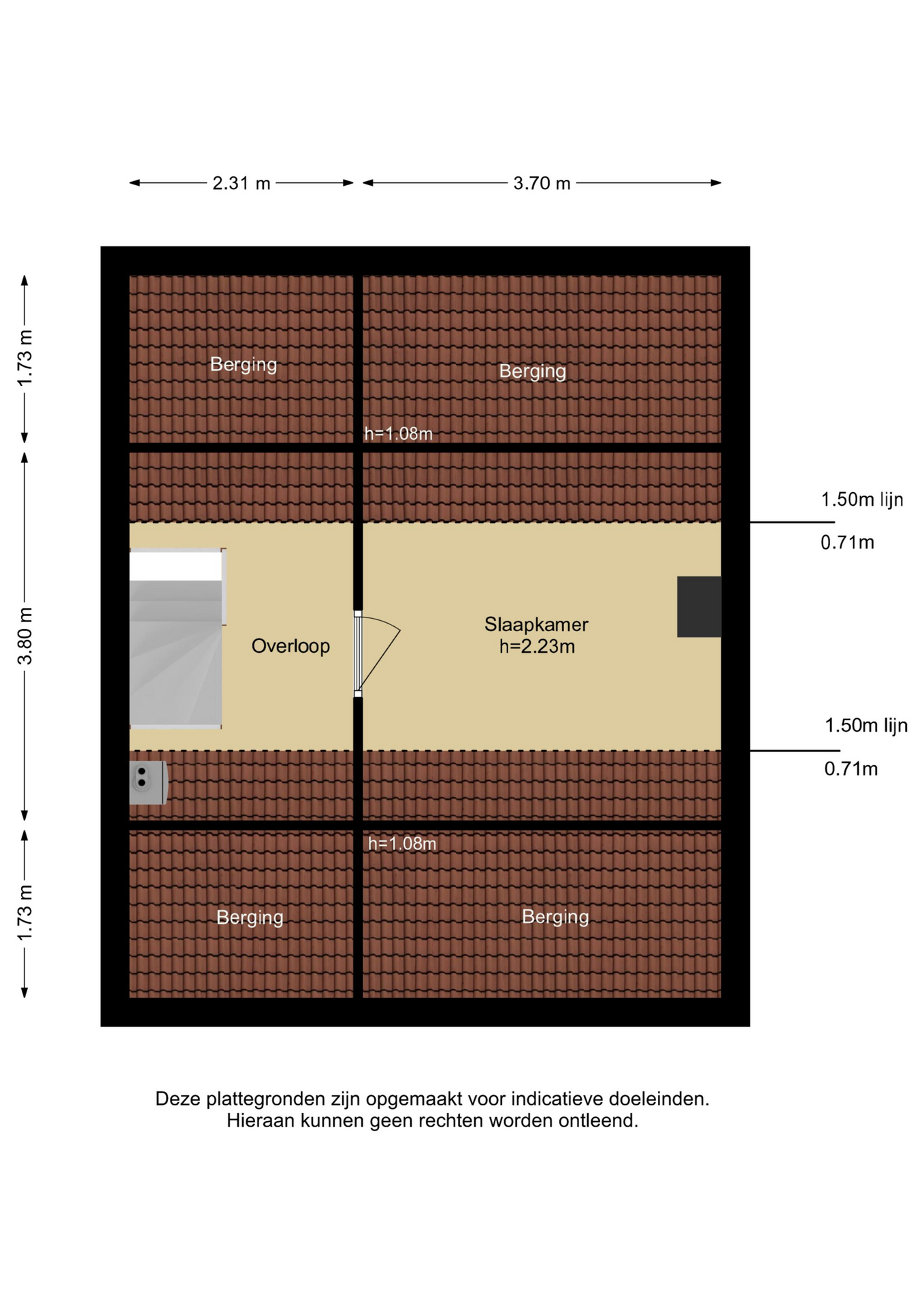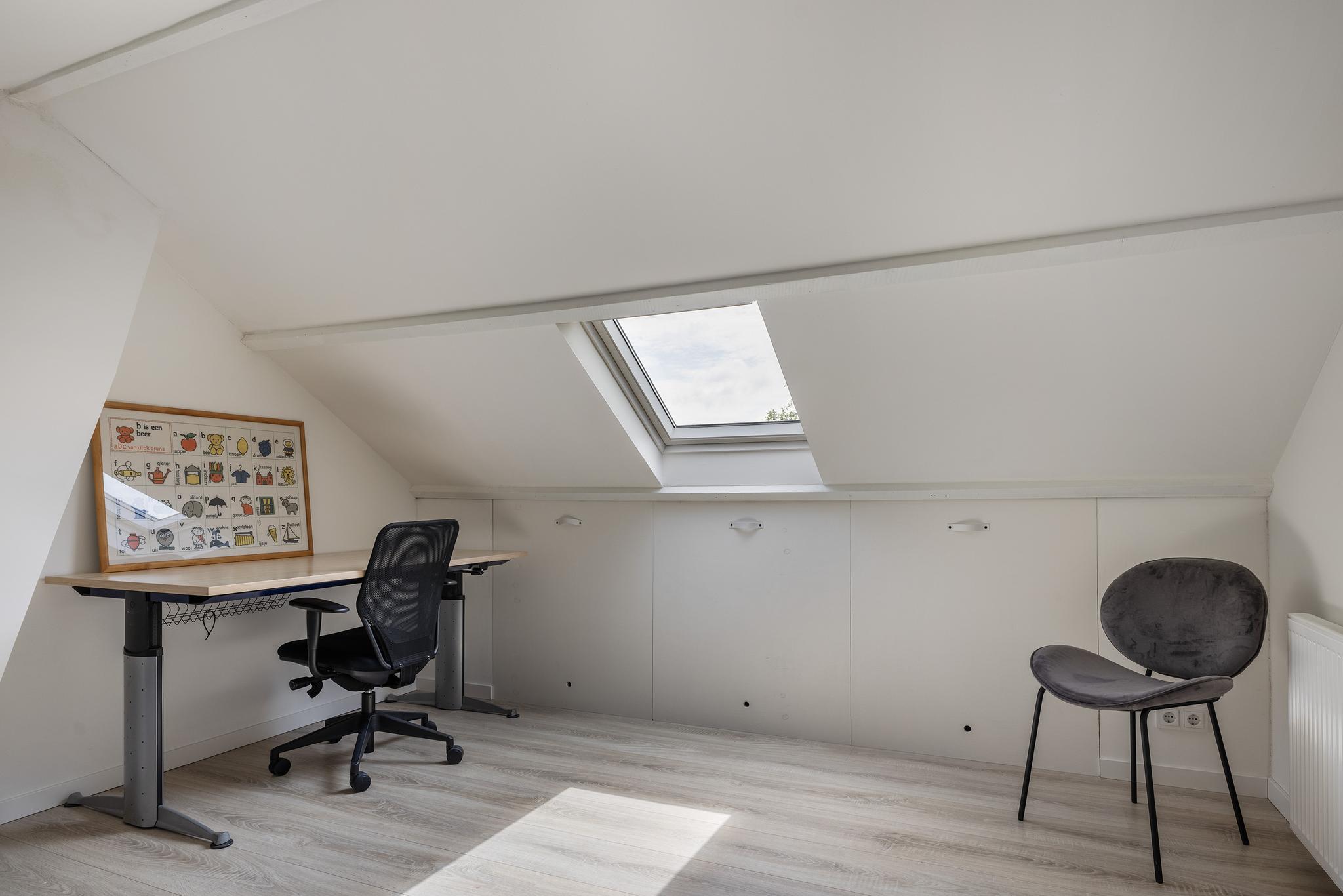 Ruime slaapkamer voorzien van laminaatvloer, dakraam en bergruimte achter het knieschot.