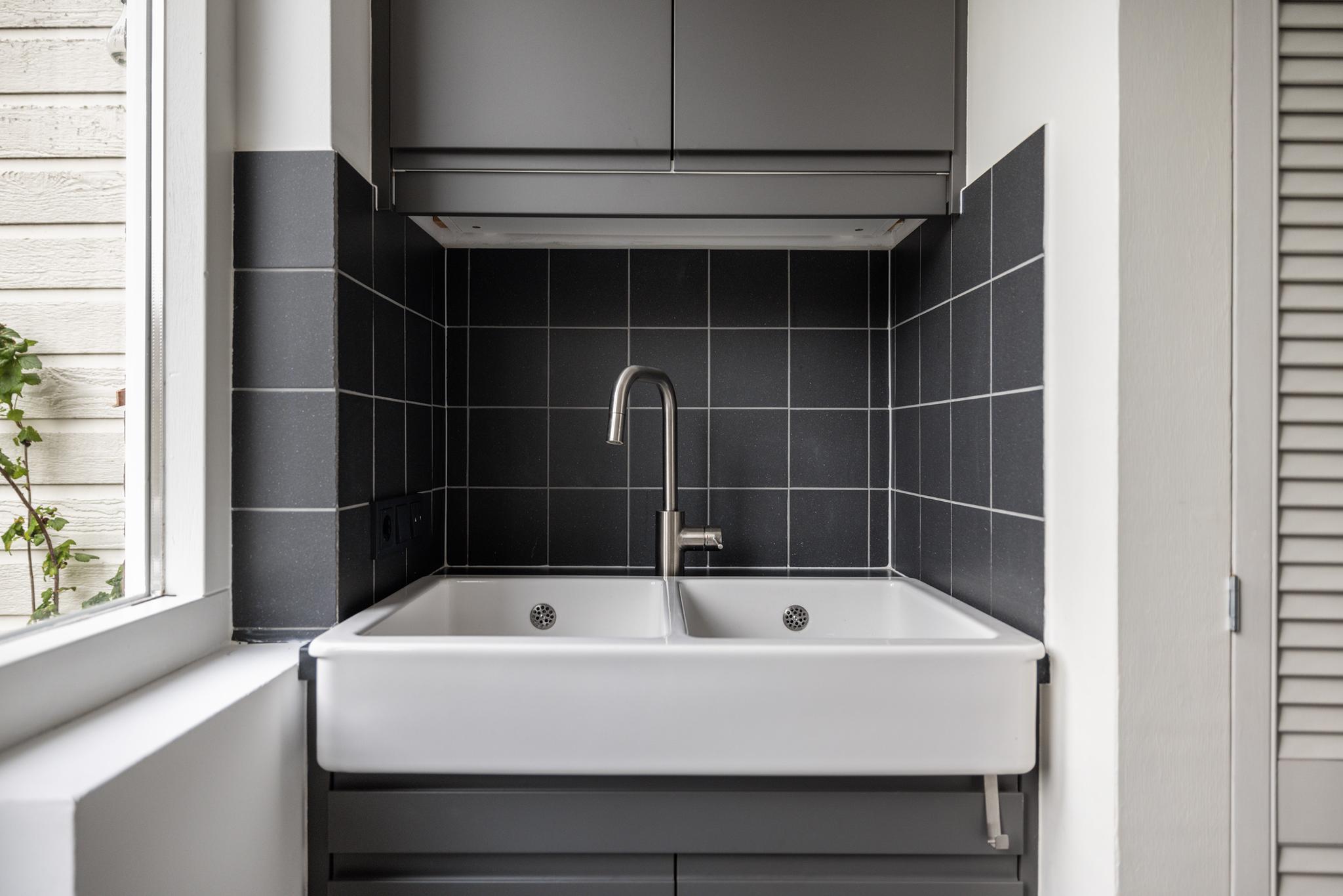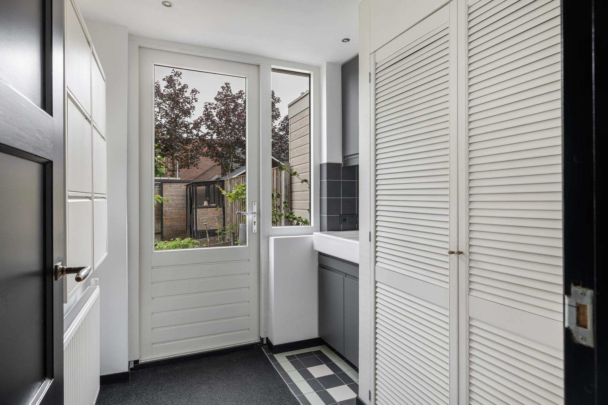 Vanuit de hal is eveneens de bijkeuken aan achterzijde bereikbaar. Ook deze ruimte is keurig netjes afgewerkt, voorzien van vaste kasten met wasaansluiting, een dubbele spoelbak met meubel en een deur naar de achtertuin.
